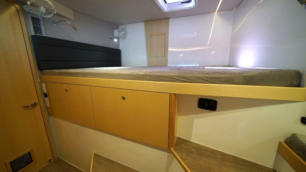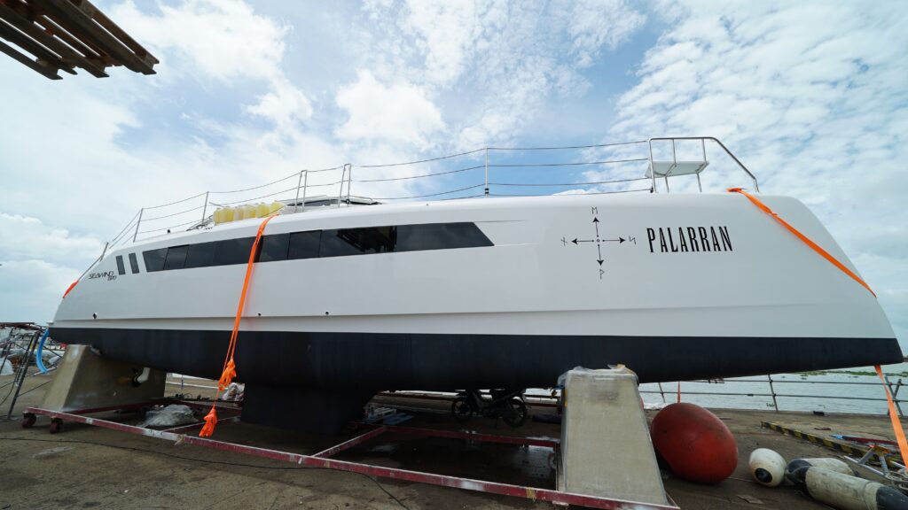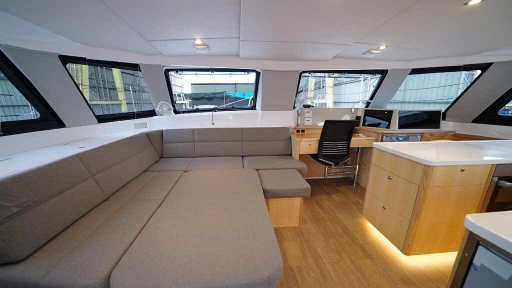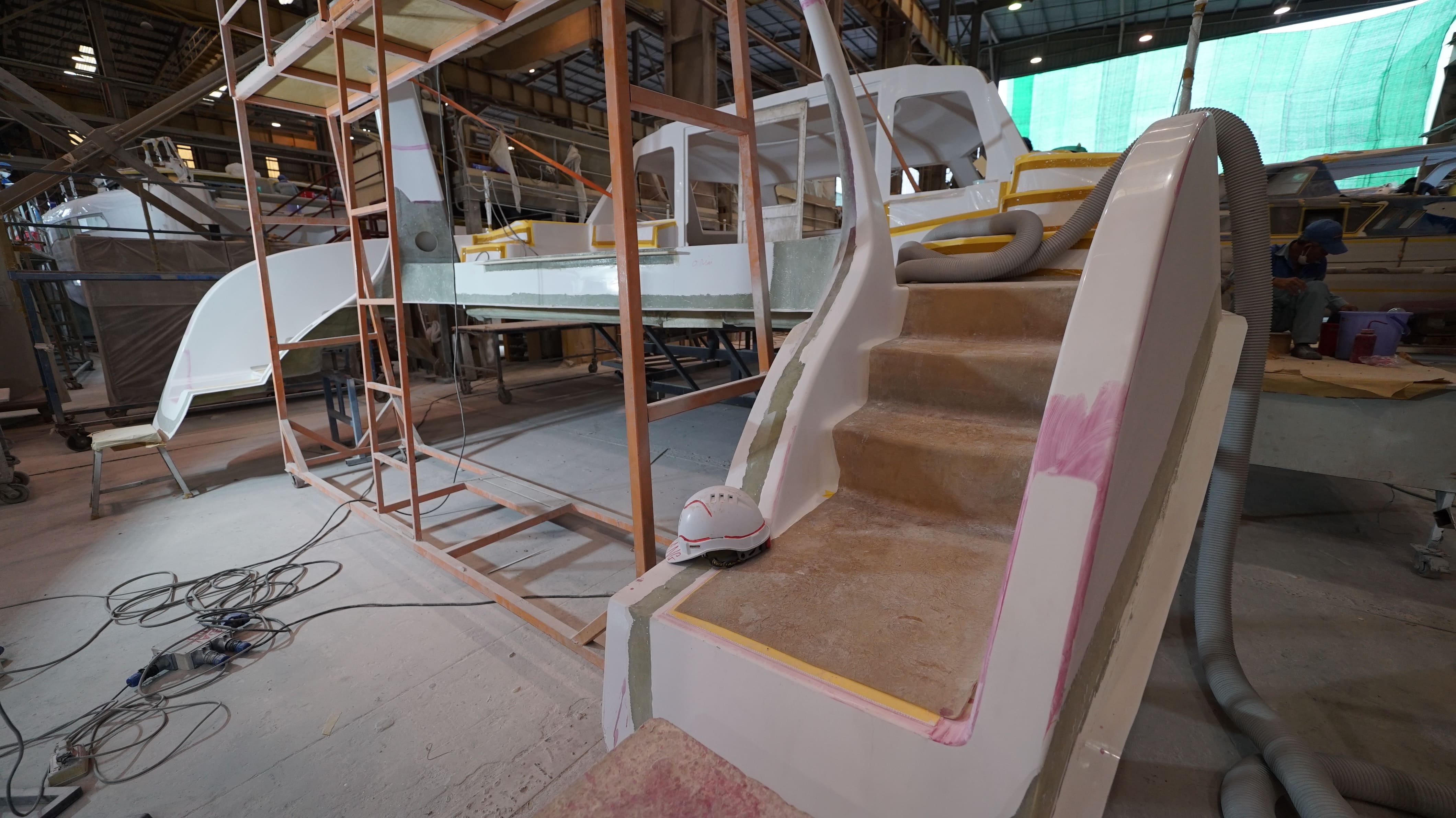 Hull lamination, furniture manufacturing, and the installation of the bulkhead, spider, and omega parts are all finished, along with the forward starboard cabins and center furniture installations.