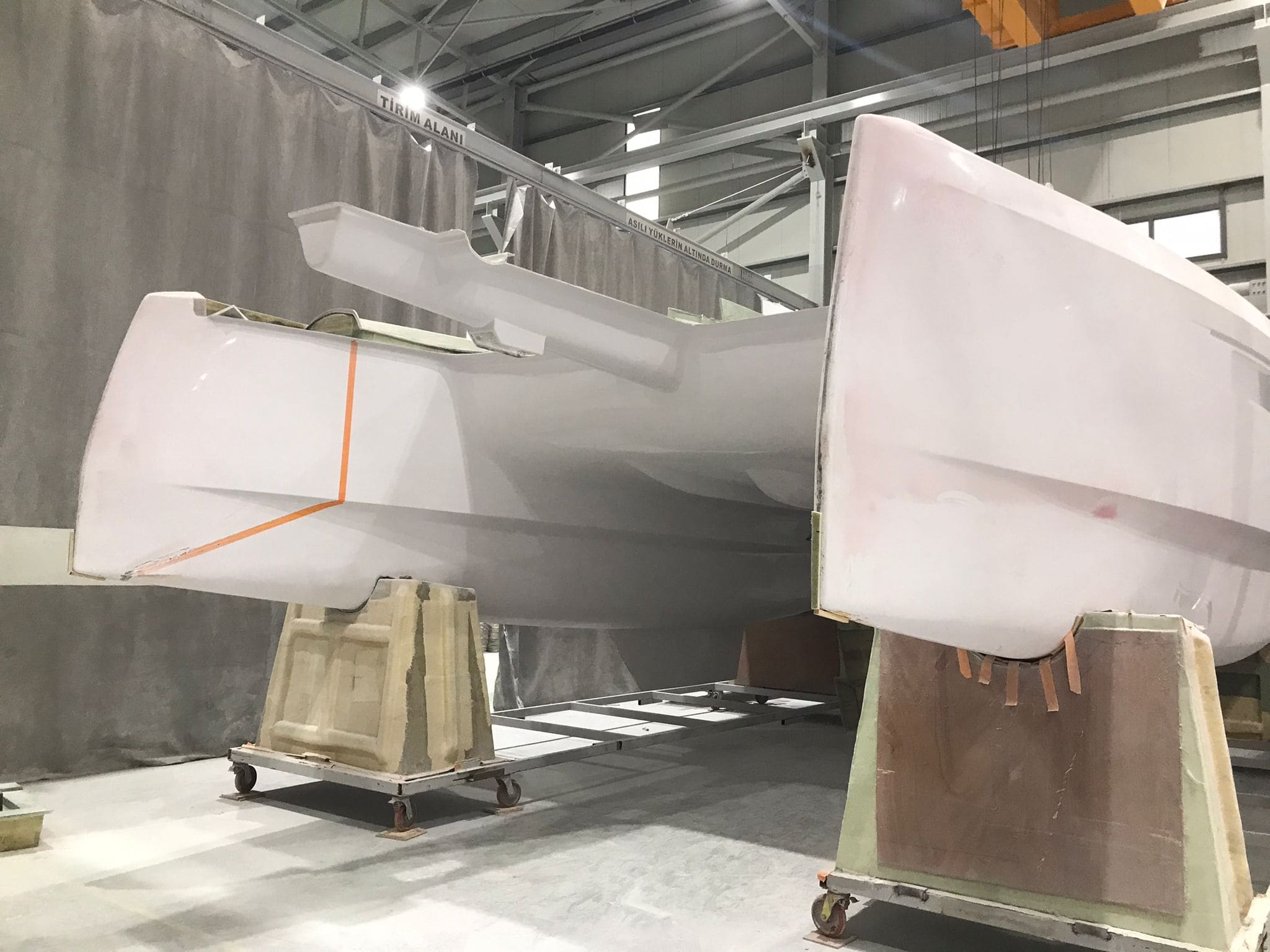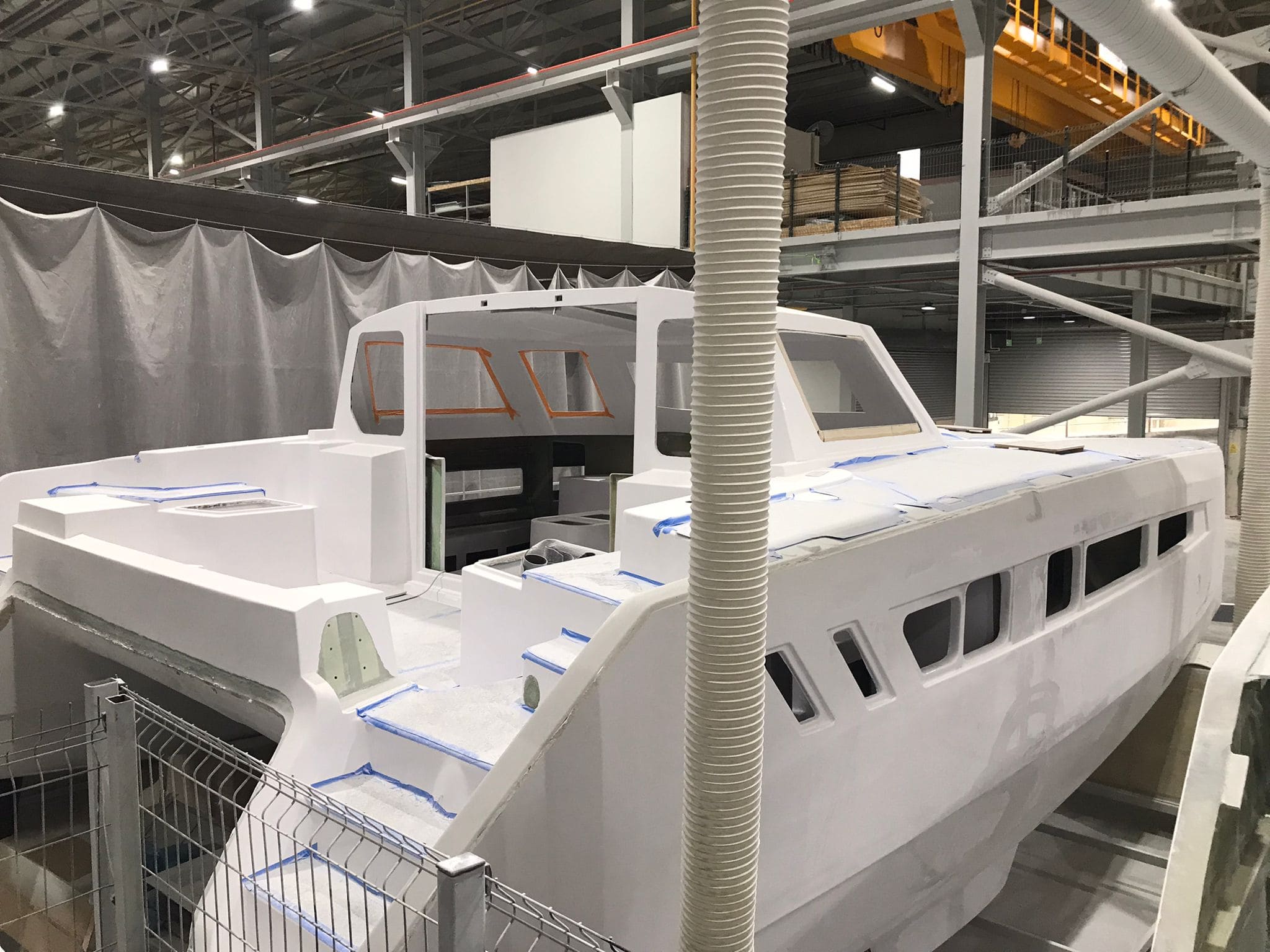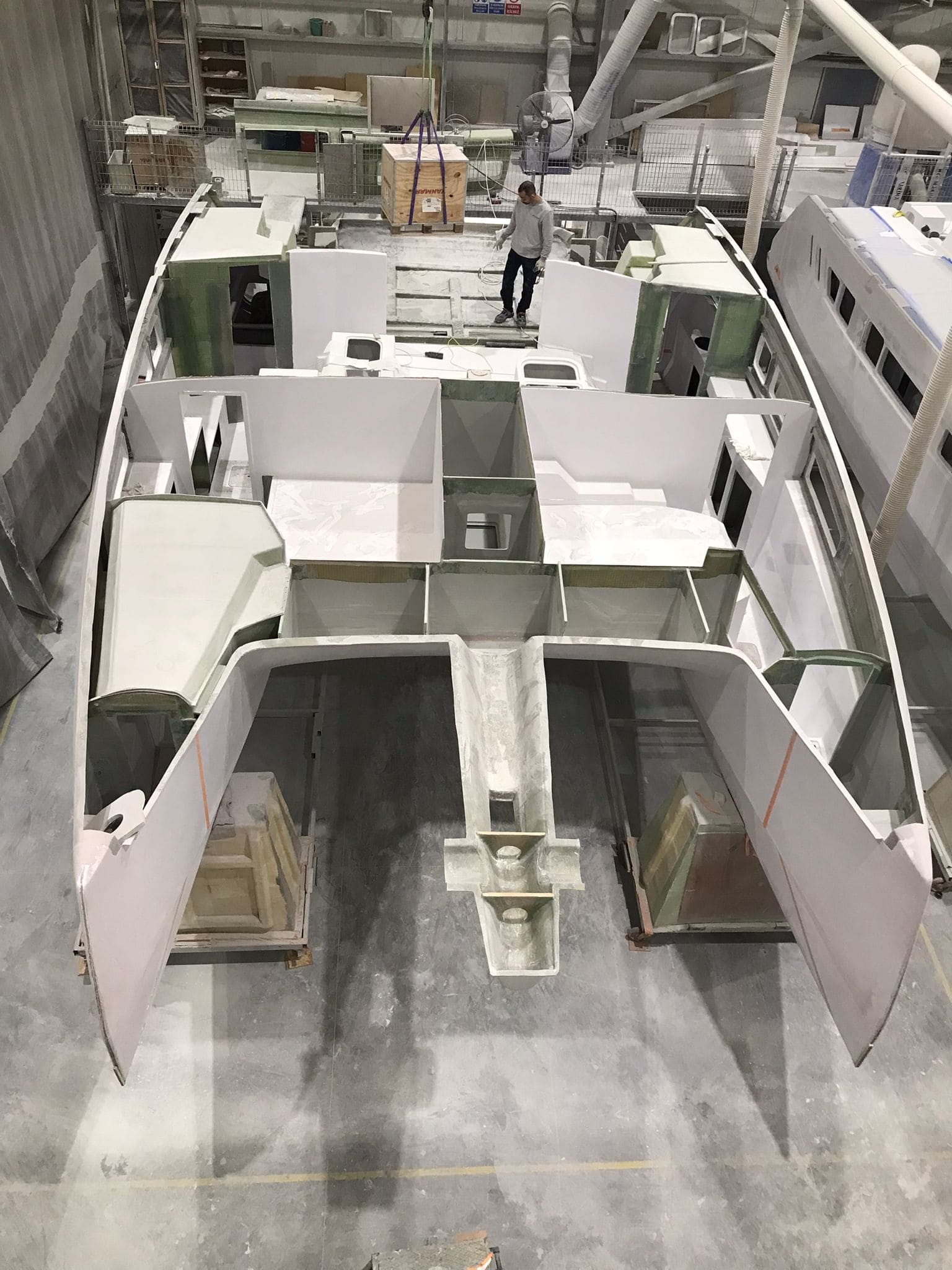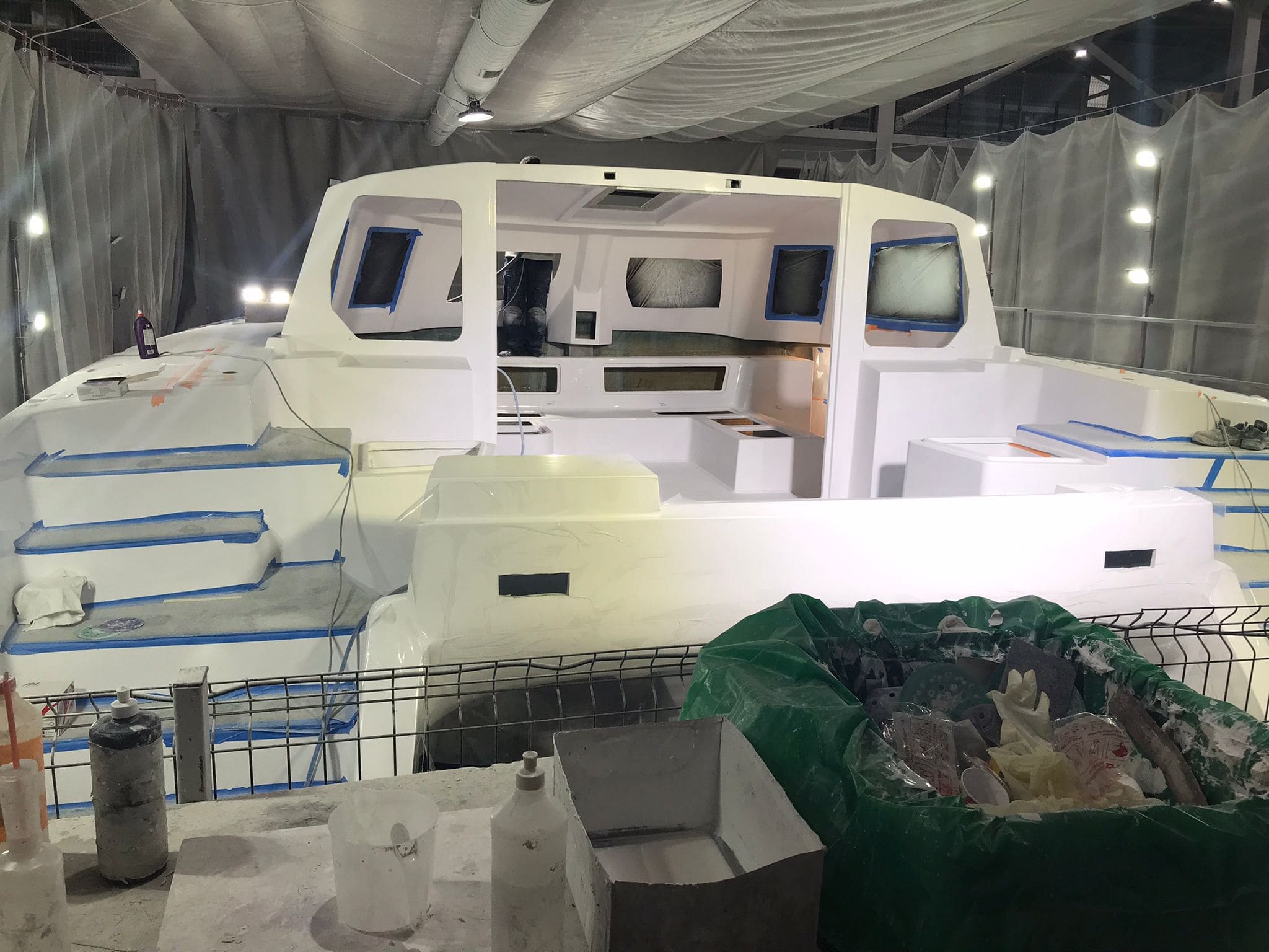 Hull lamination, furniture manufacturing, and the installation of the bulkhead, spider, and omega parts are all finished, along with the forward starboard cabins and center furniture installations.