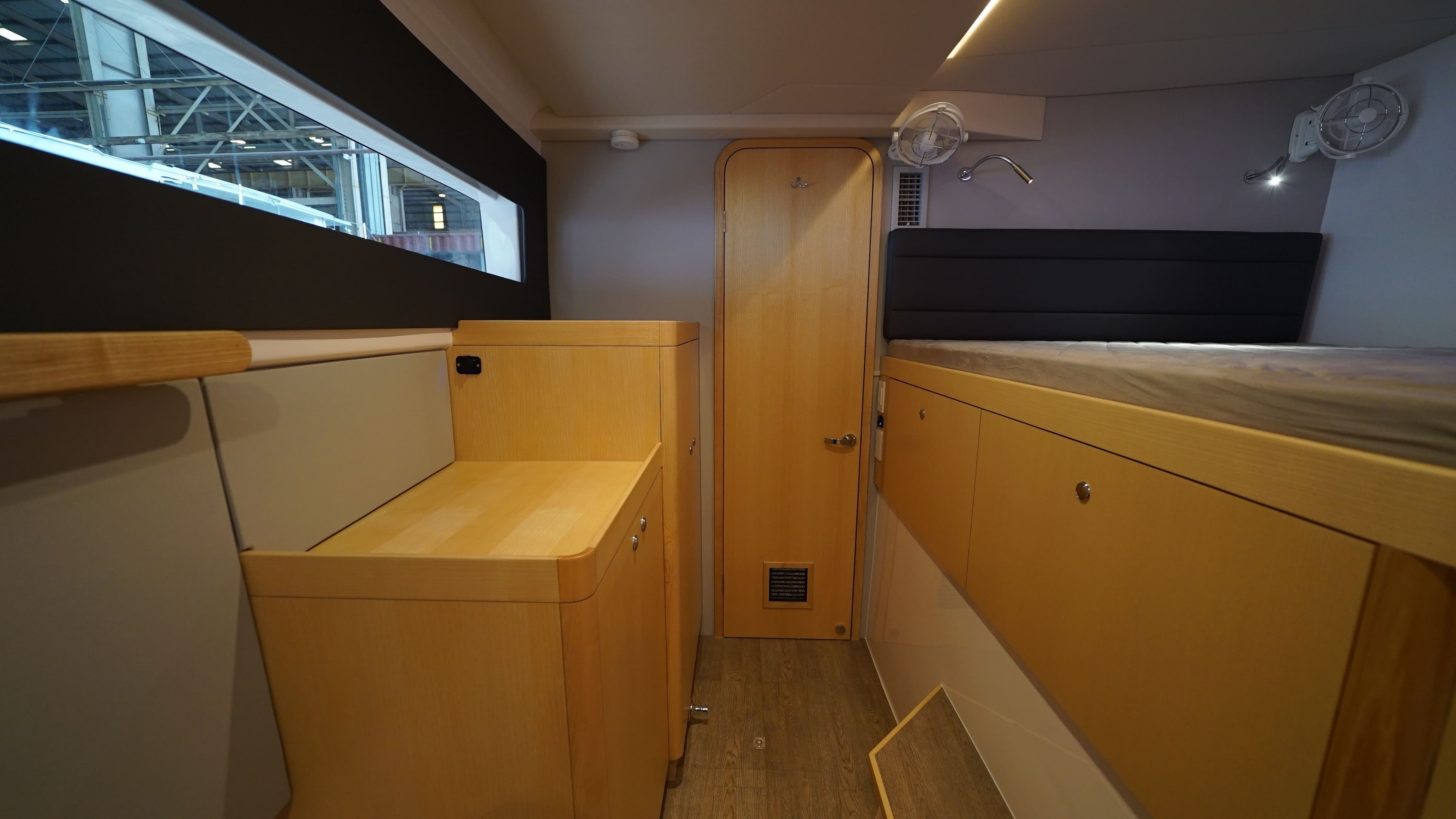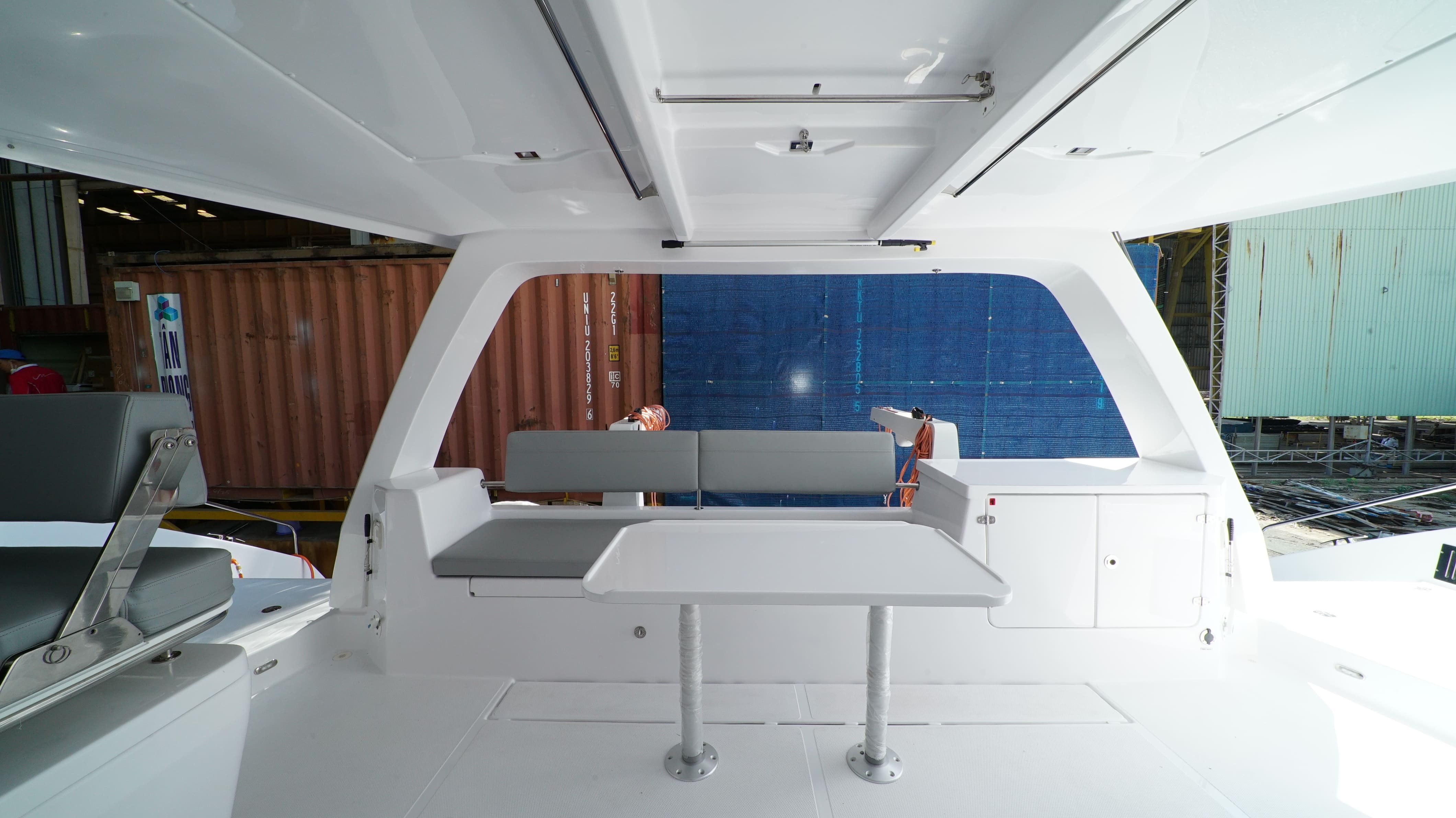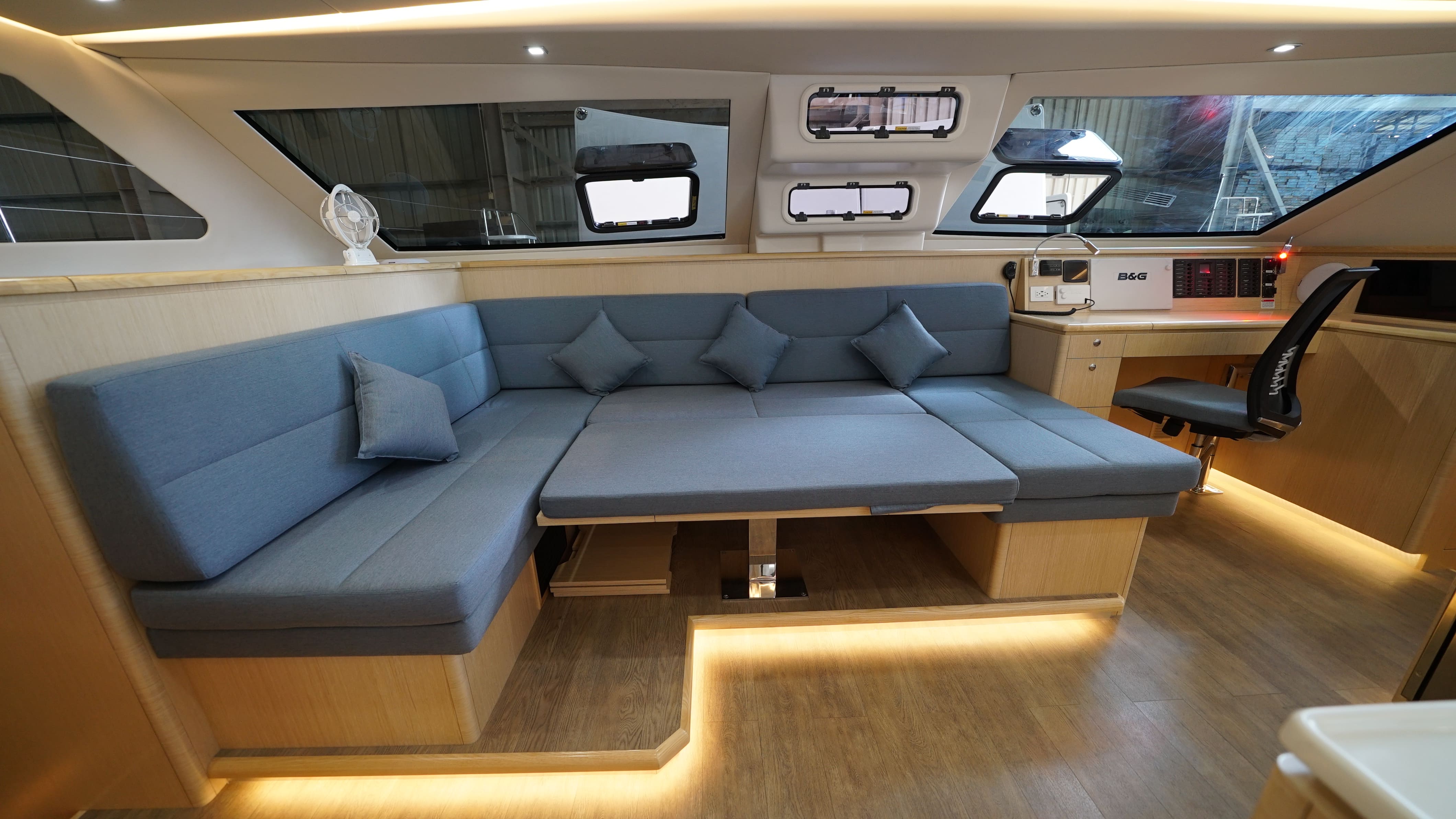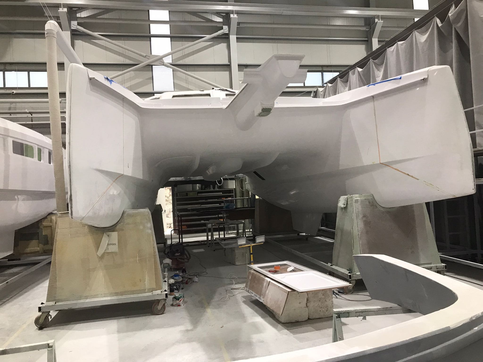 Hull lamination, furniture manufacturing, and the installation of the bulkhead, spider, and omega parts are all finished, along with the forward starboard cabins and center furniture installations.