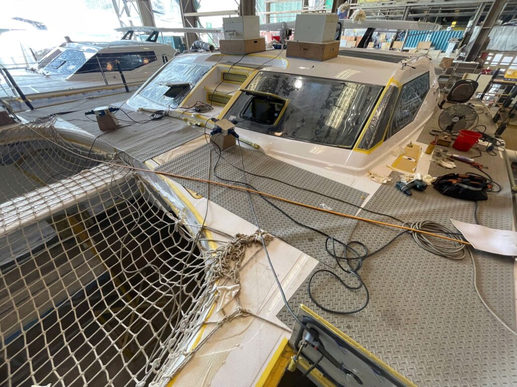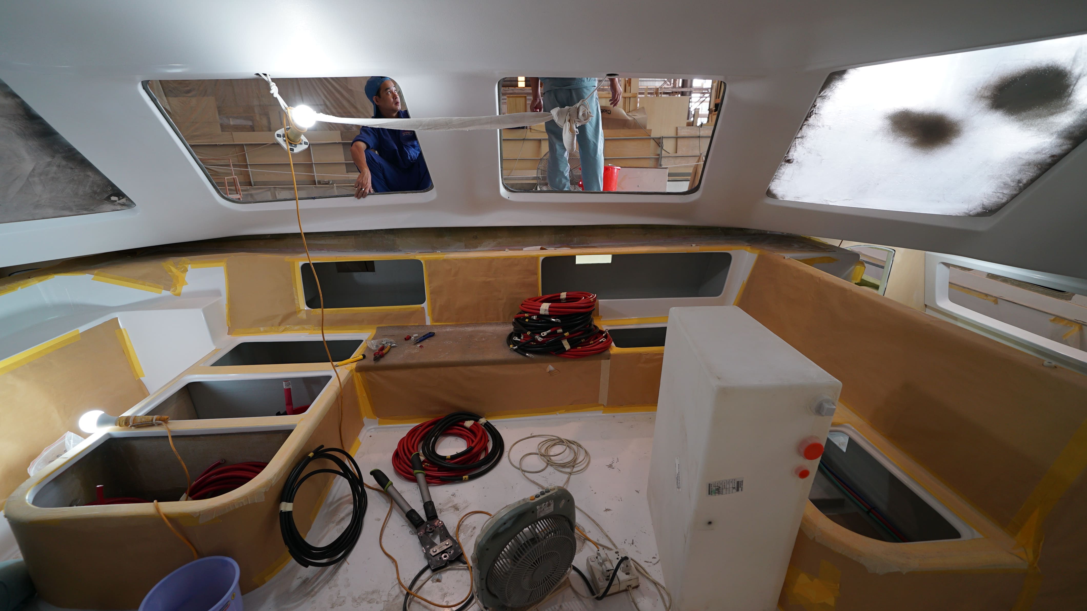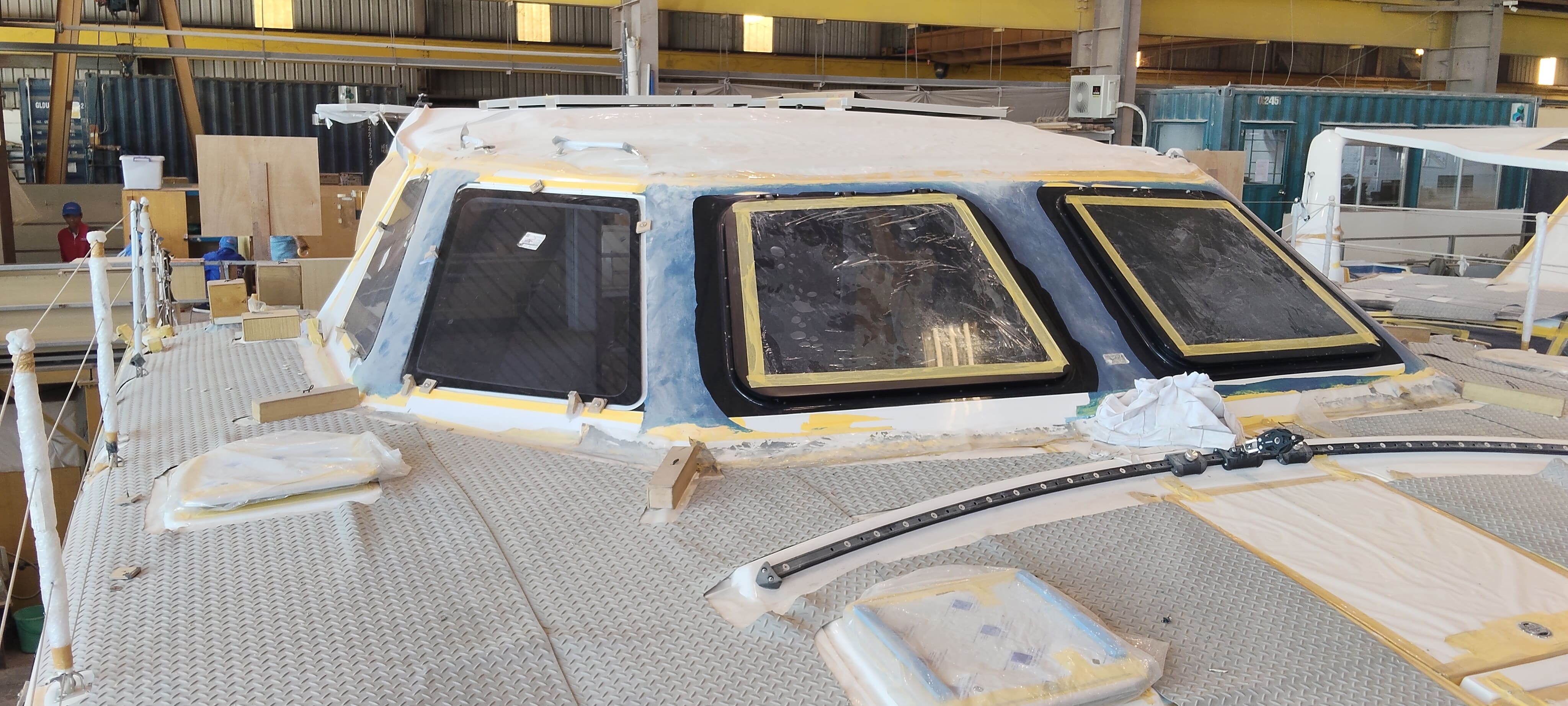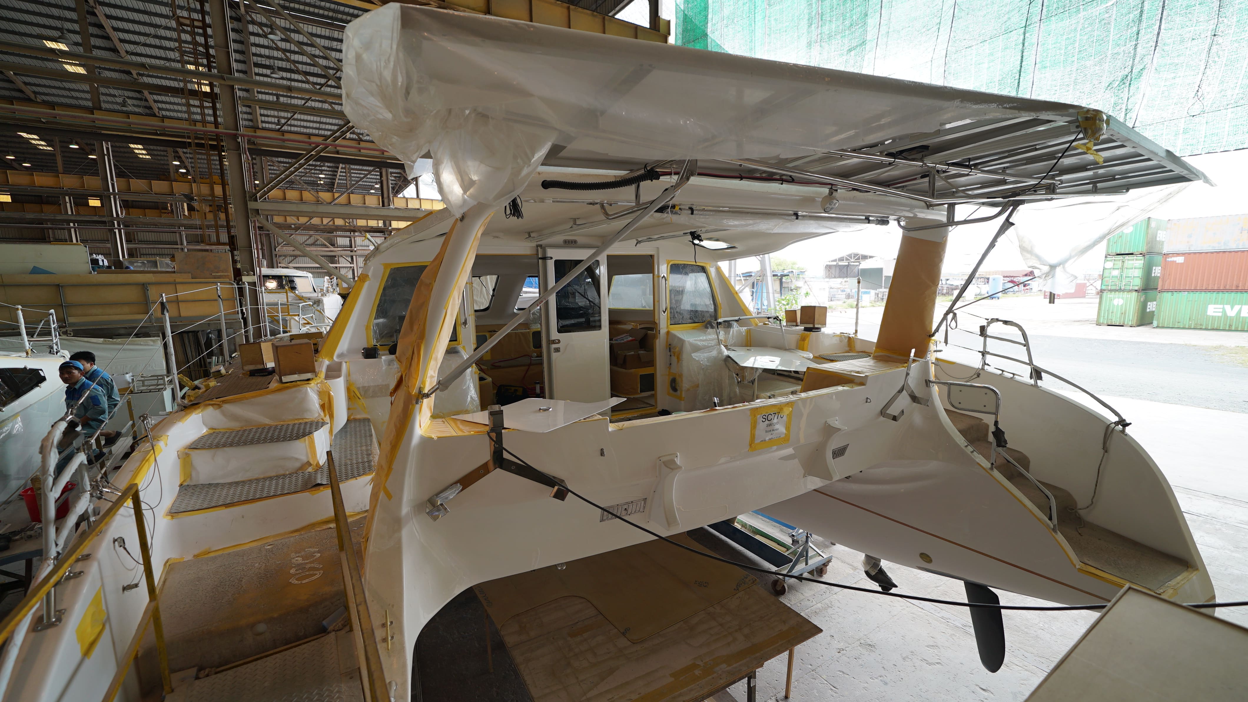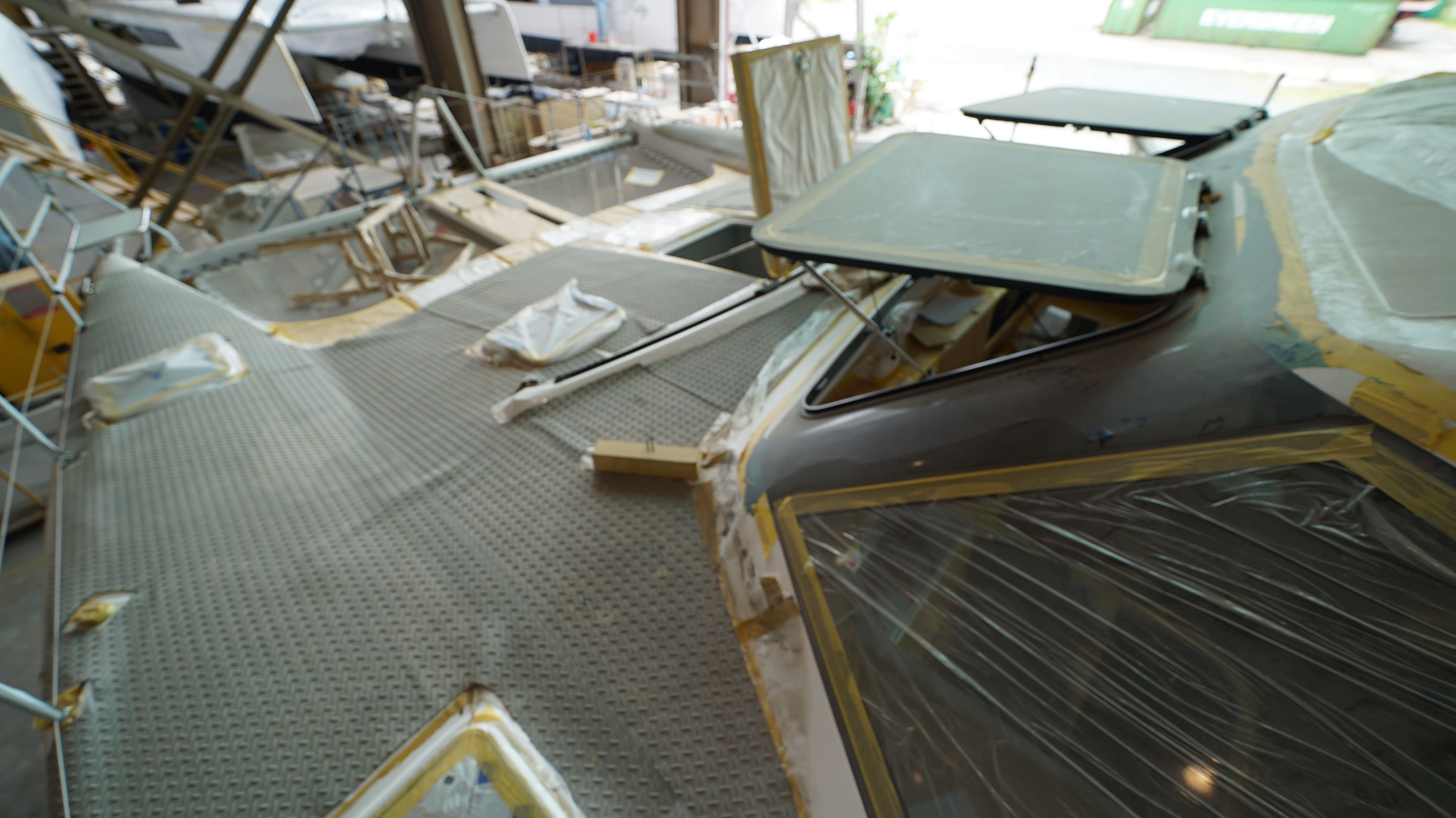 We recently completed the installation of A-frame, stanchion, forward beam, windows and hatches. Our Production team is currently working on trampoline, deck hardware (50%), electric work (30%), plumbing & LPG (30%), steering (30%).