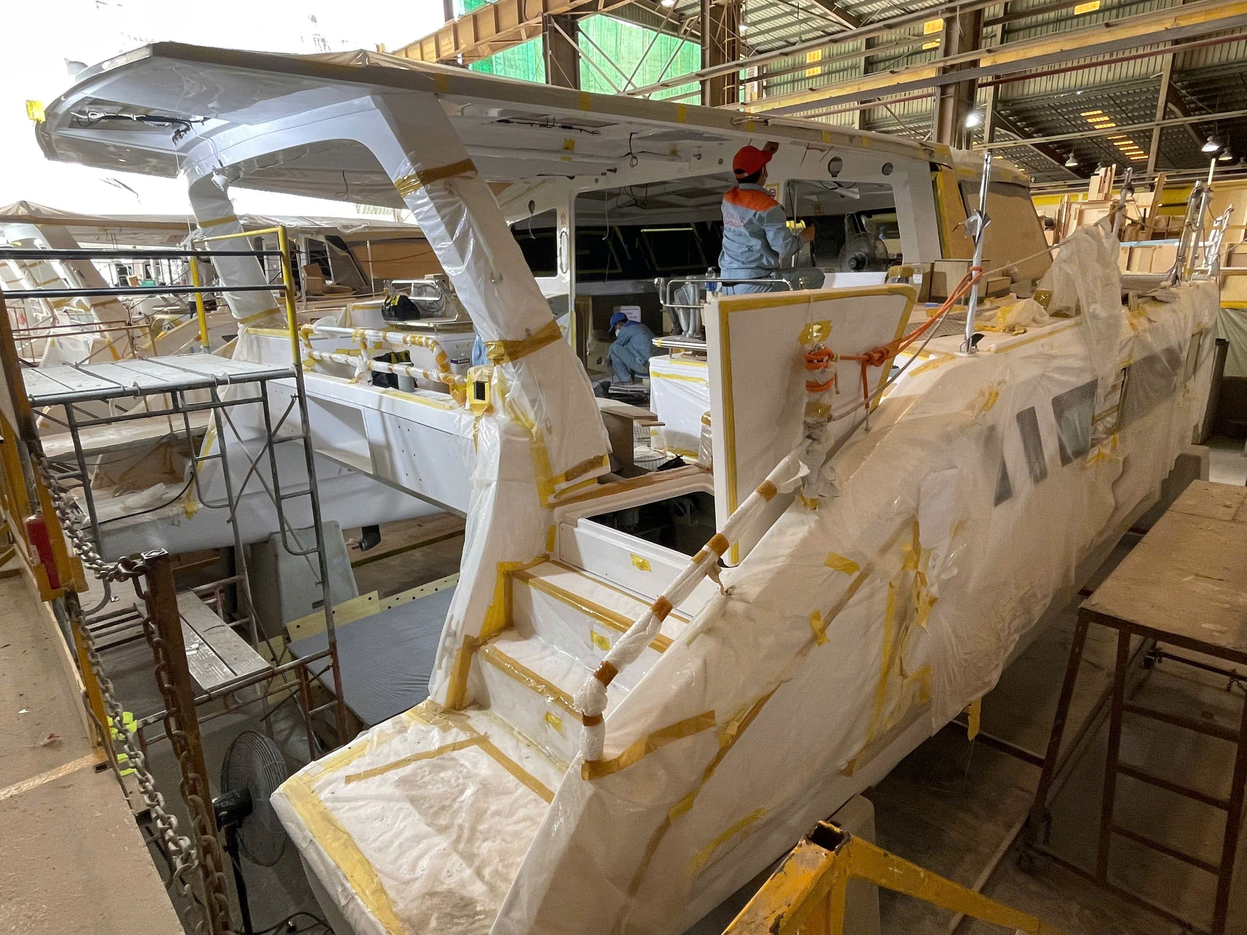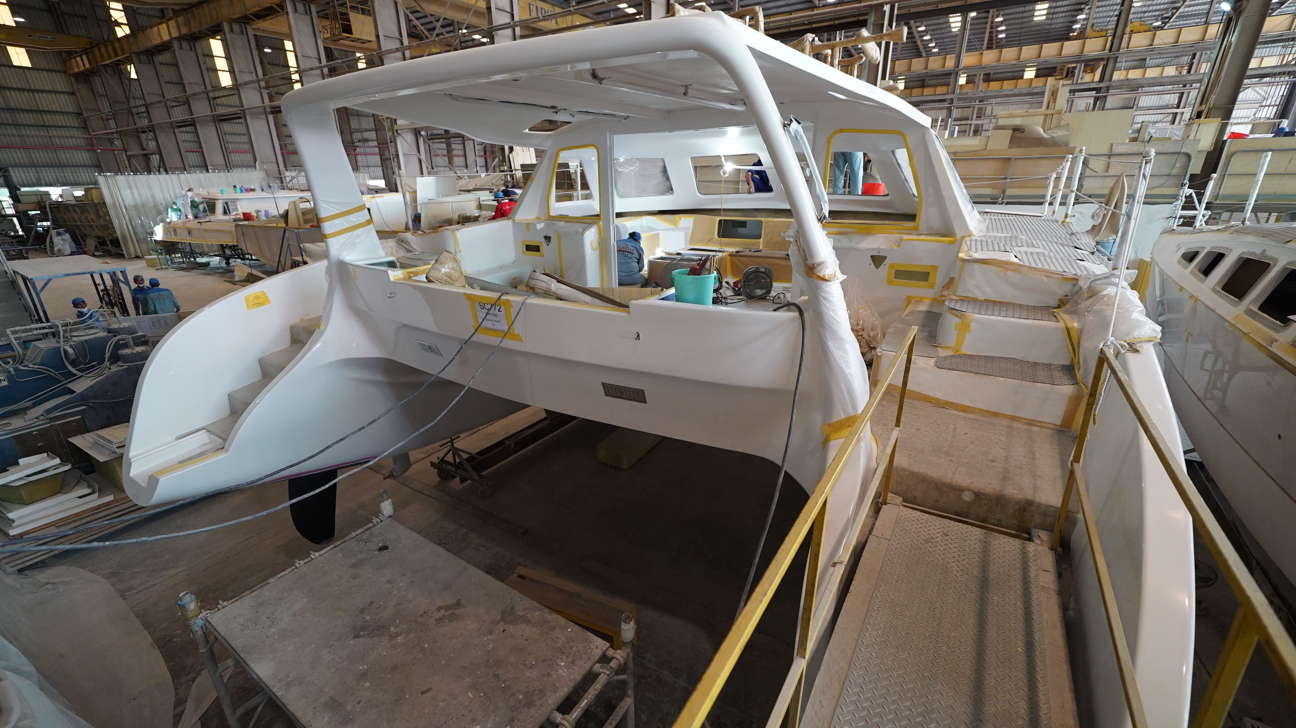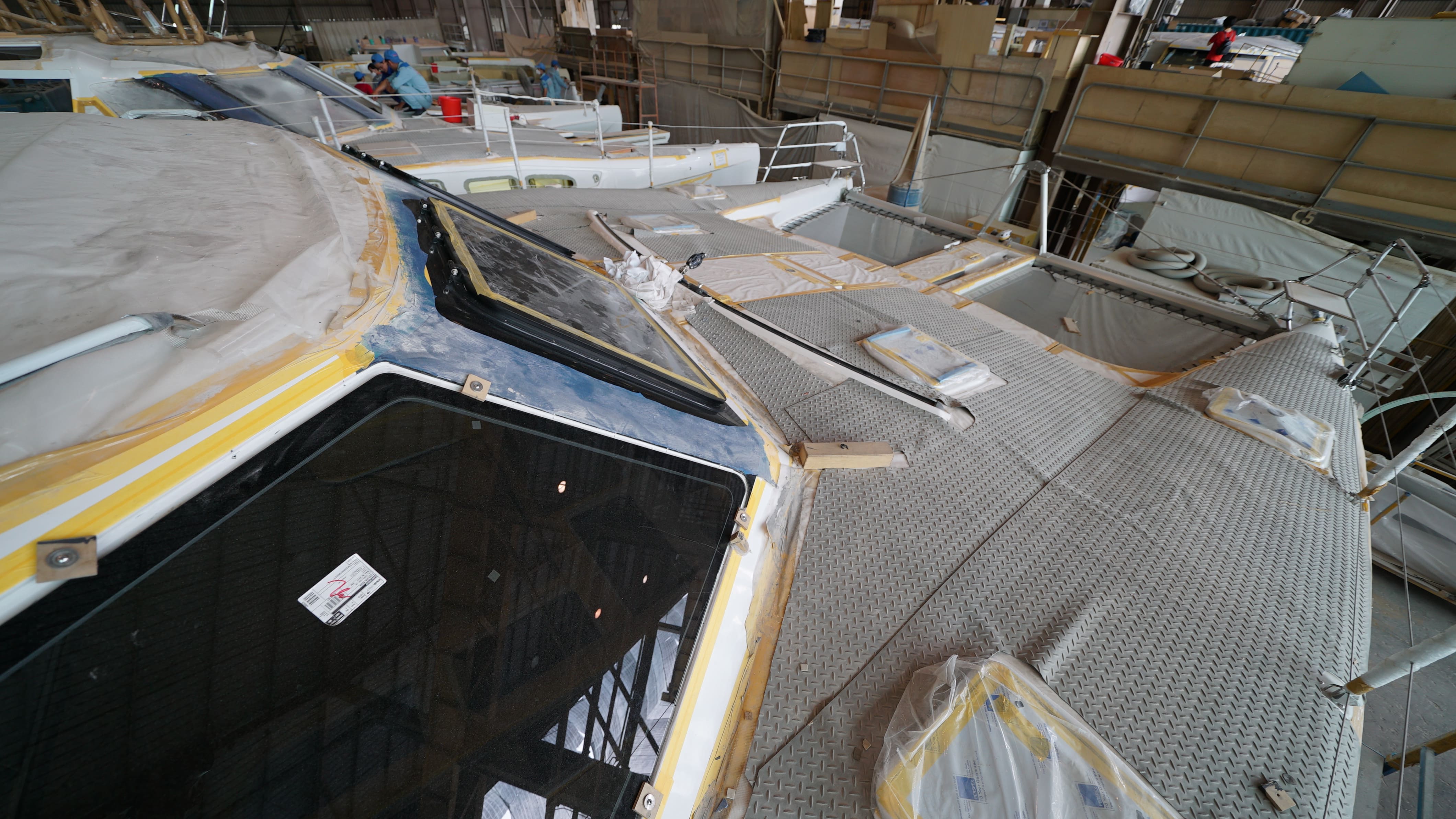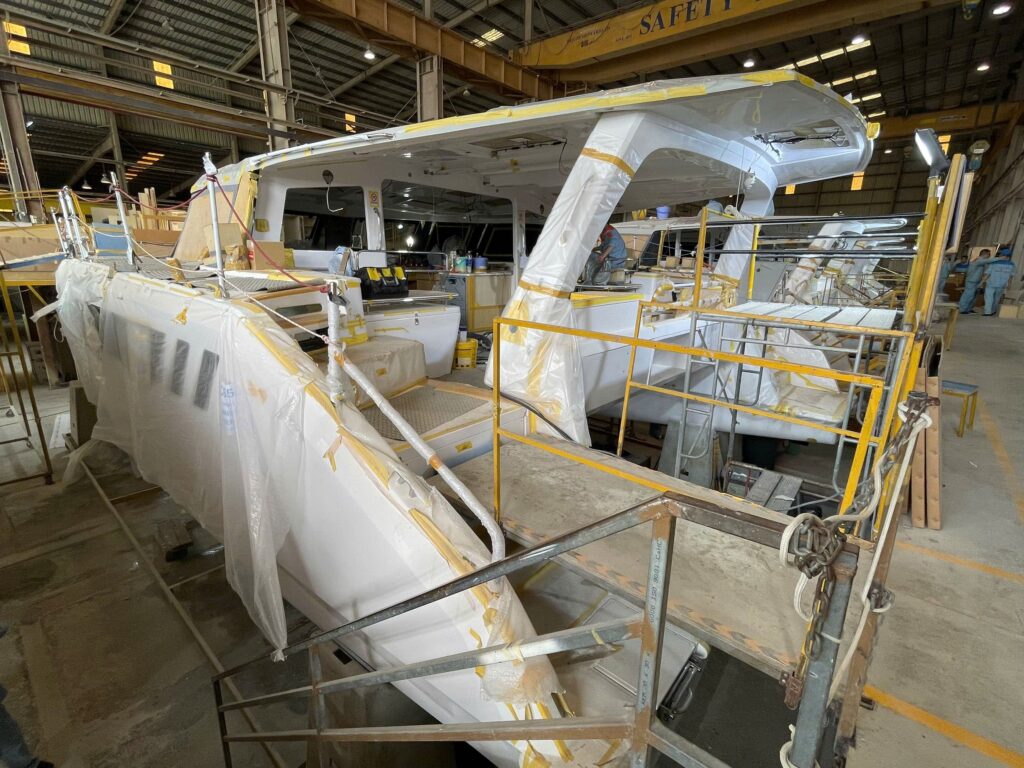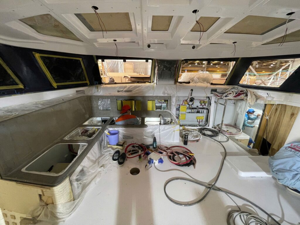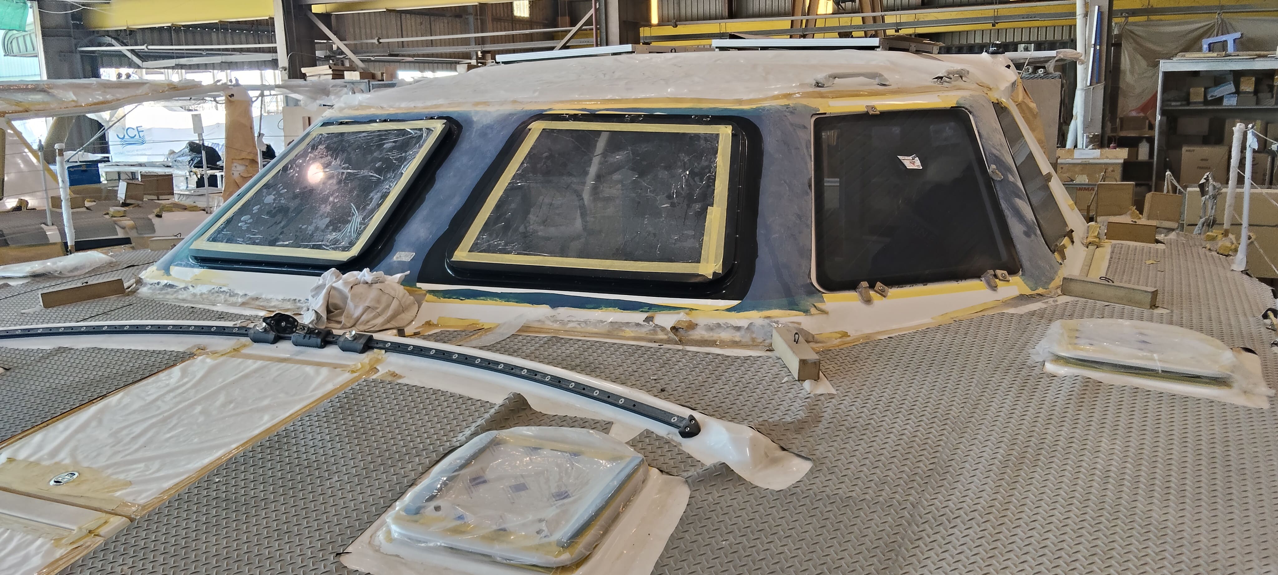 We recently completed the installation of A-frame, stanchion, forward beam, windows and hatches. Our Production team is currently working on trampoline, deck hardware (50%), electric work (30%), plumbing & LPG (30%), steering (30%).