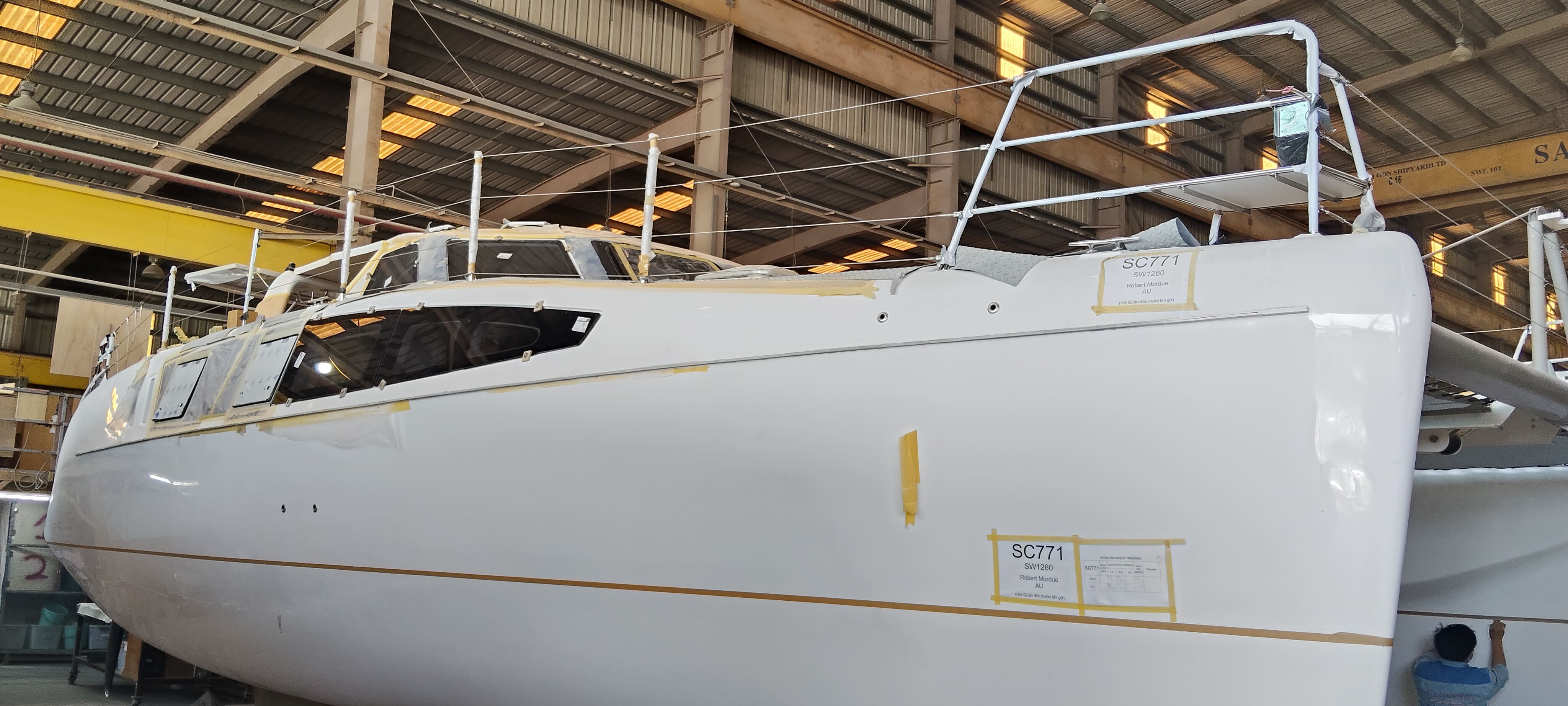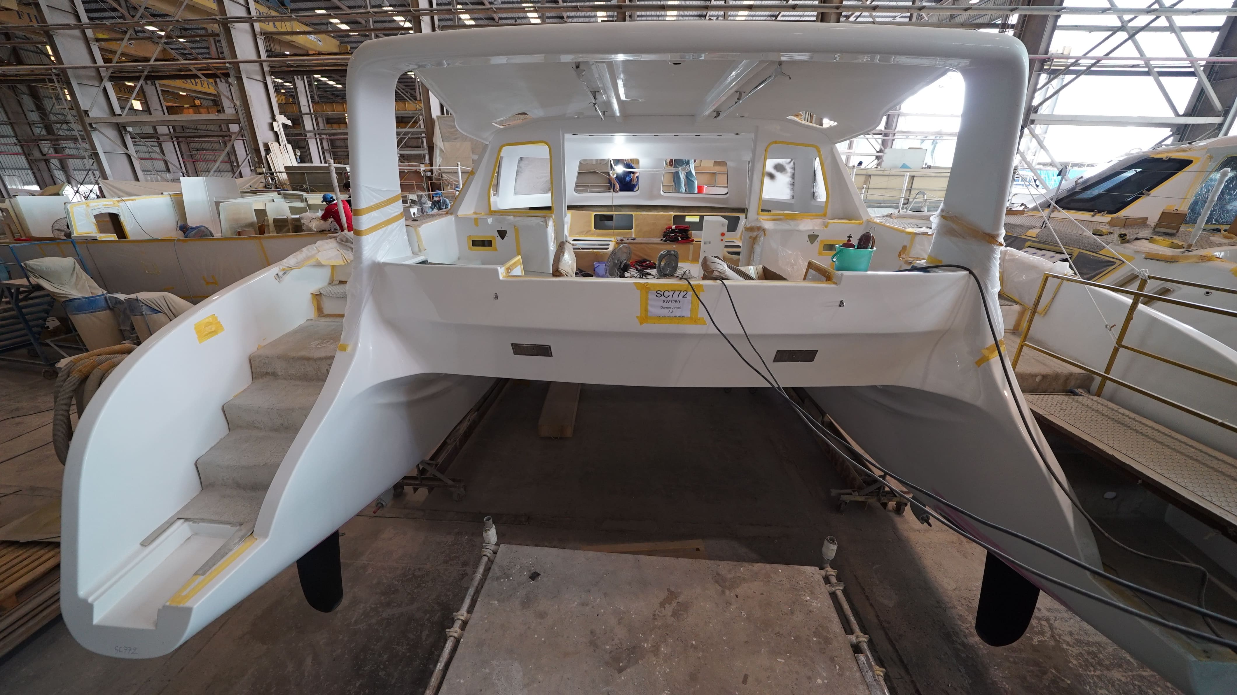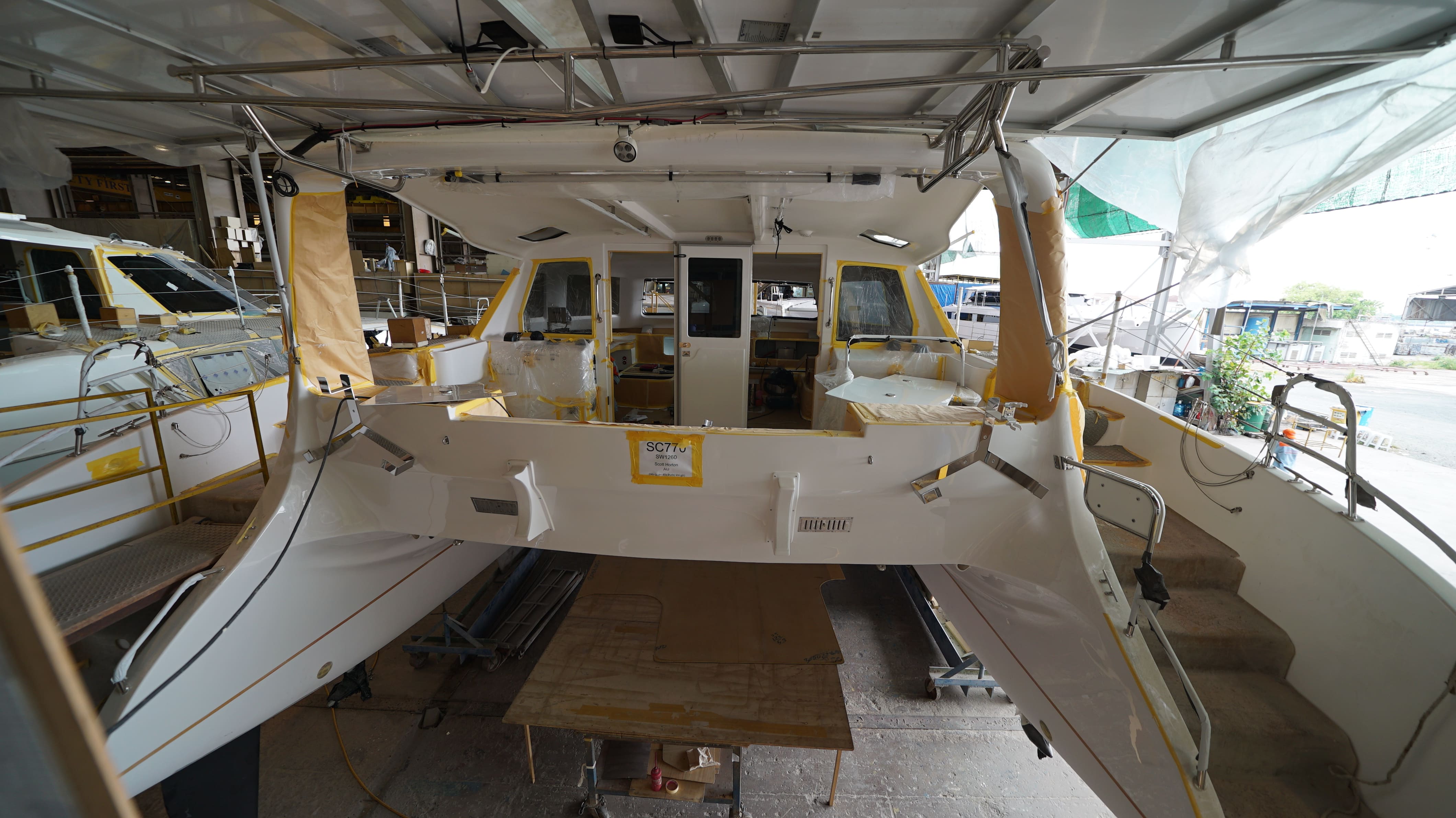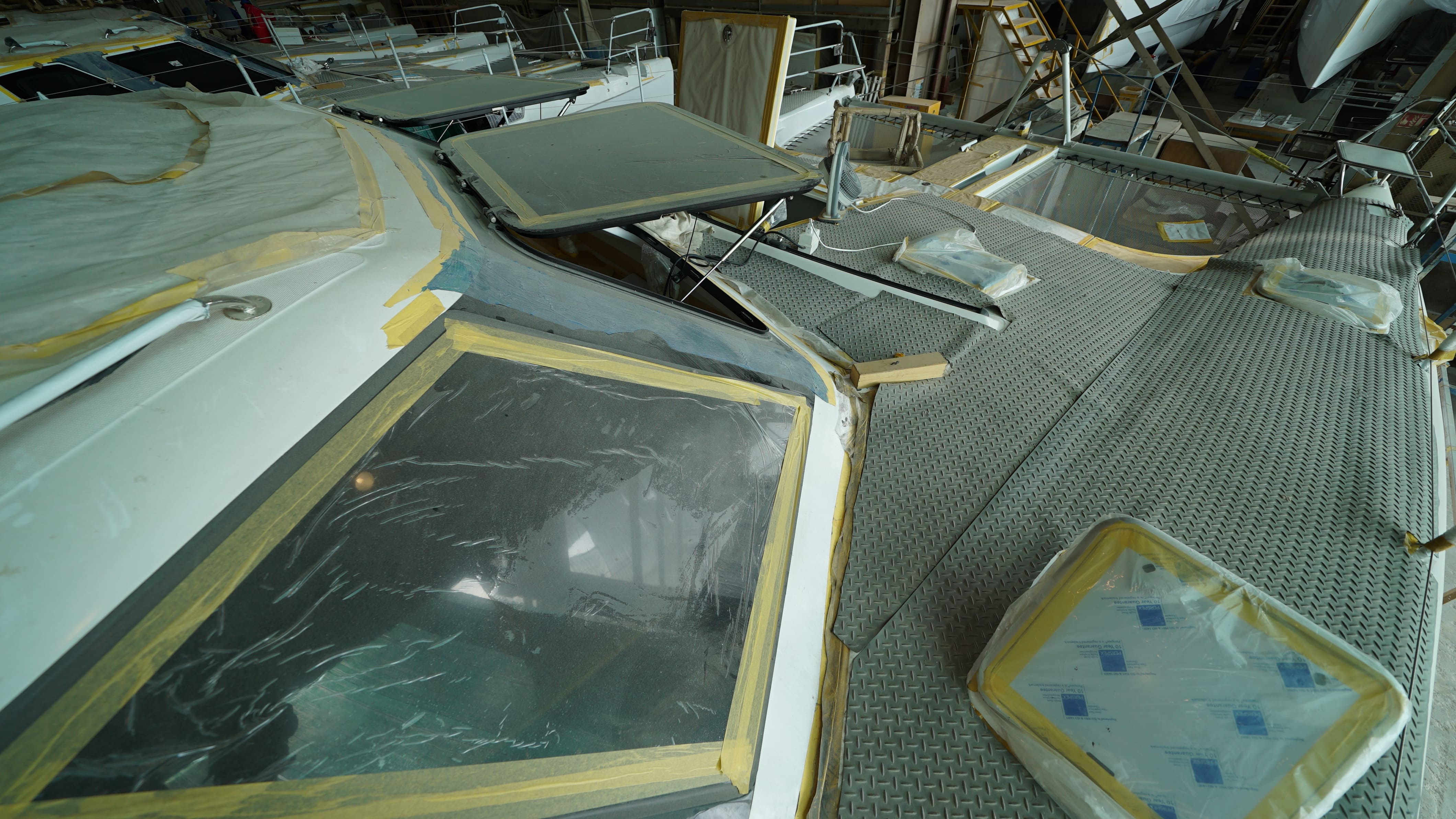 We recently completed the installation of A-frame, stanchion, forward beam, windows and hatches. Our Production team is currently working on trampoline, deck hardware (50%), electric work (30%), plumbing & LPG (30%), steering (30%).