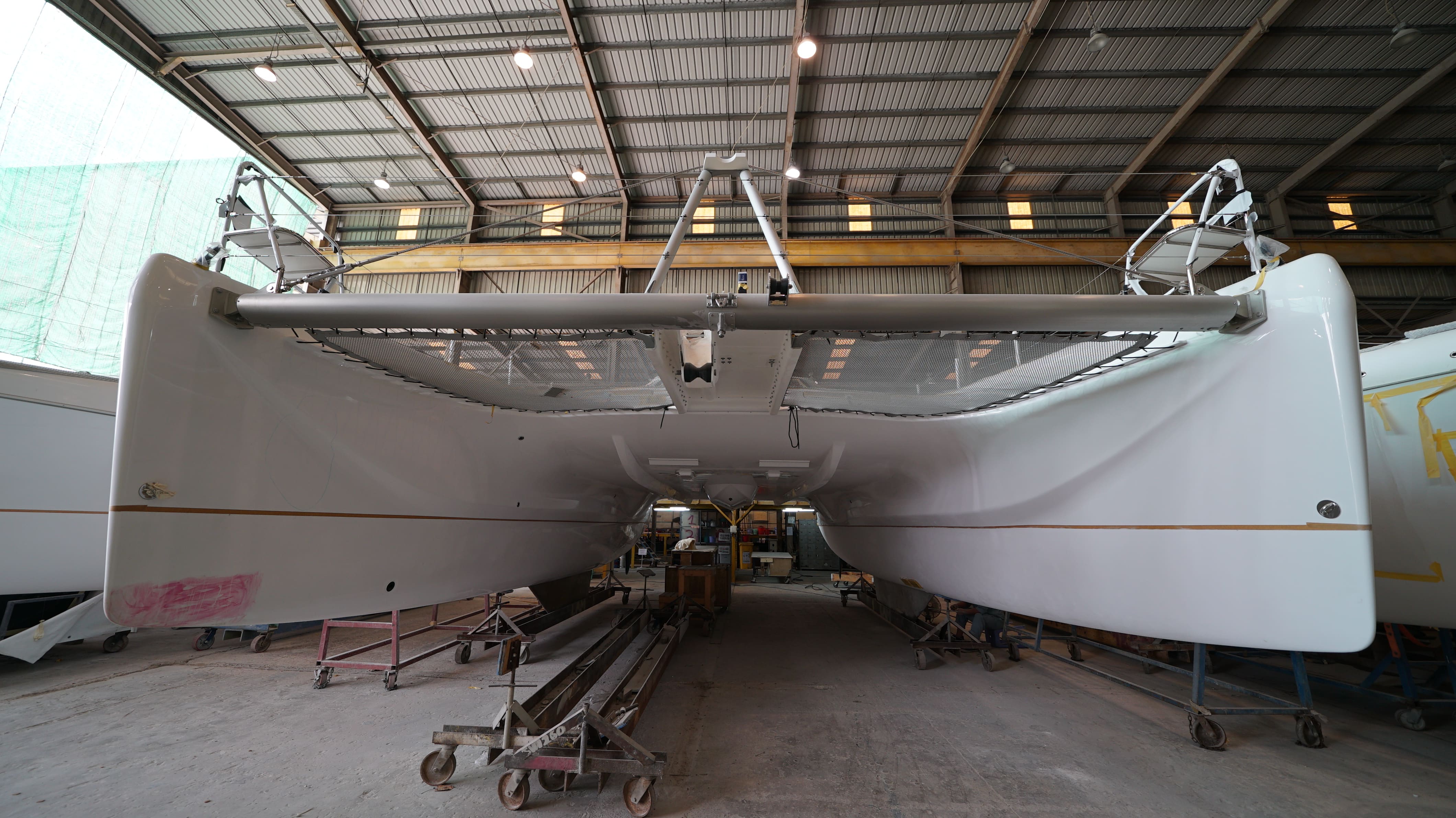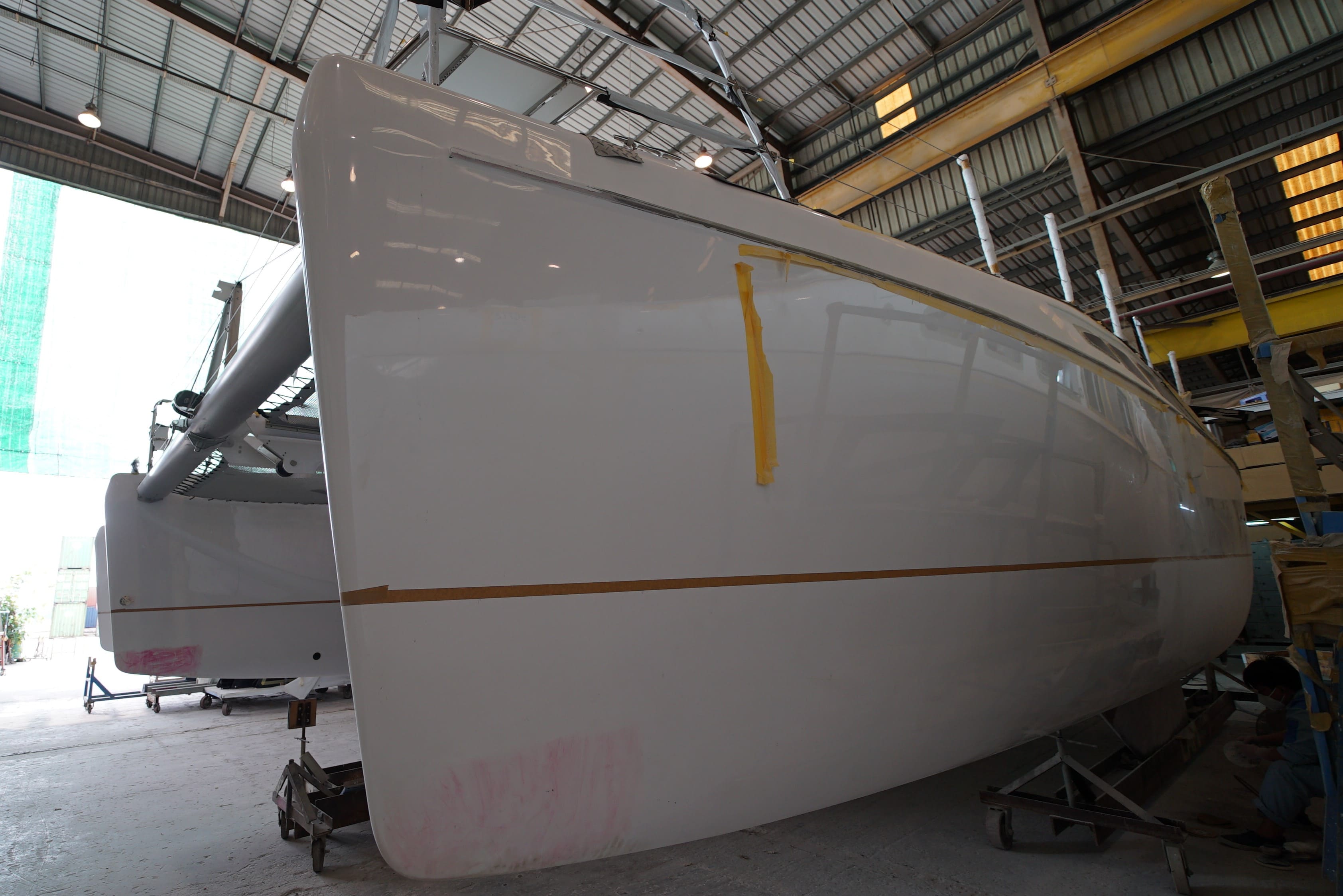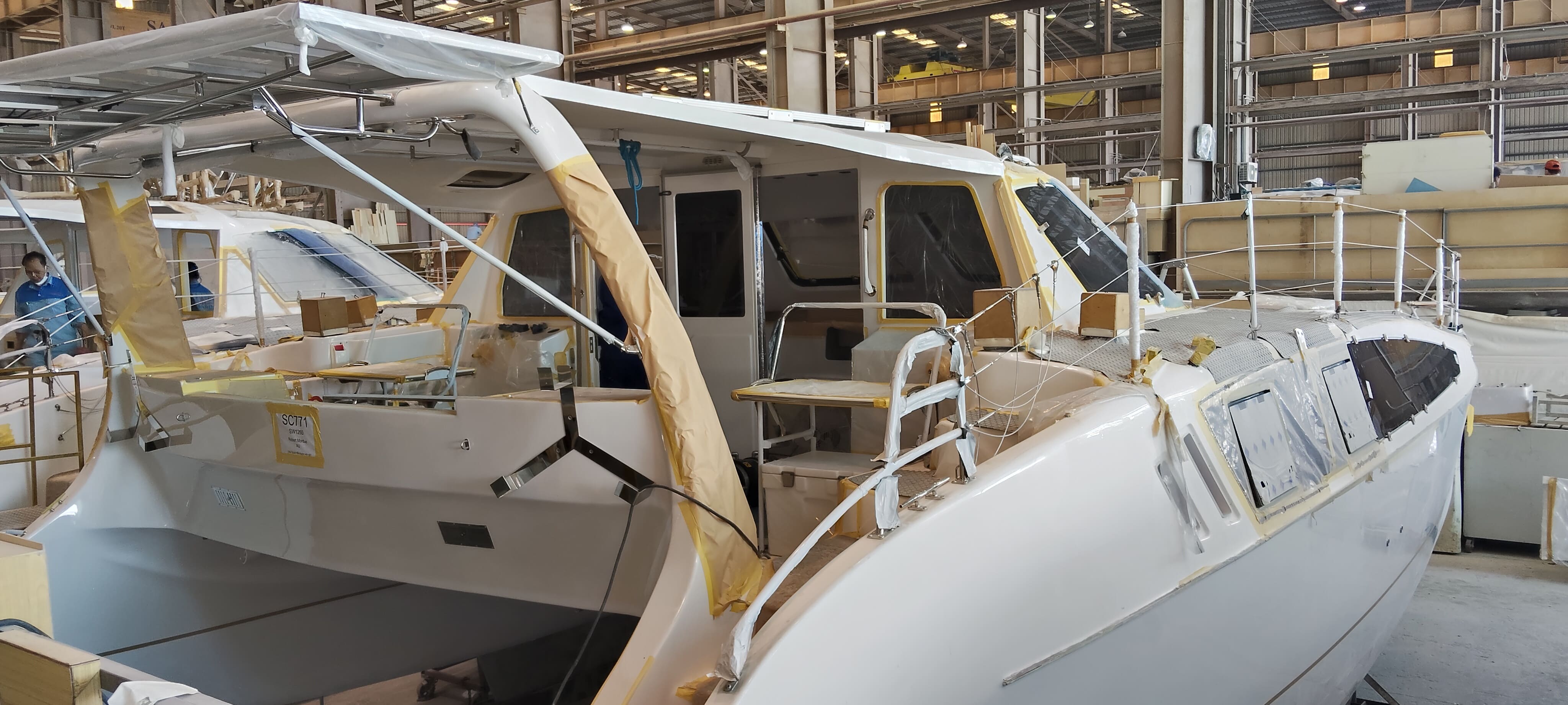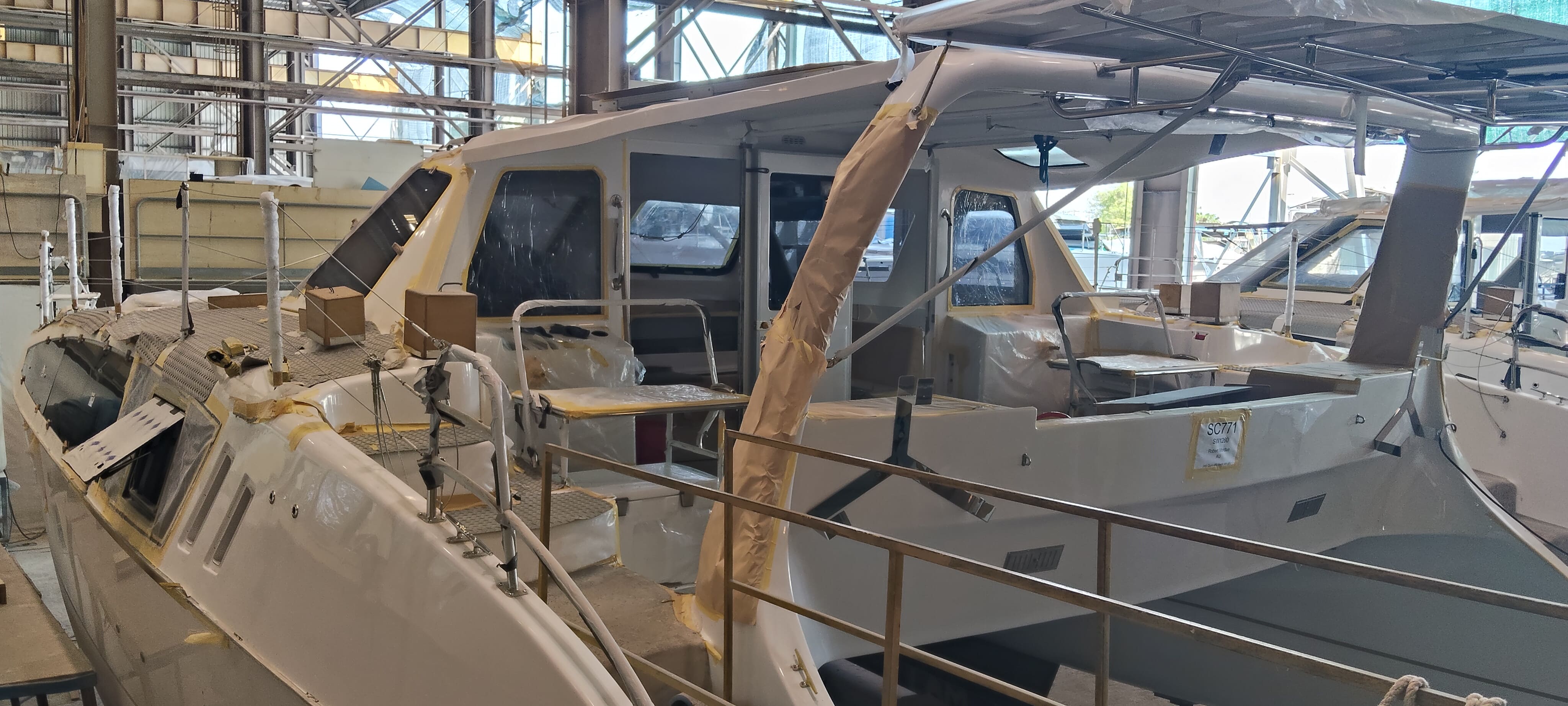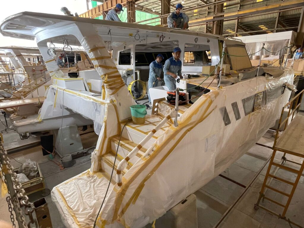 We recently completed the installation of A-frame, stanchion, forward beam, windows and hatches. Our Production team is currently working on trampoline, deck hardware (50%), electric work (30%), plumbing & LPG (30%), steering (30%).