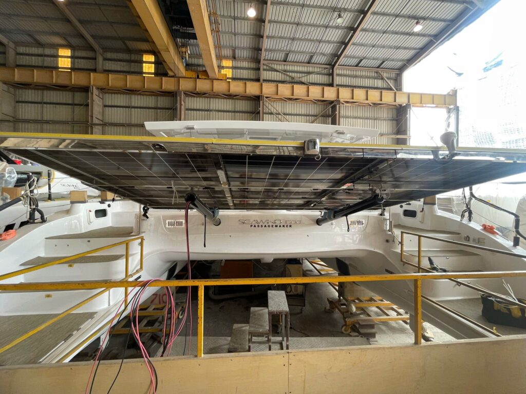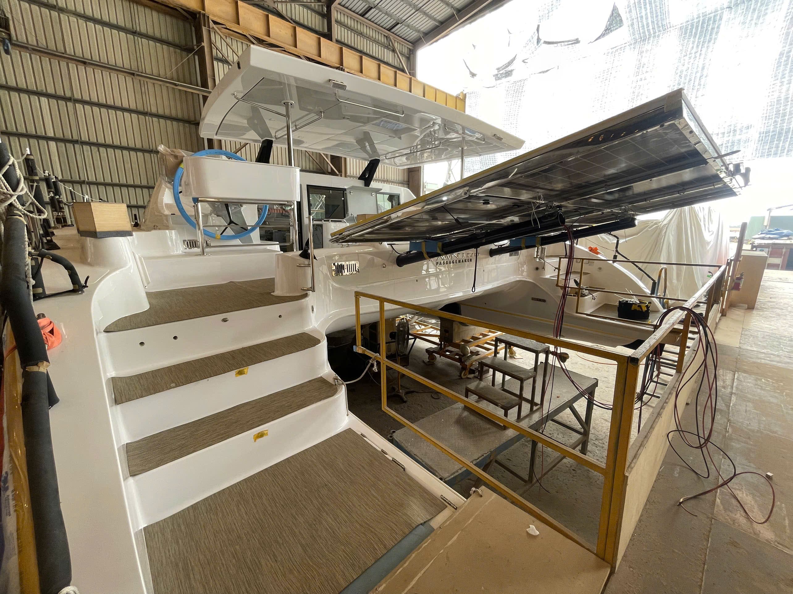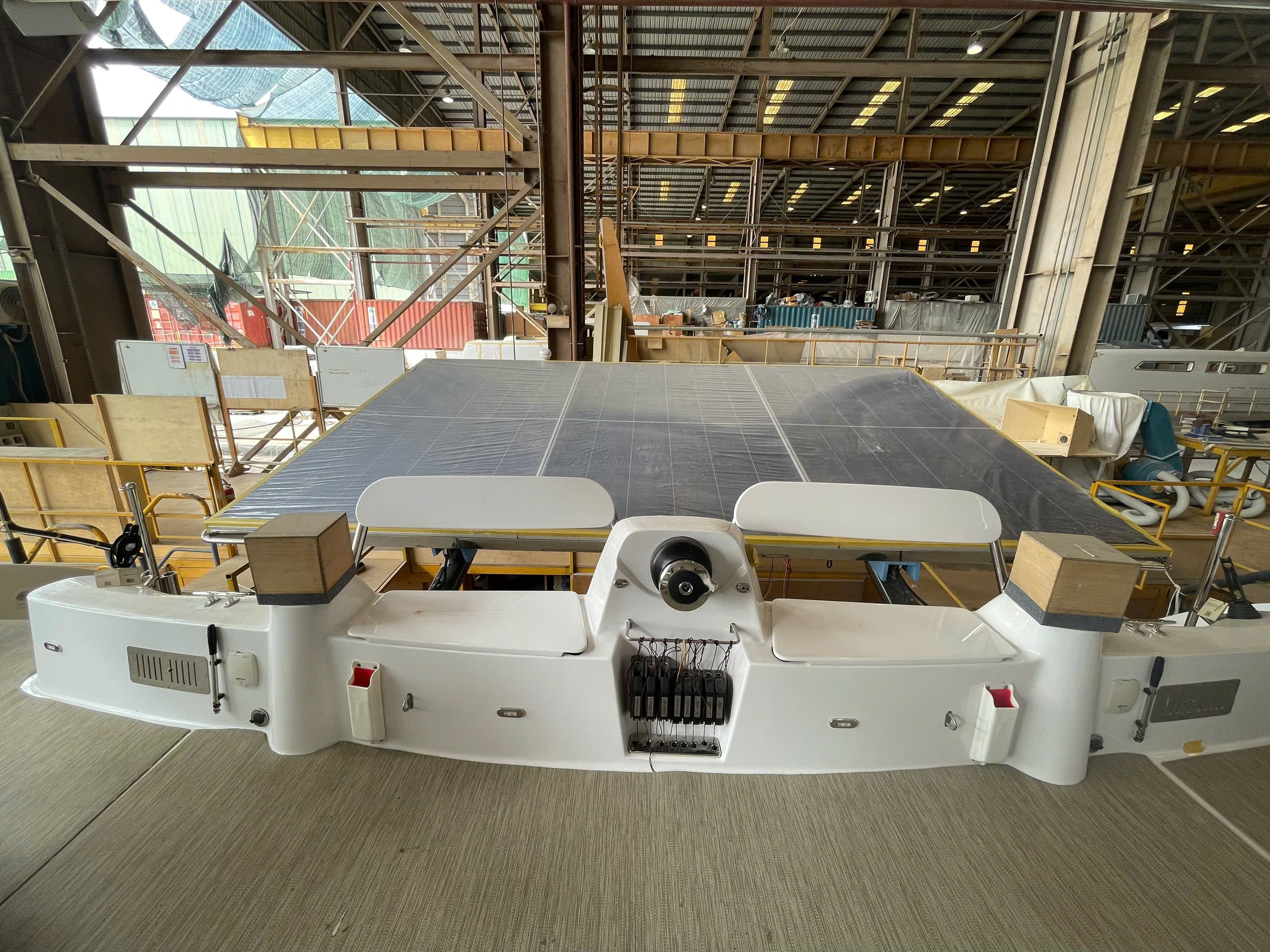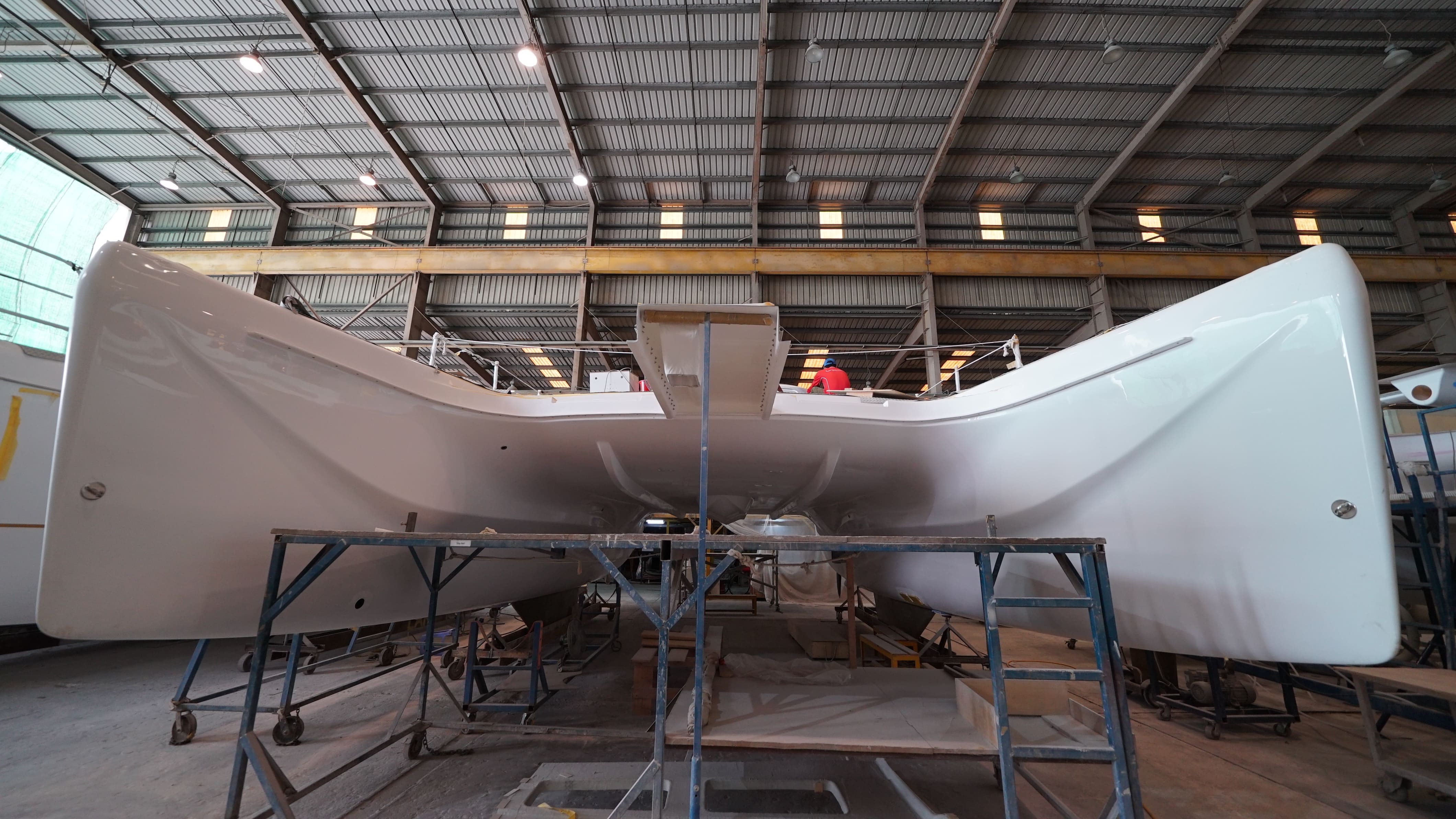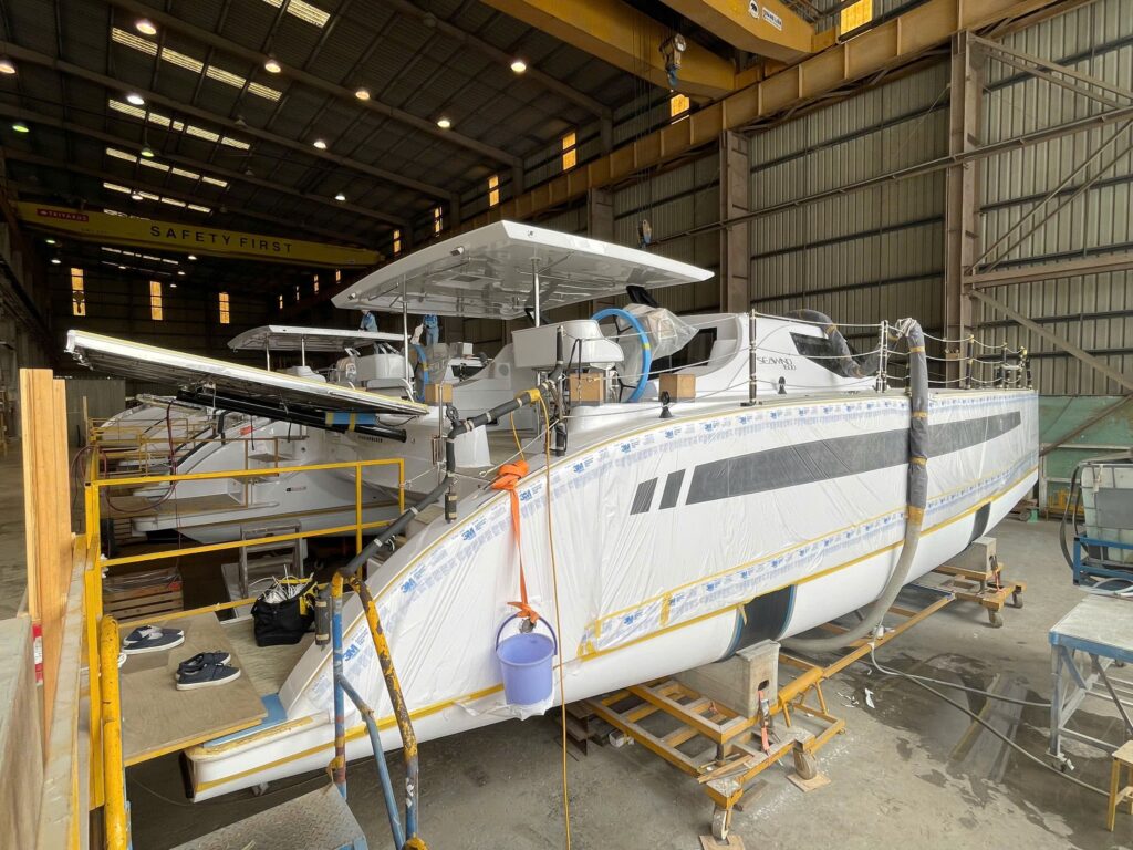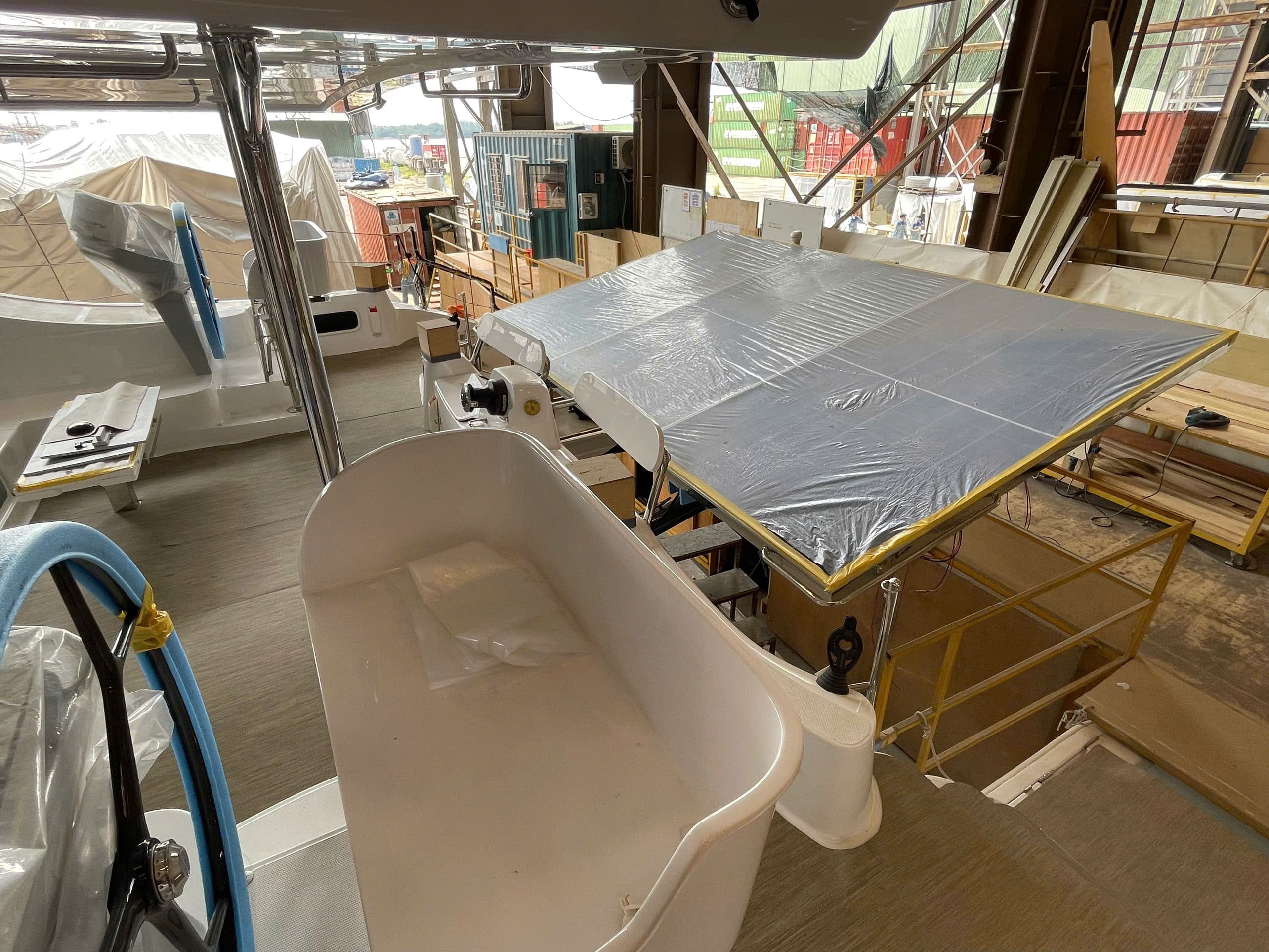 We recently completed the installation of A-frame, stanchion, forward beam, windows and hatches. Our Production team is currently working on trampoline, deck hardware (50%), electric work (30%), plumbing & LPG (30%), steering (30%).