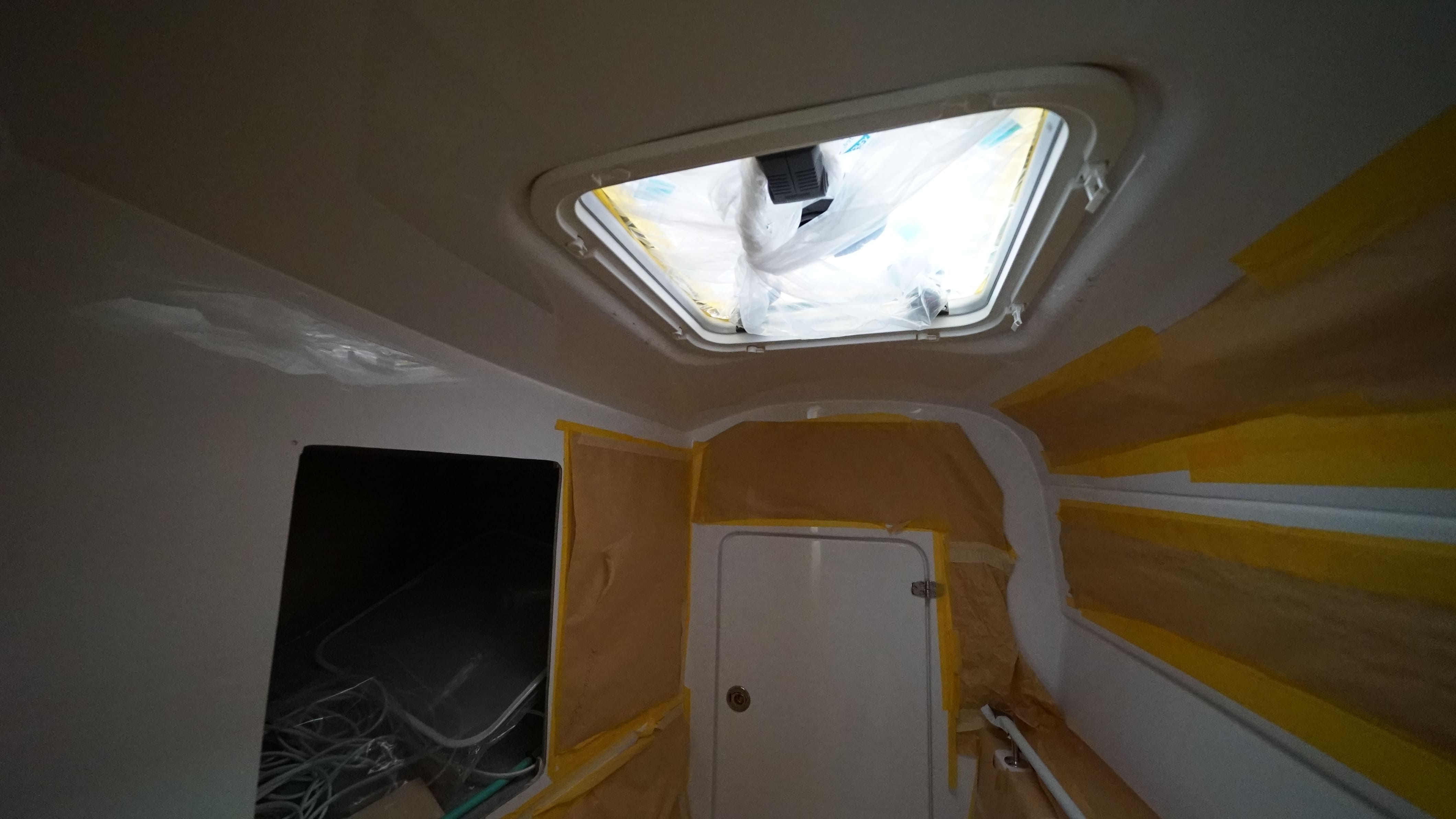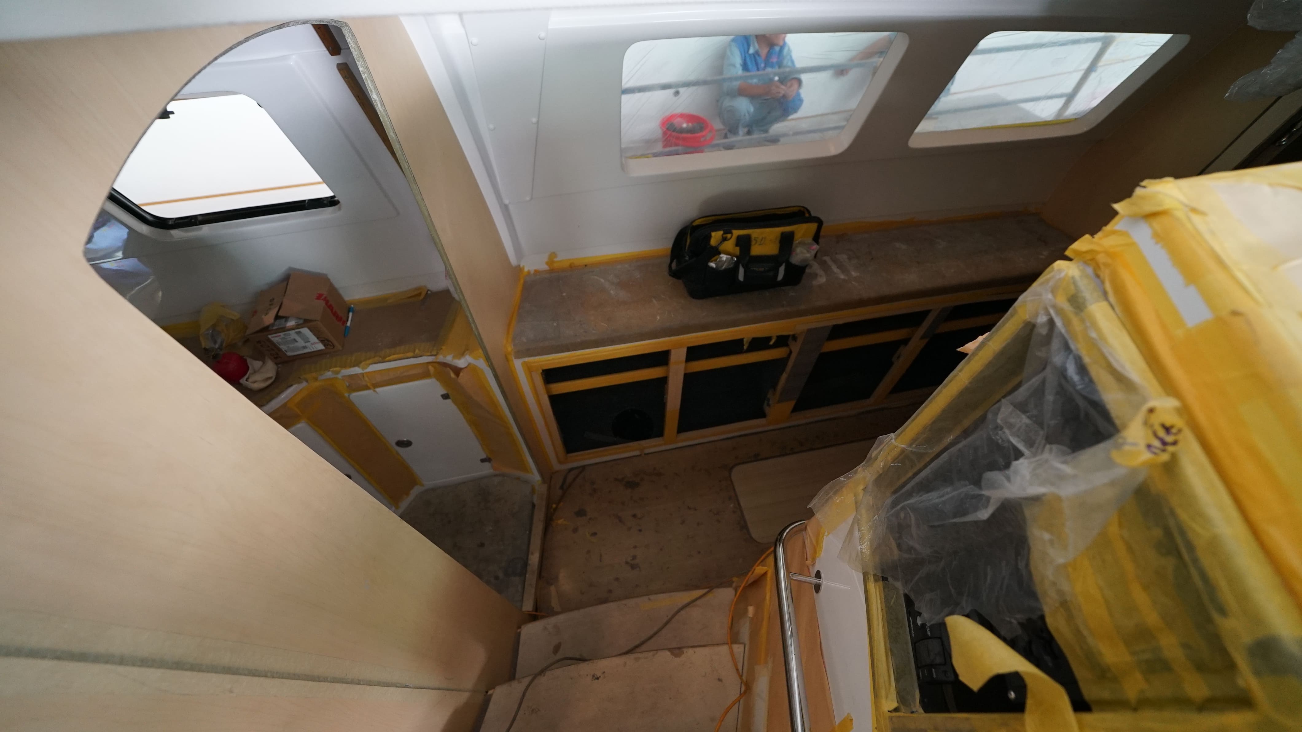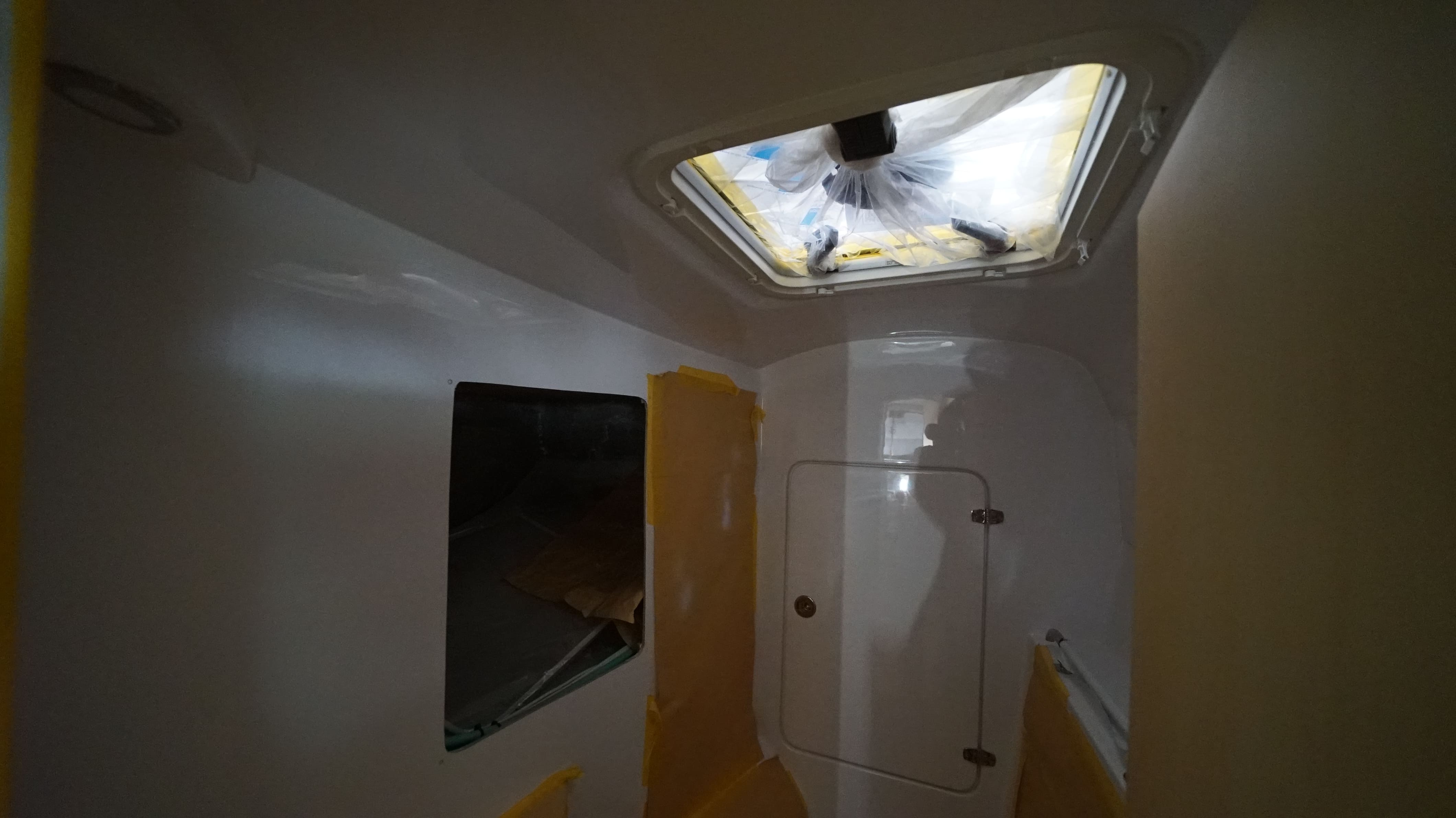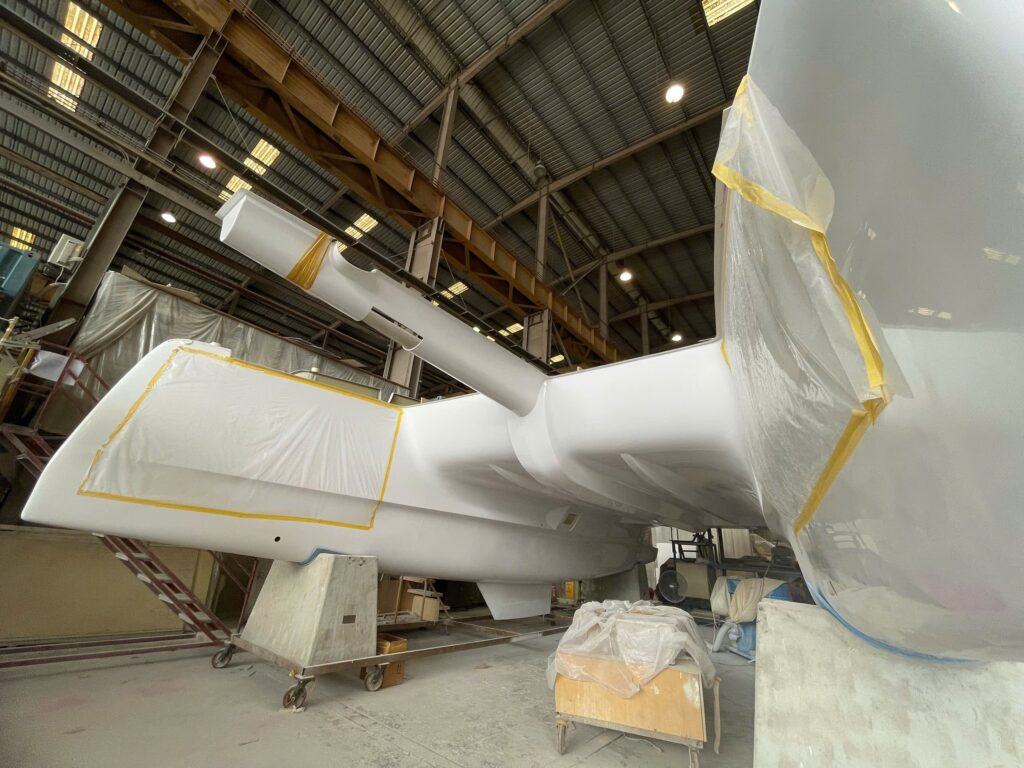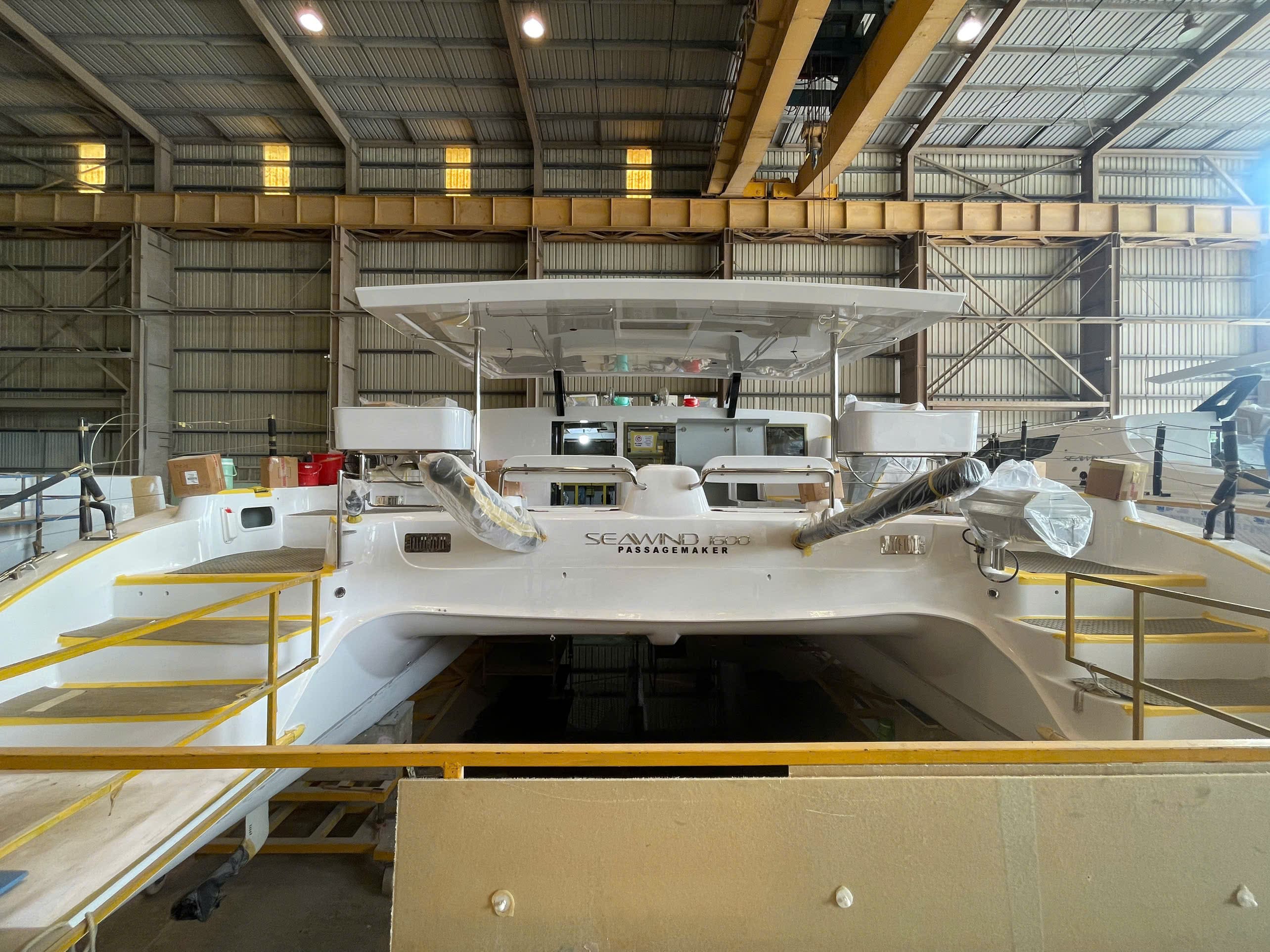 We recently completed the installation of A-frame, stanchion, forward beam, windows and hatches. Our Production team is currently working on trampoline, deck hardware (50%), electric work (30%), plumbing & LPG (30%), steering (30%).