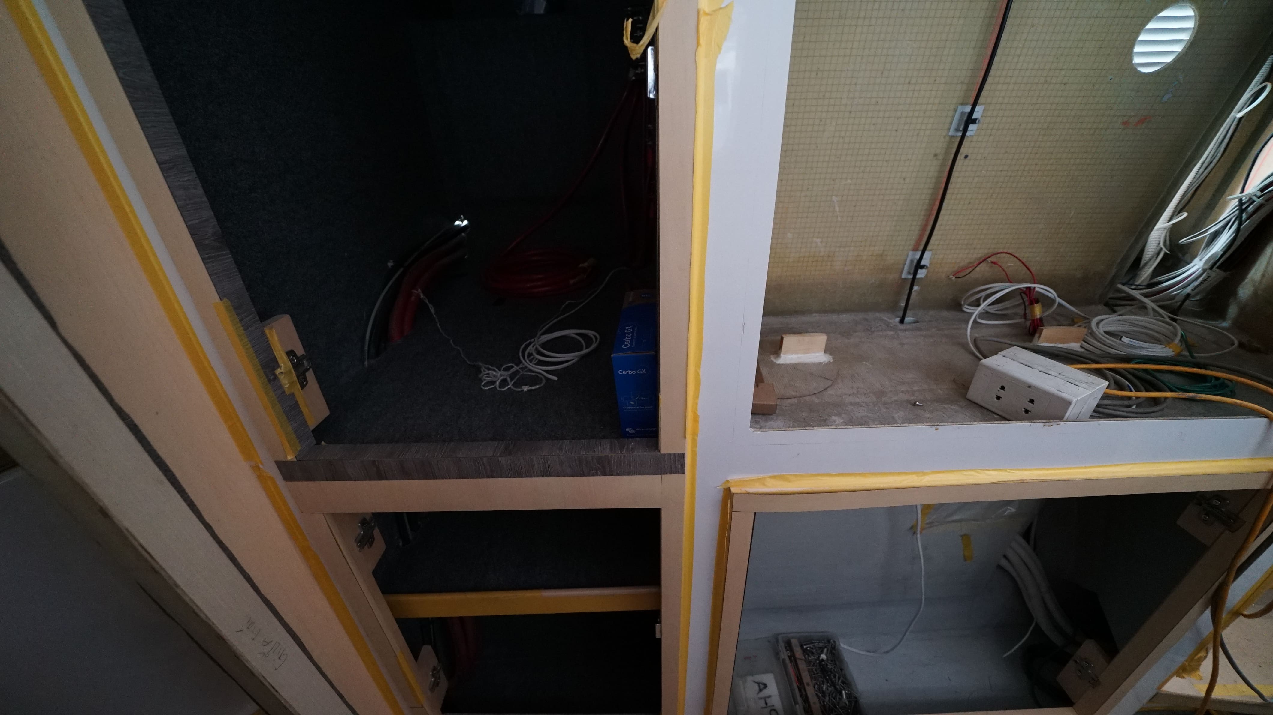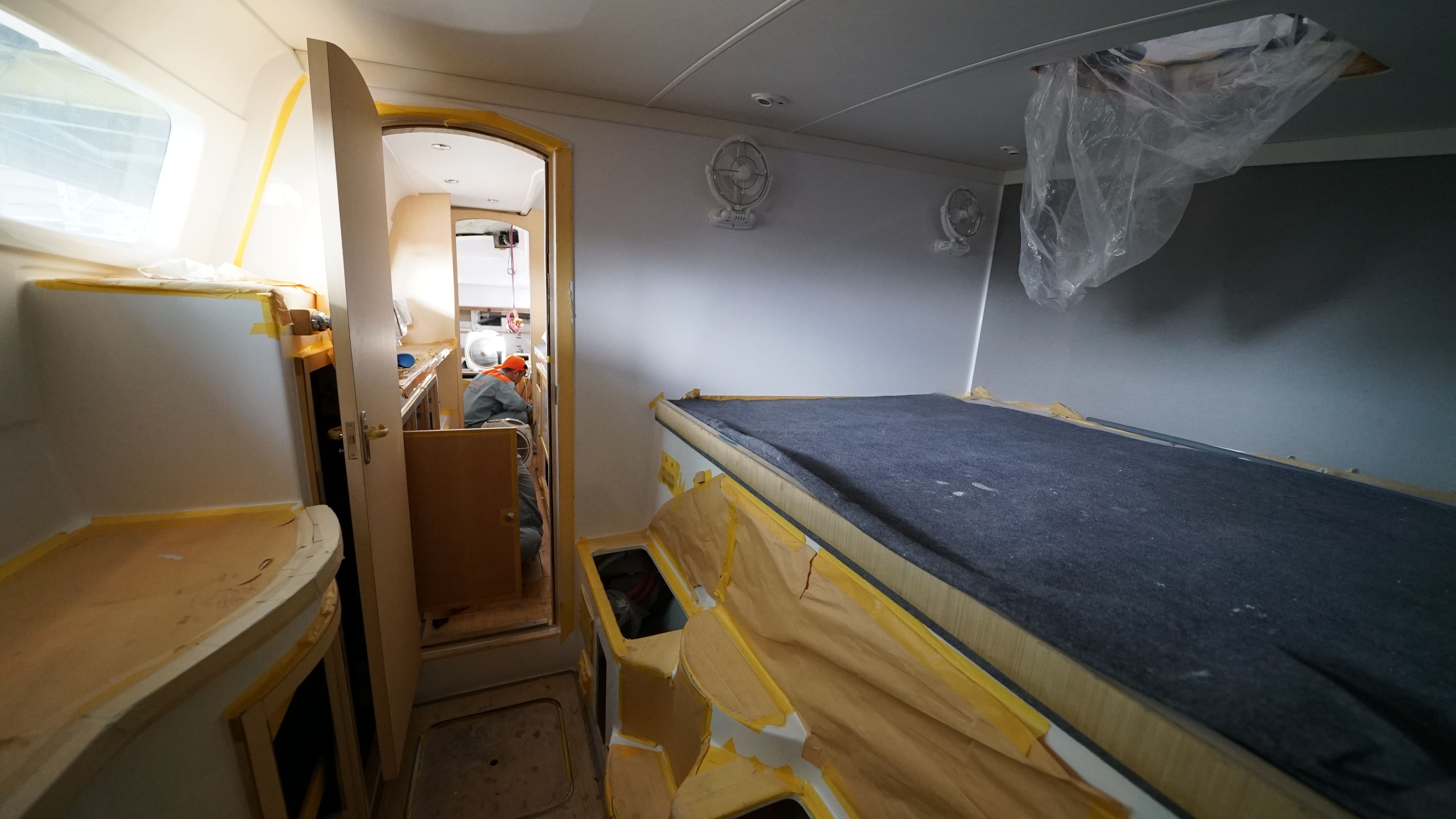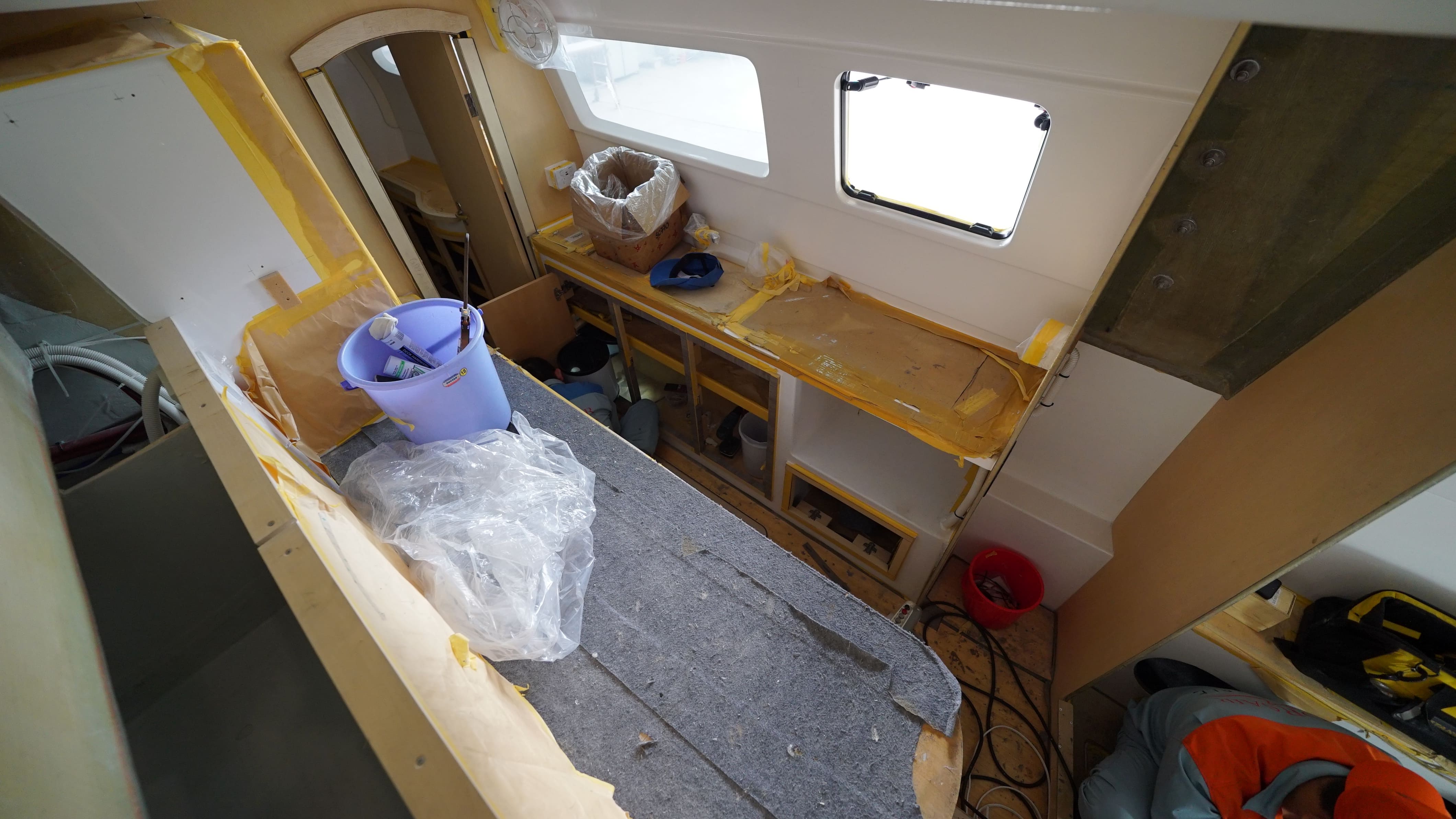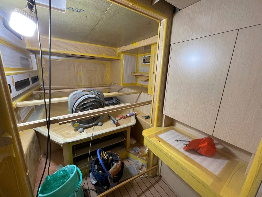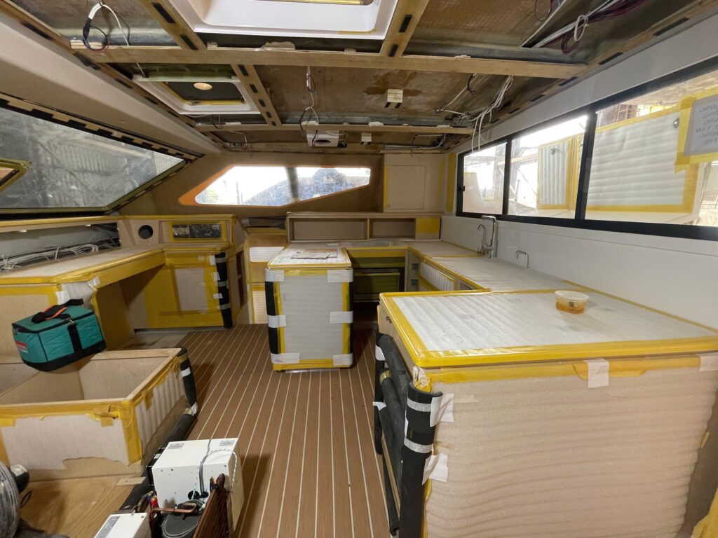 At this stage, we have already installed the forward beam, A-frame, anchor box, windows and trampoline. We are now working on the deck hardware (95%), steering system (25%), plumbing & LPG (50%), electrical system (15%), and timber fitout (50%).