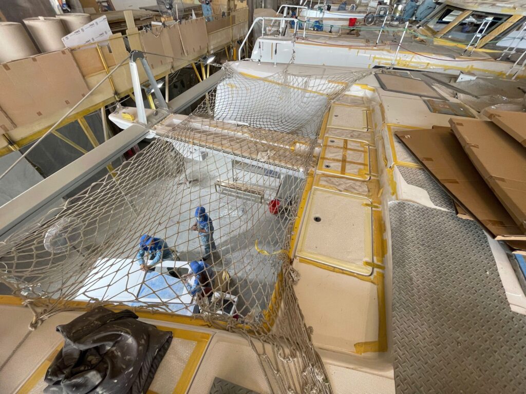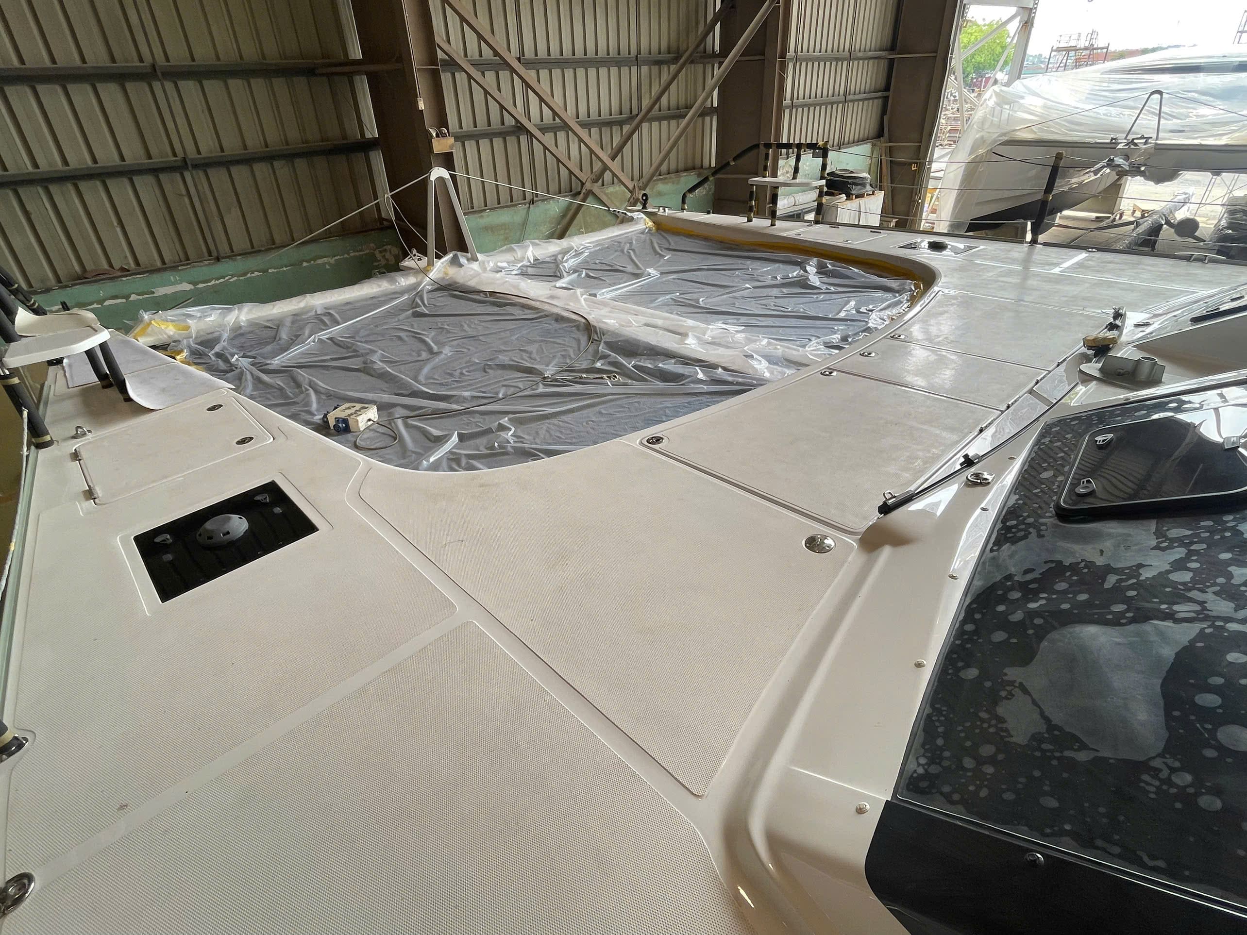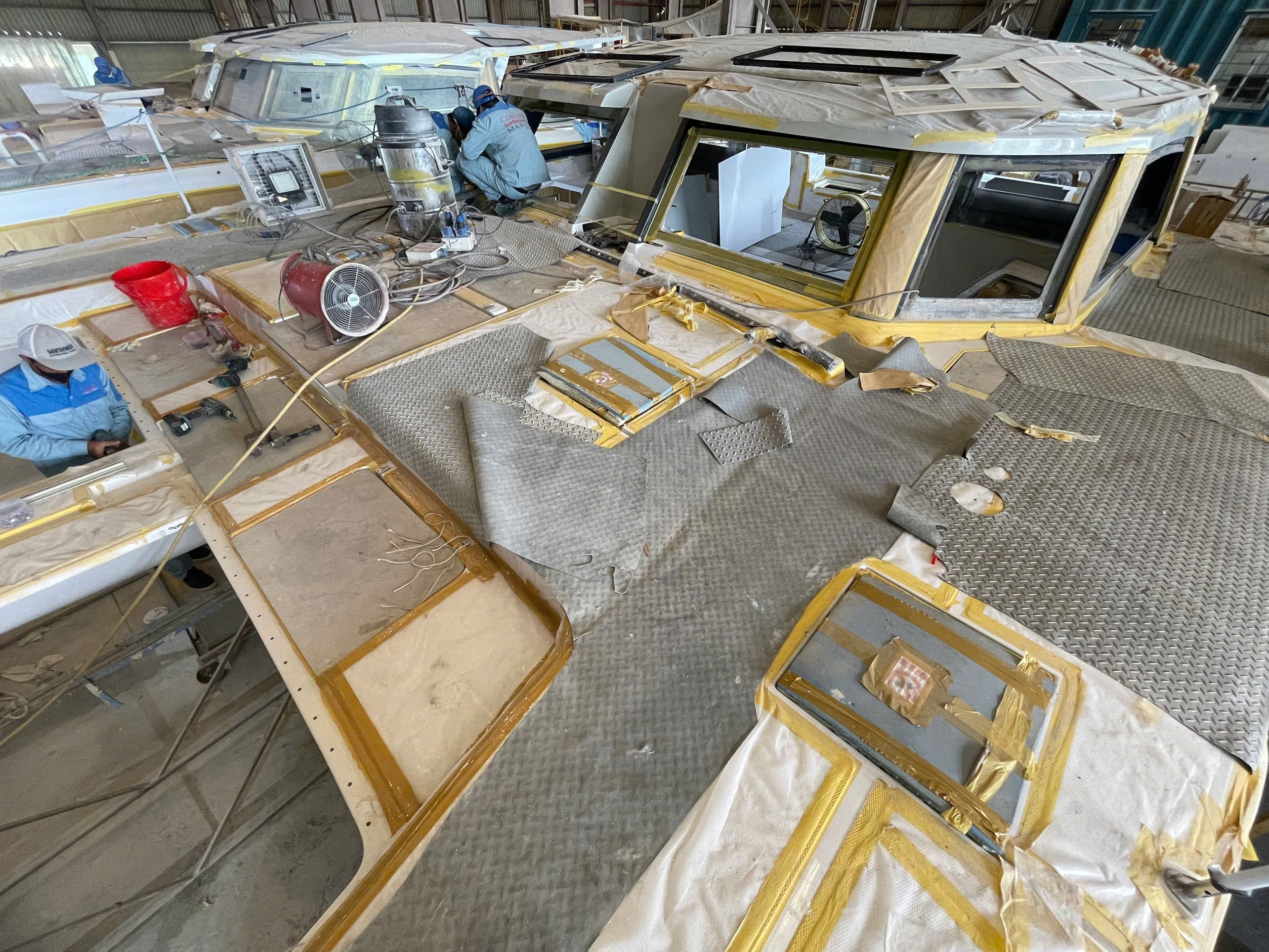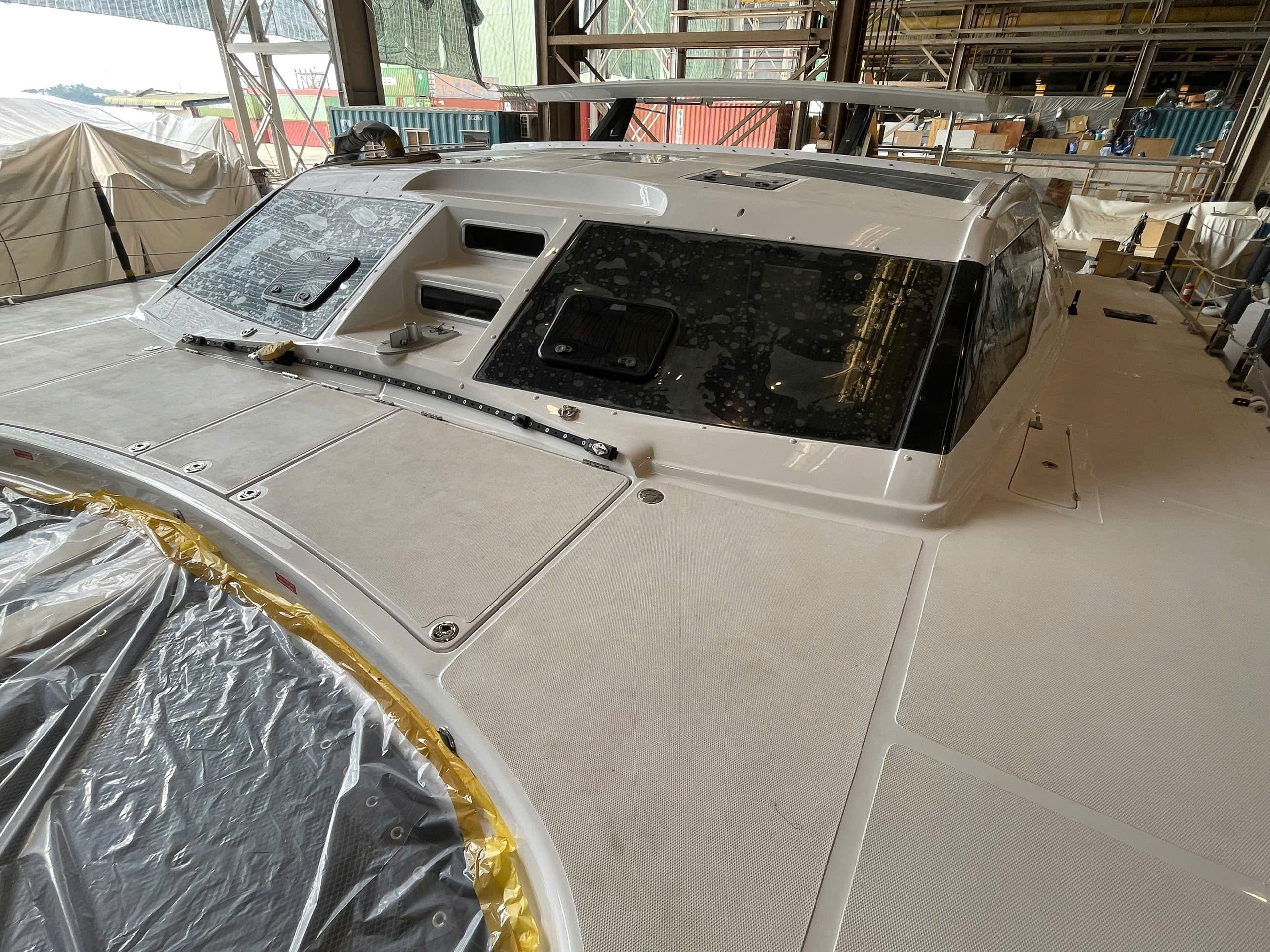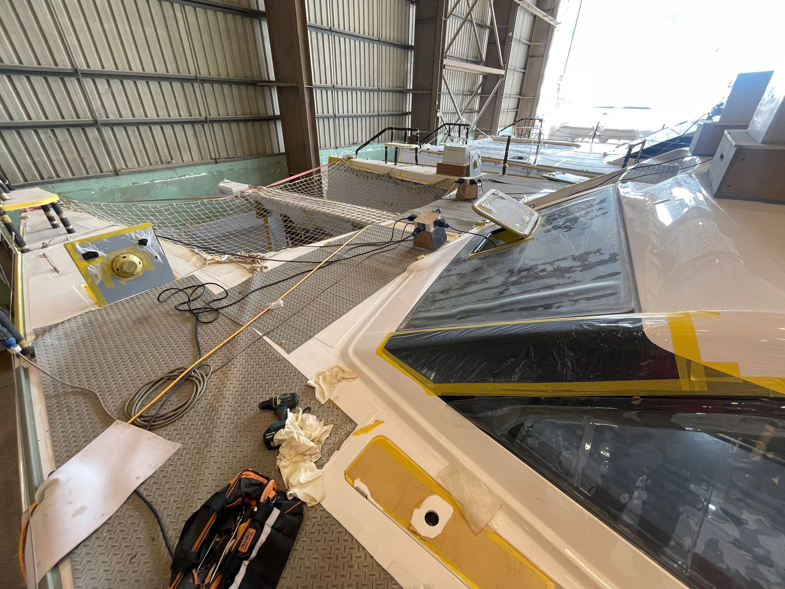 At this point, the deck joining has taken place, and our team has also completed work on the longeron and gelcoat repairs. We are currently working on deck hardware, stanchion, lifelines, electrical system, and plumbing.