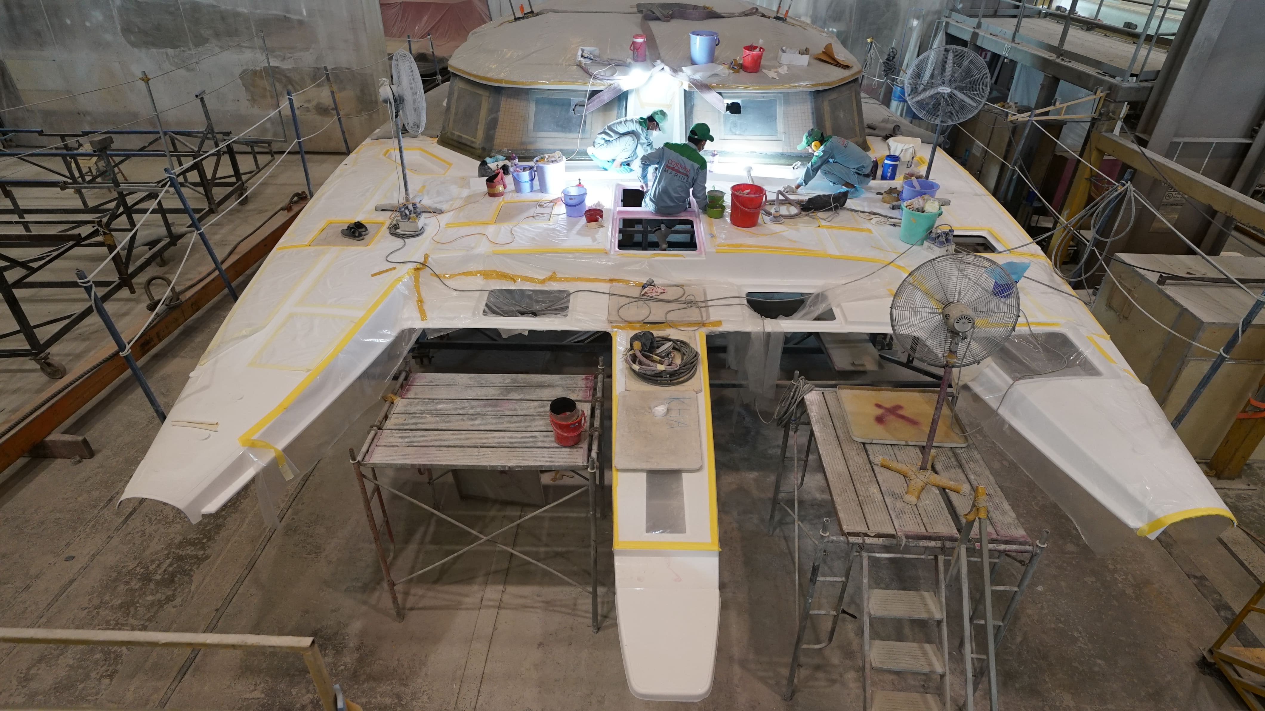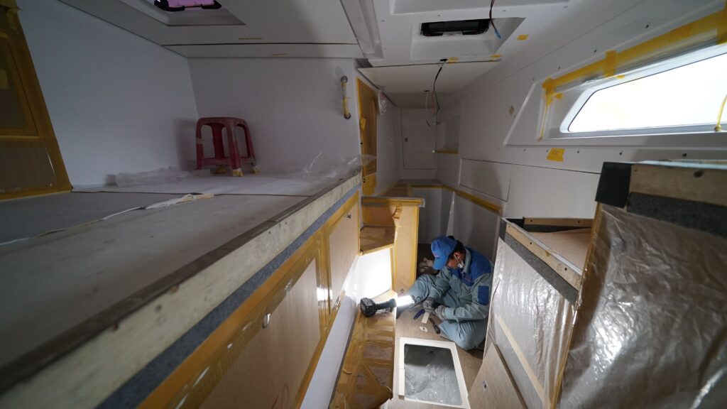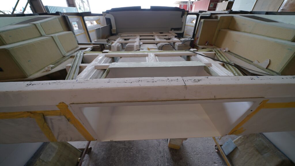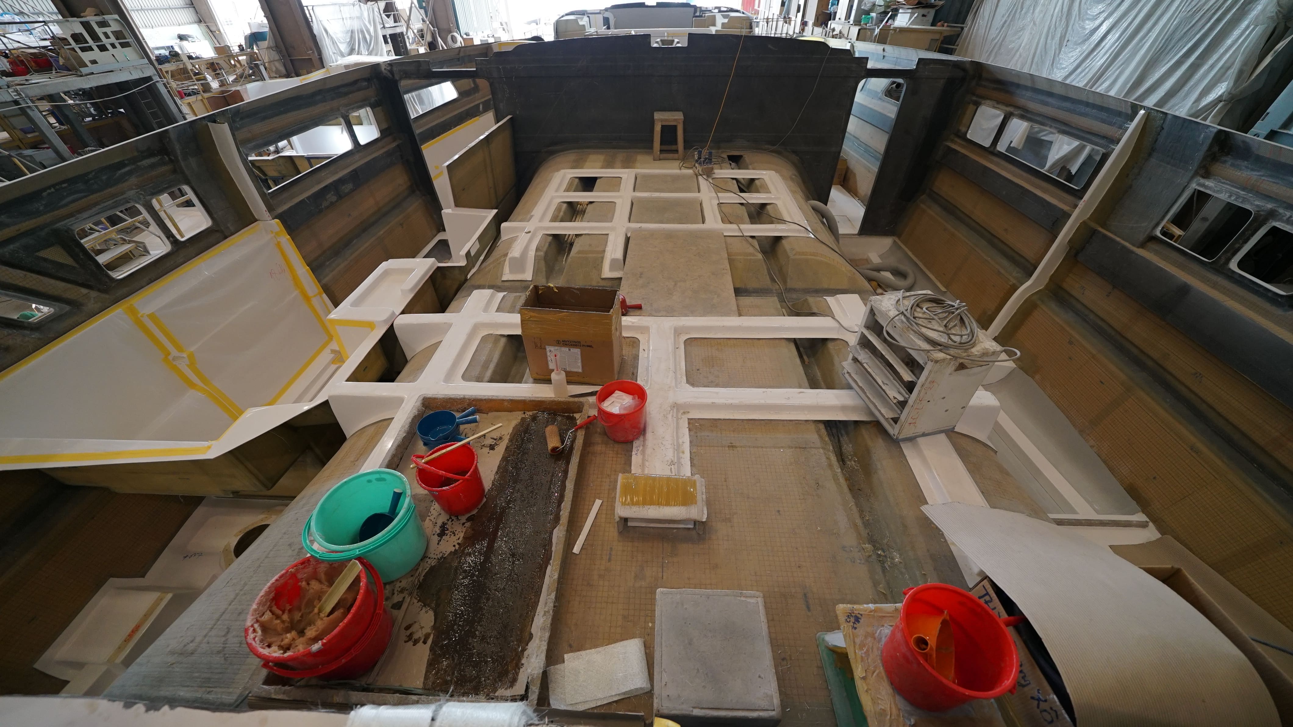 The hull and deck have been successfully demolded. Our Production team is working on furniture module installation inside the hull. The coach roof were joined with the deck which is now undergoing gelcoat repairs.