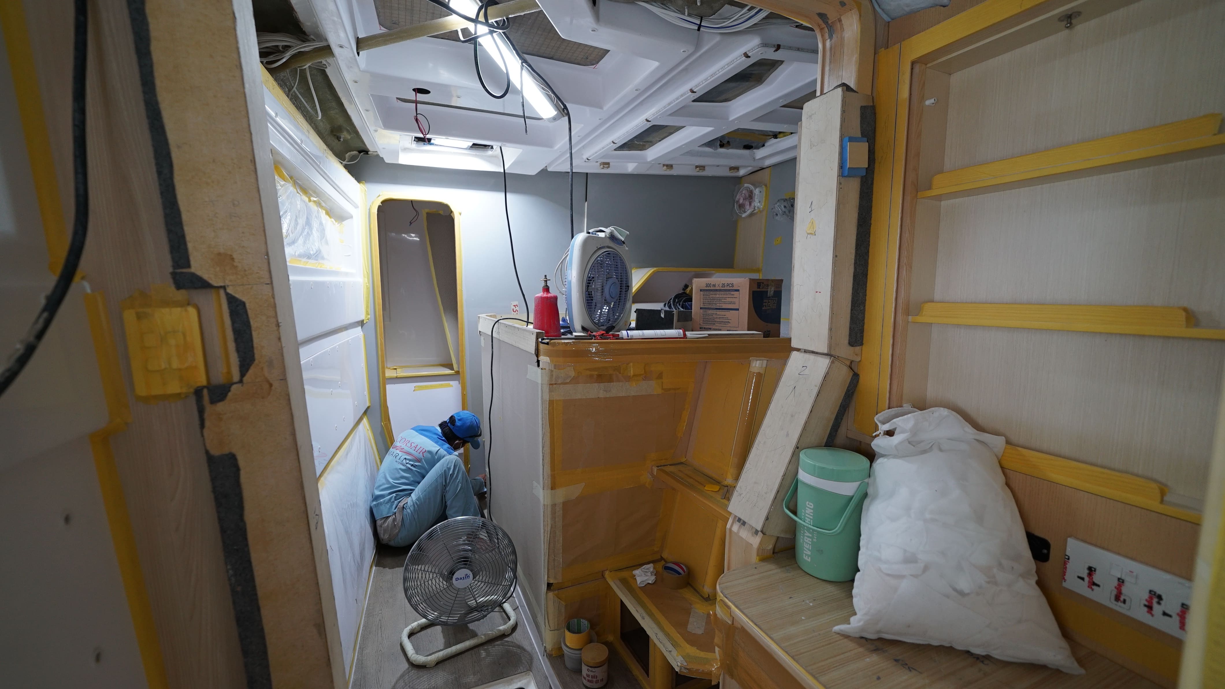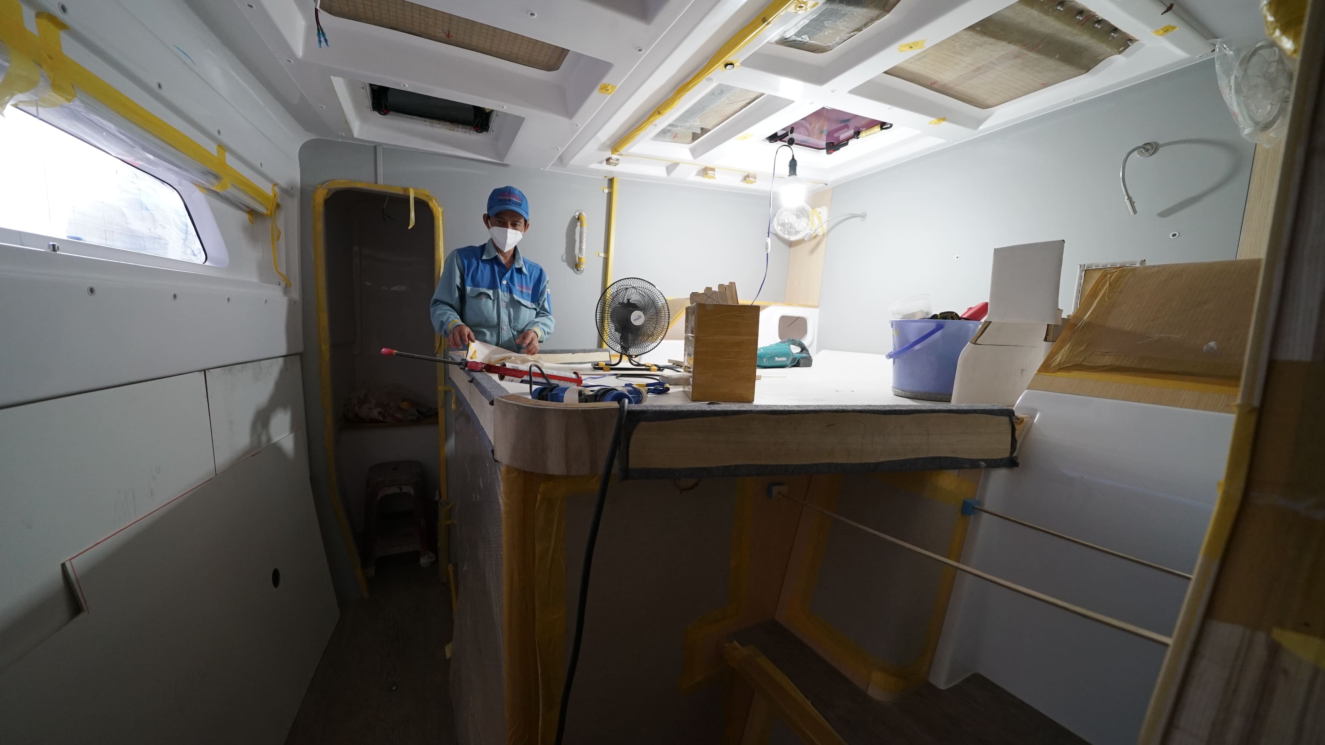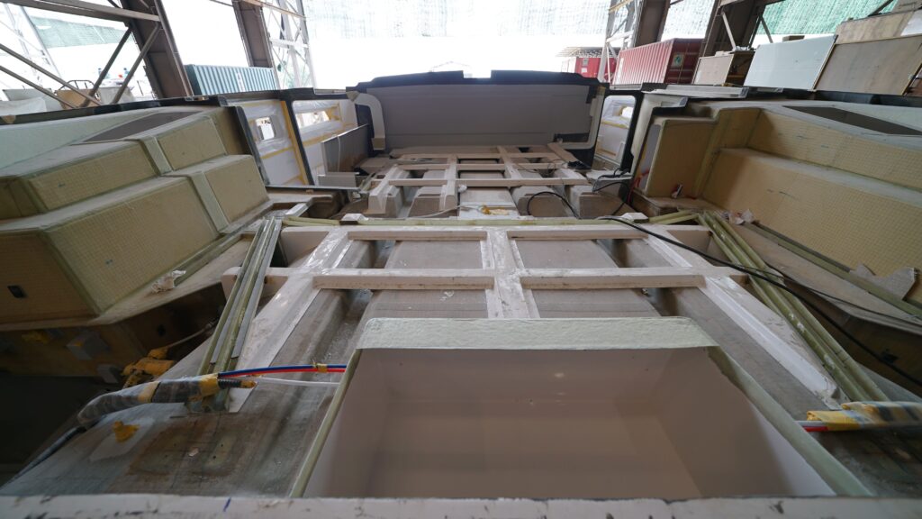 The hull and deck have been successfully demolded. Our Production team is working on furniture module installation inside the hull. The coach roof were joined with the deck which is now undergoing gelcoat repairs.