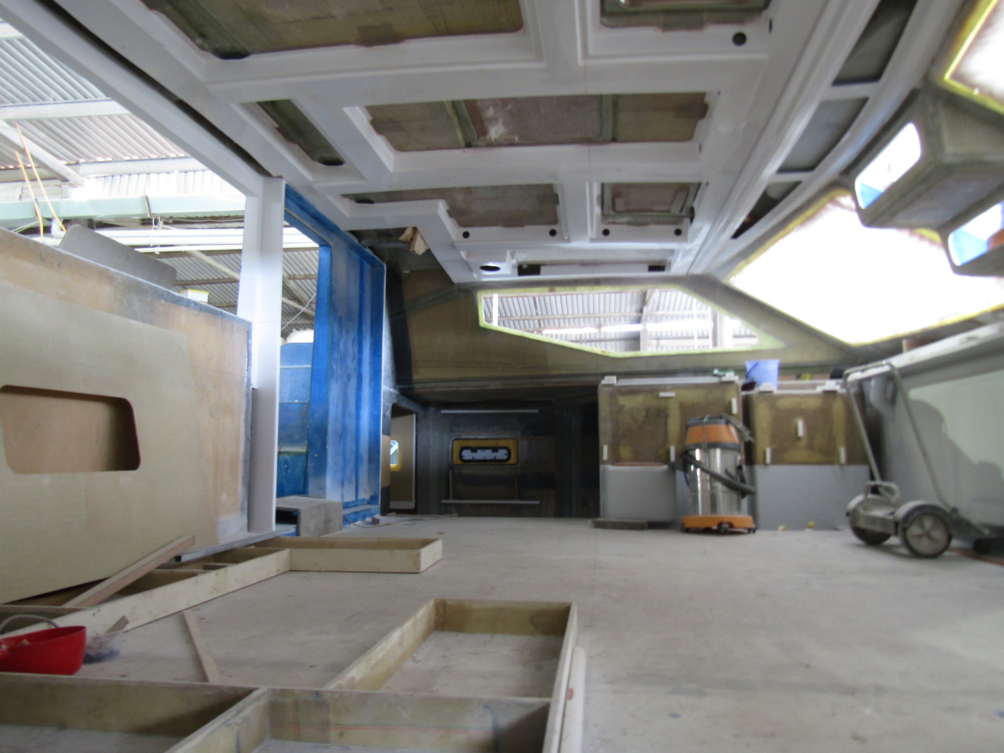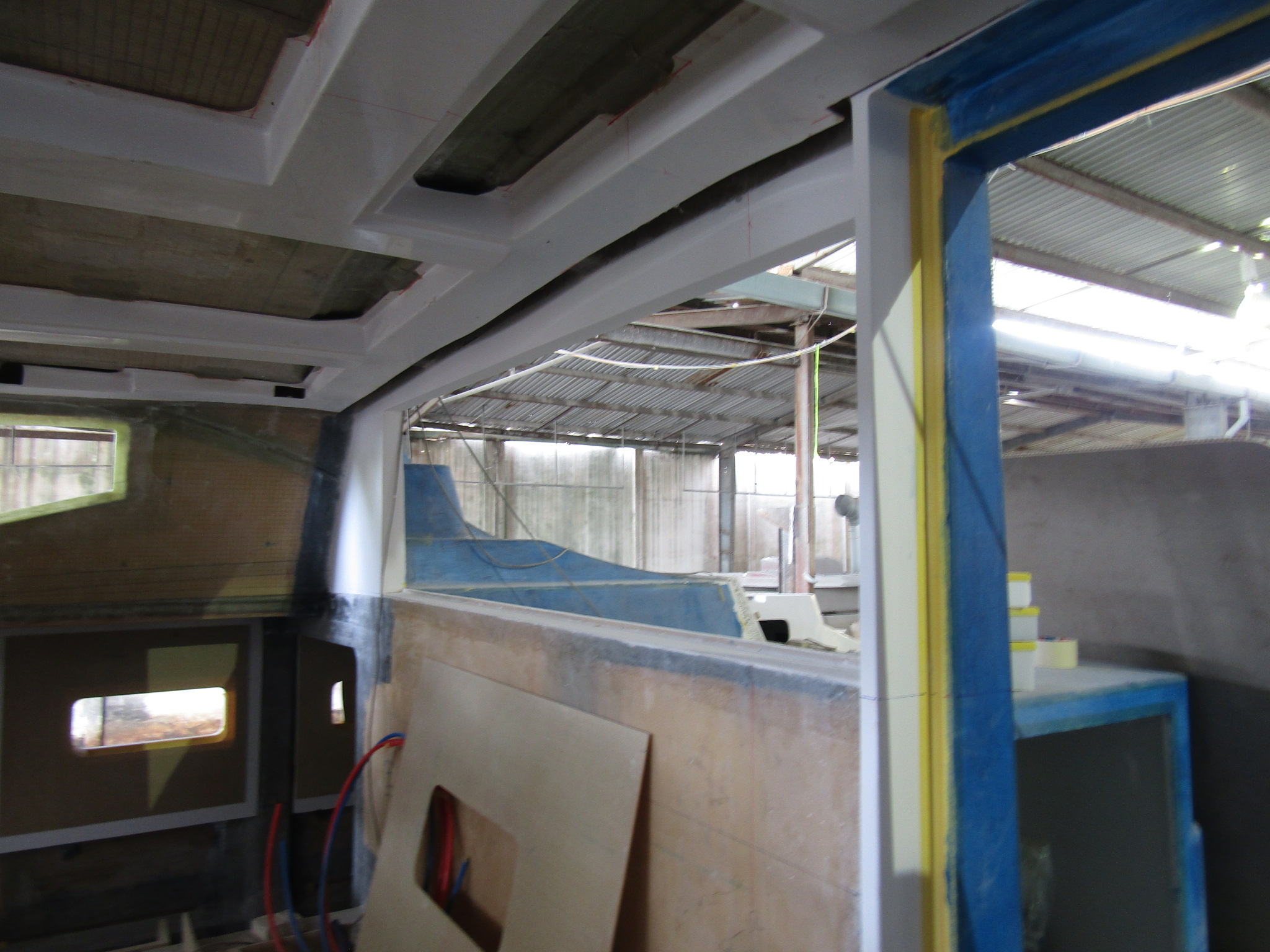 Exterior: helm stations have been pre-fitted and coated with primer. Hull detailing has now been completed. Works are done with chain plates detailing, inboard bow section.