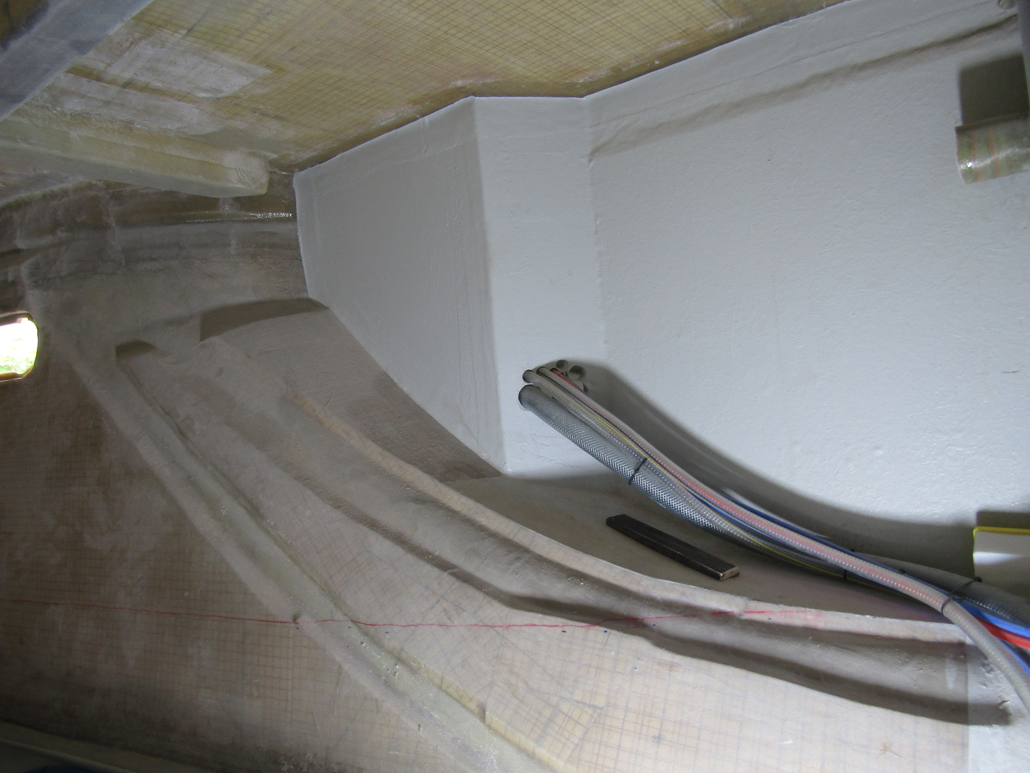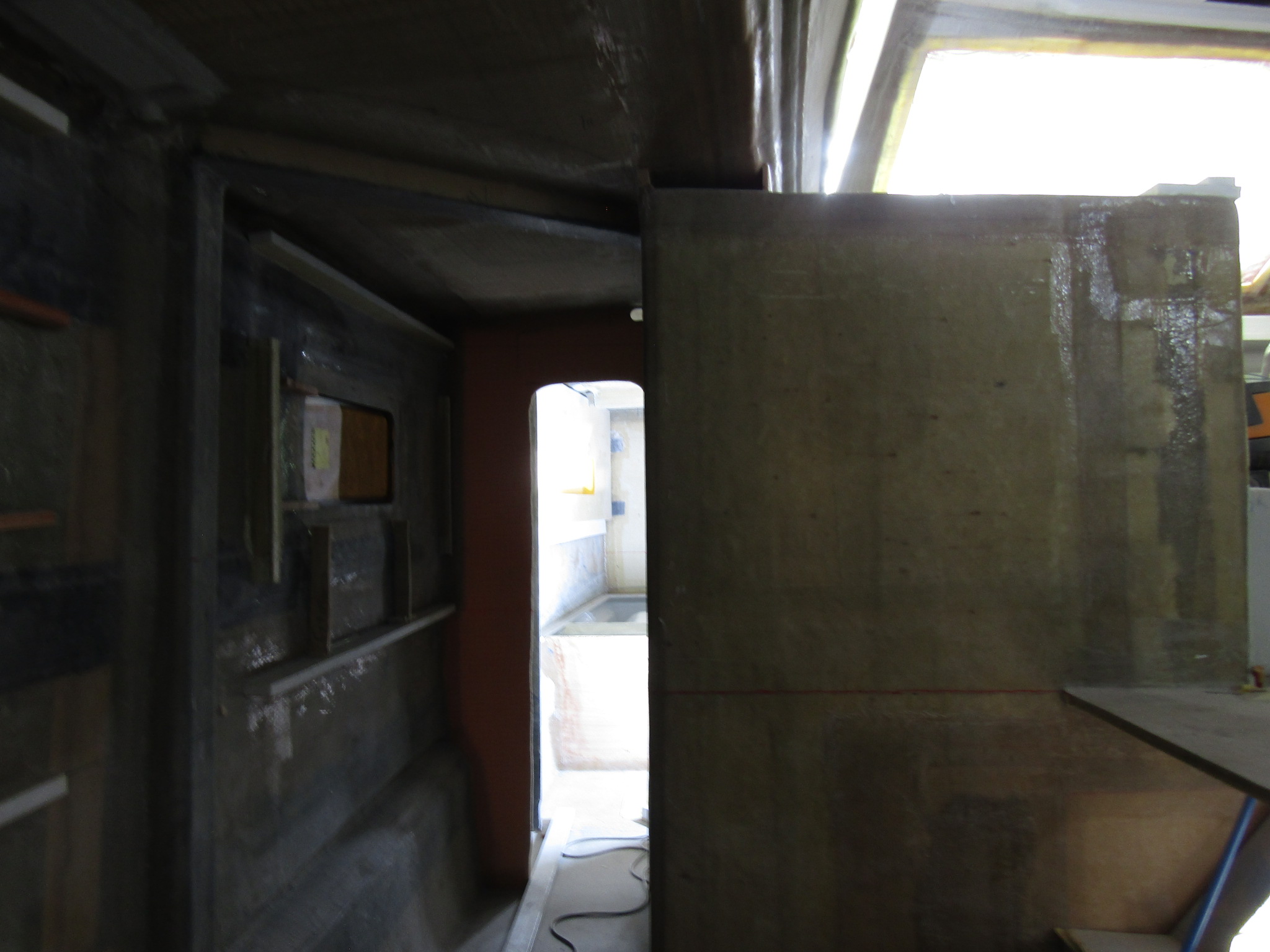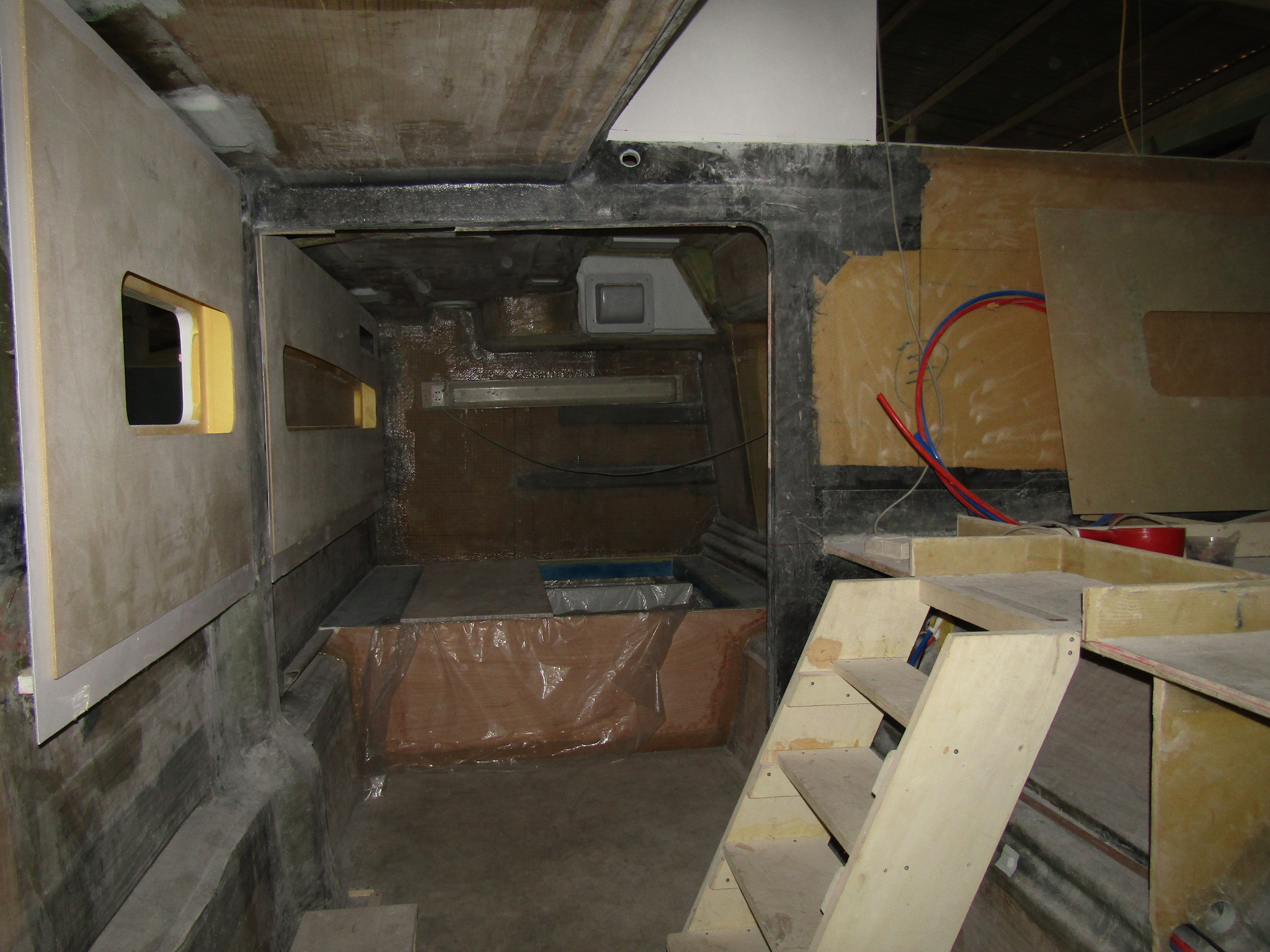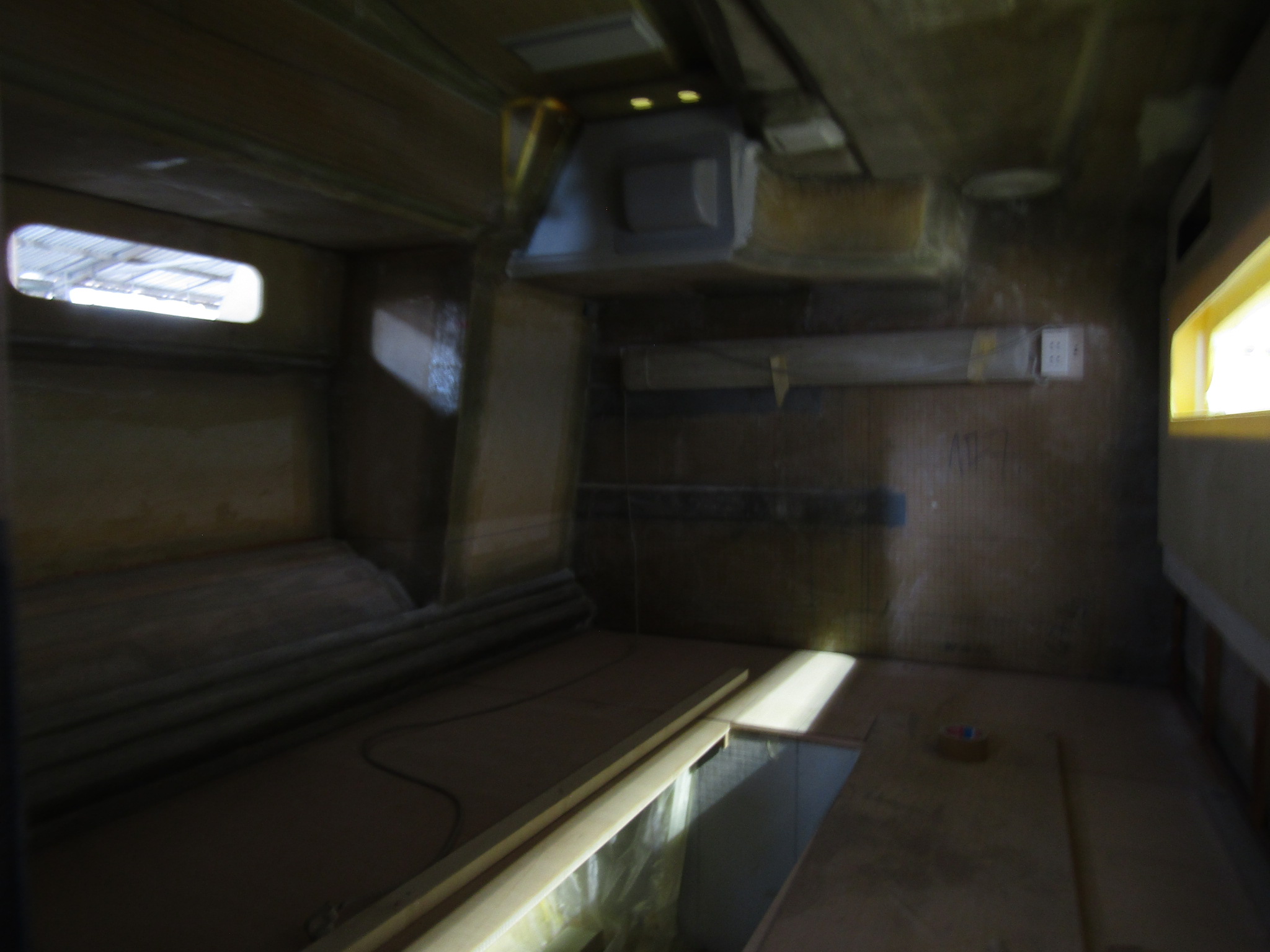 Interior: works have been completed for the installation of fwd fresh water pump, holding tank, and the moldings of escape hatches. Starboard head detailing, hot & cold plumbing, and window liners are 90% done. The preparation of window installation is half way ready. Other jobs including bed base and settee back have been started.