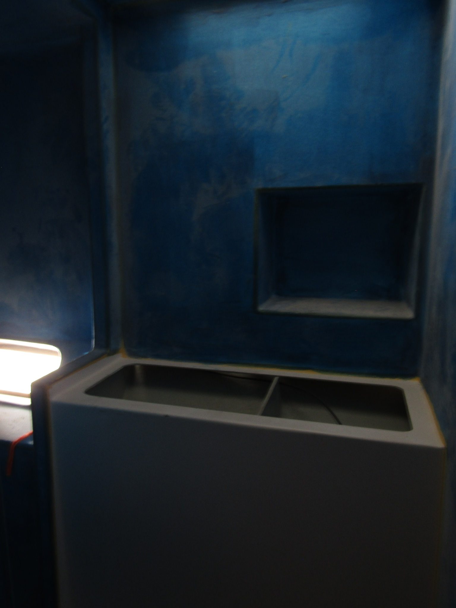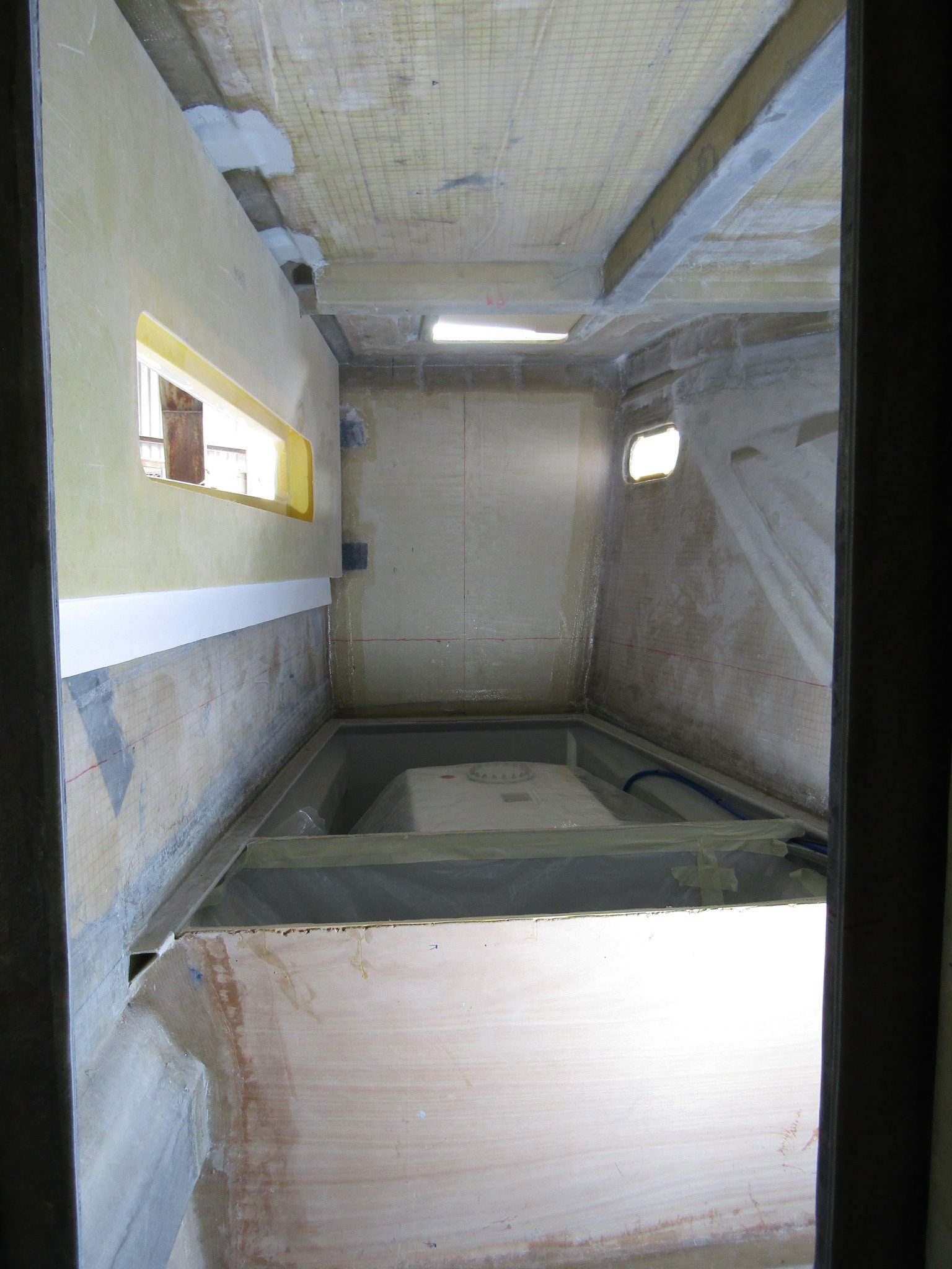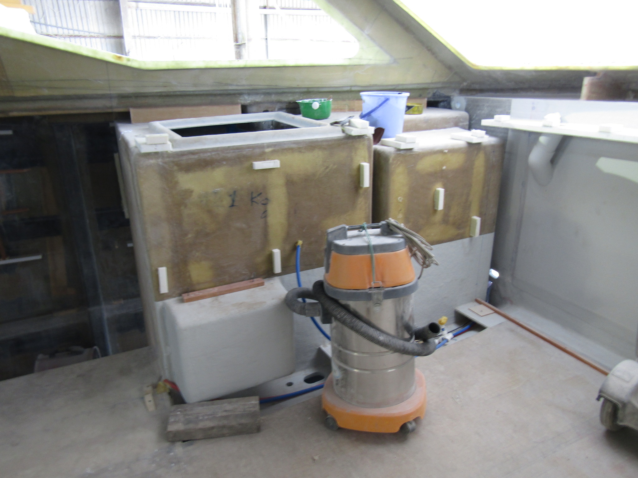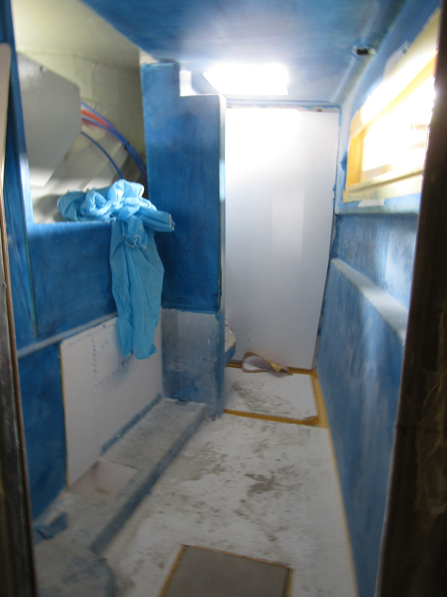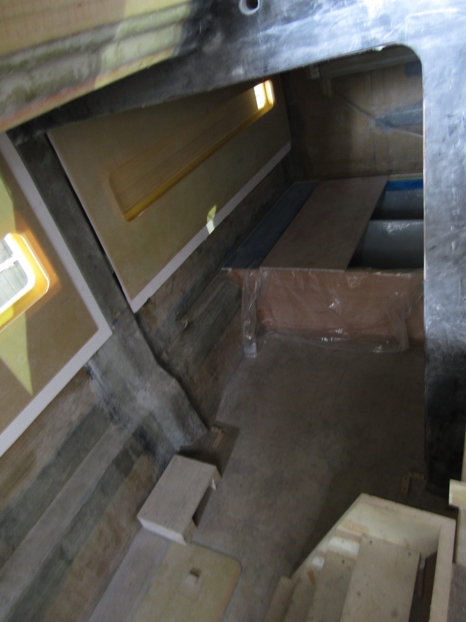 Interior: works have been completed for the installation of fwd fresh water pump, holding tank, and the moldings of escape hatches. Starboard head detailing, hot & cold plumbing, and window liners are 90% done. The preparation of window installation is half way ready. Other jobs including bed base and settee back have been started.
