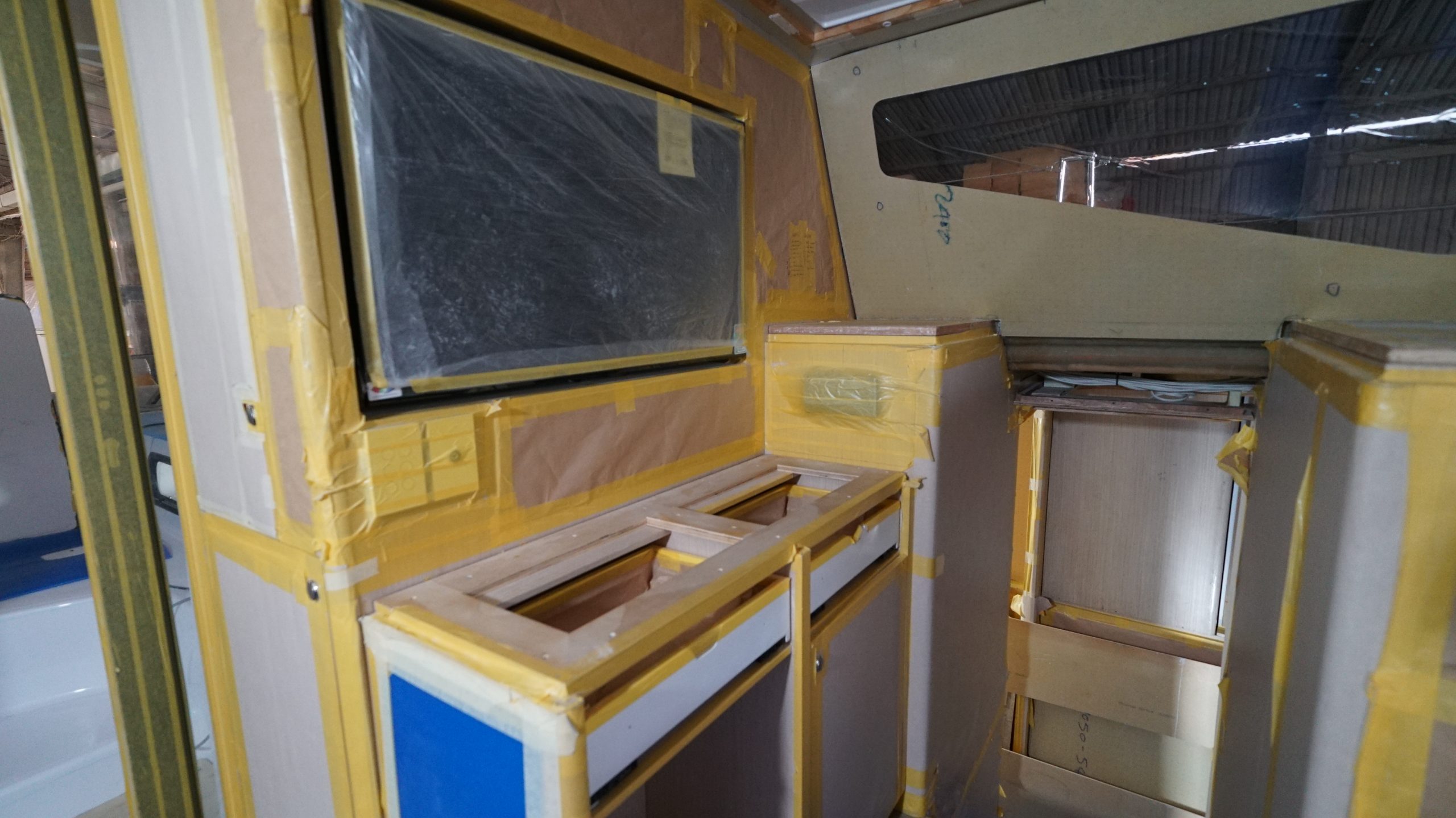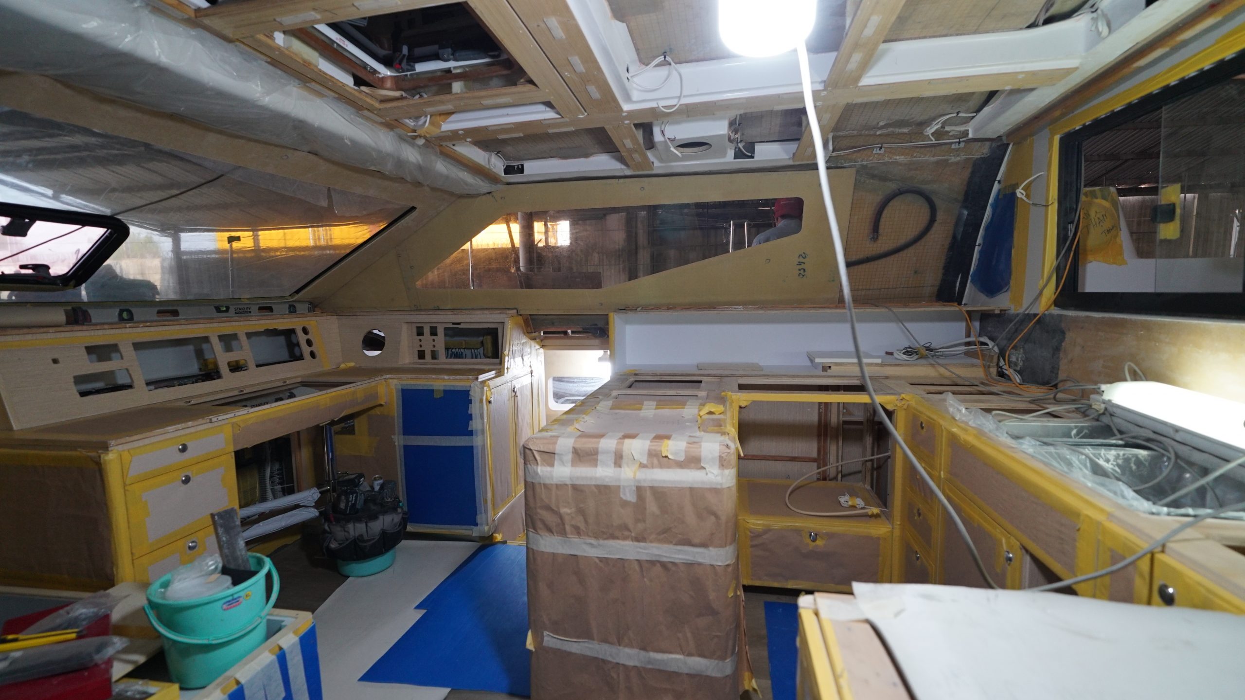 Interior: there has been quite a milestone achieved with the fitting of bed base cleats, starboard cabin bead base, electrical panels, bulkheads, speaker boxes, holding tanks 100% done. Window liners and bulkheads are more than half way of installation. Kitchen layout is being prepared for the next fitout stage.