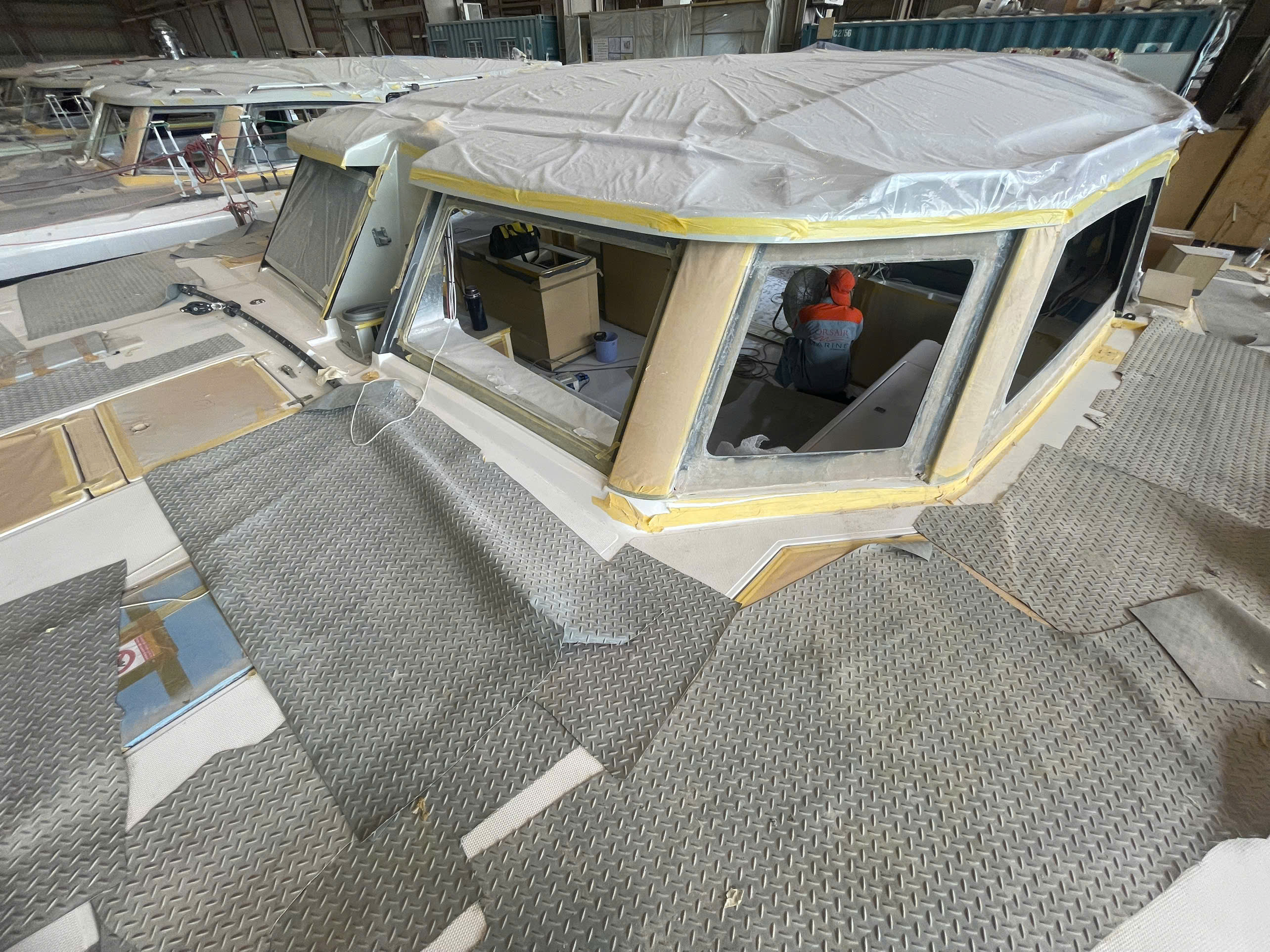 Our Production team is currently working on gelcoat repair (85%), windows & hatches (60%), electric (25%), plumbing (40%), steering system (50%), and deck hardware (50%).