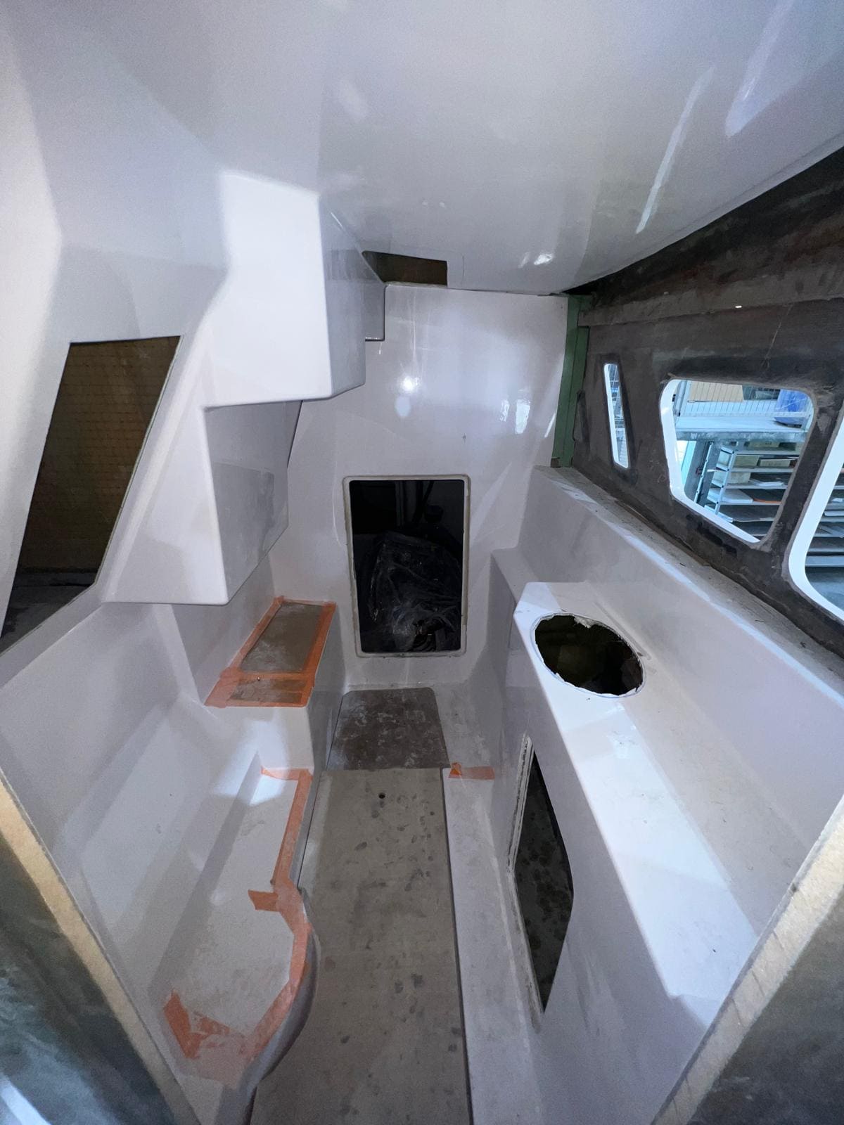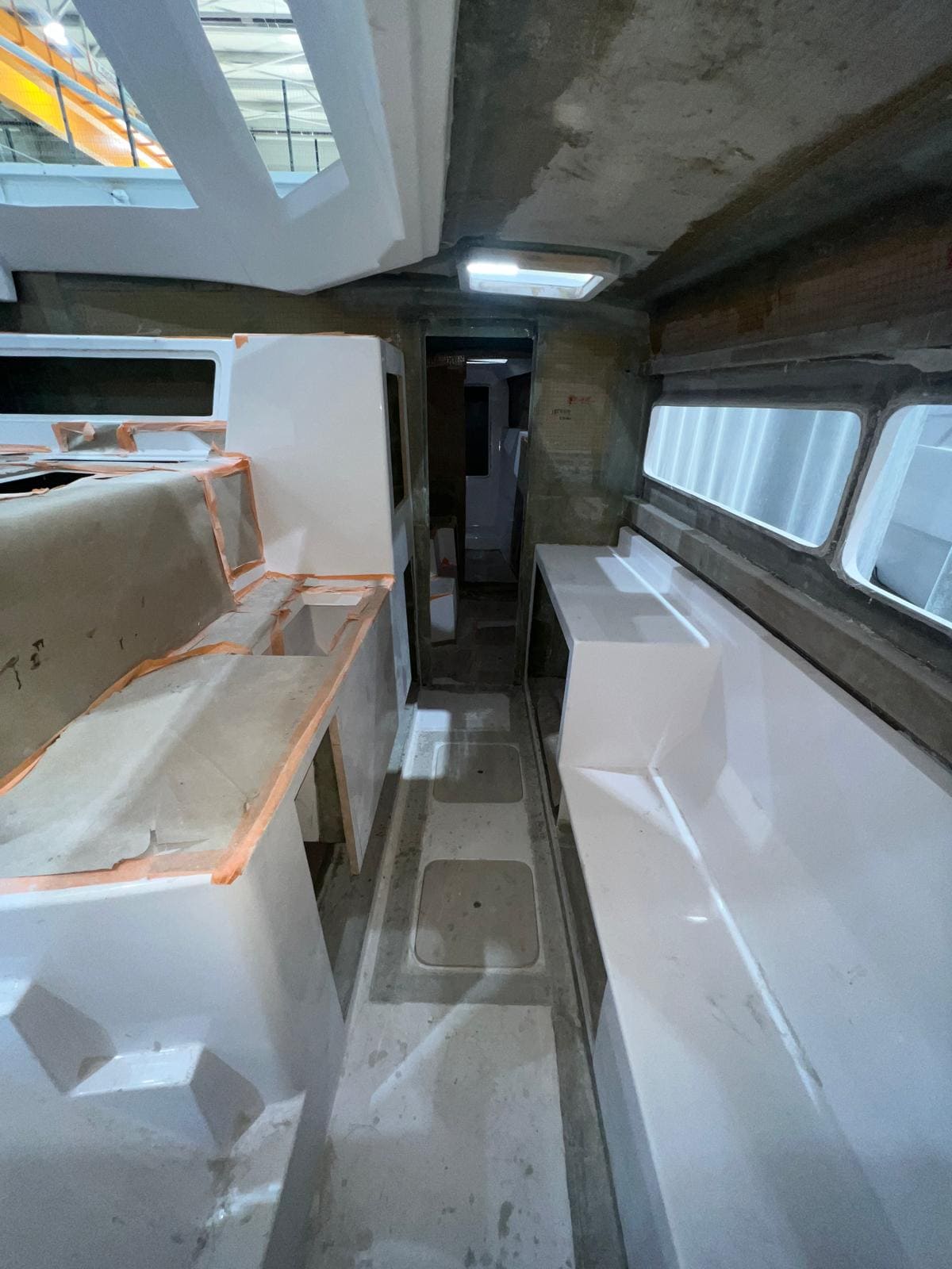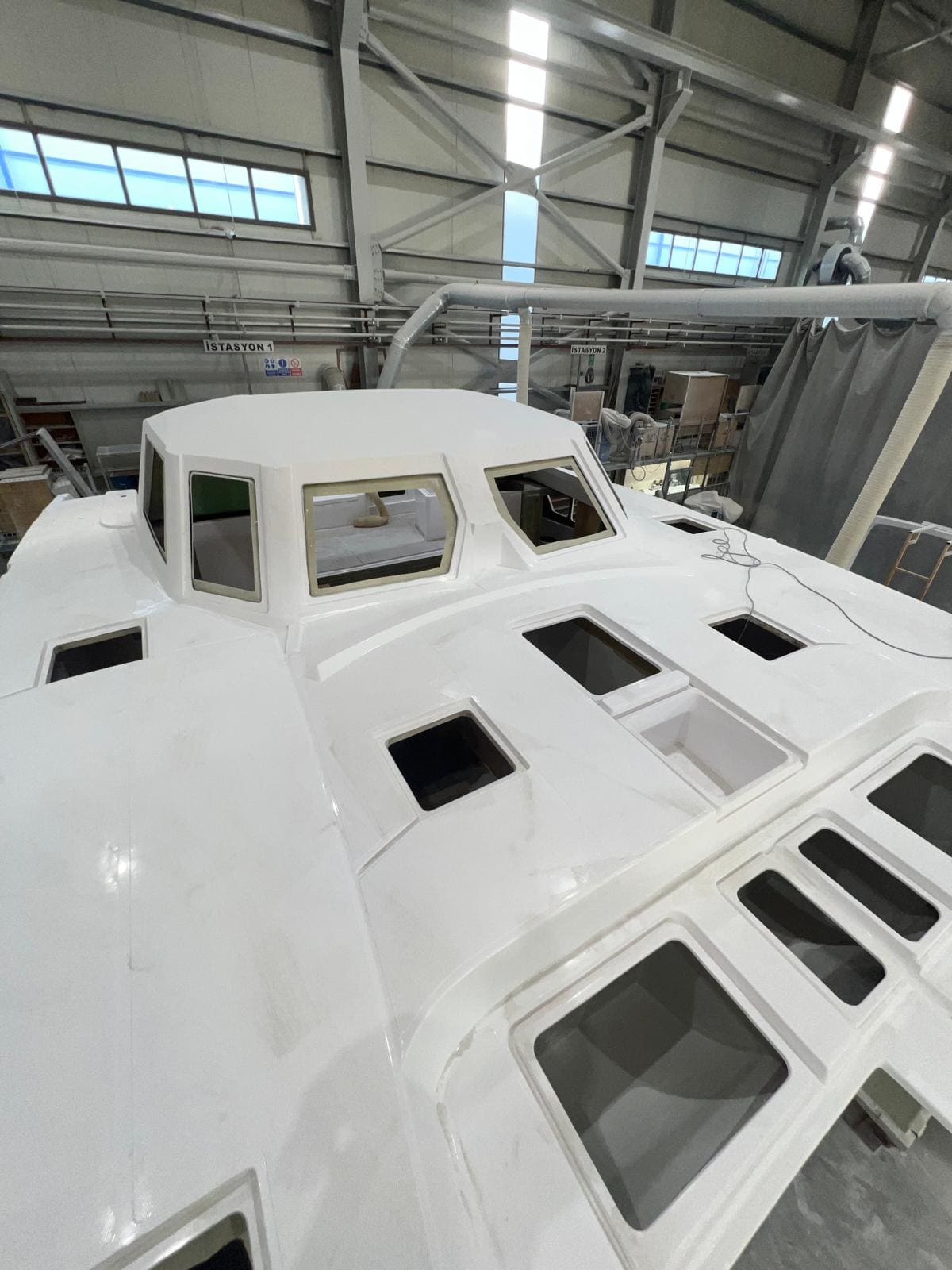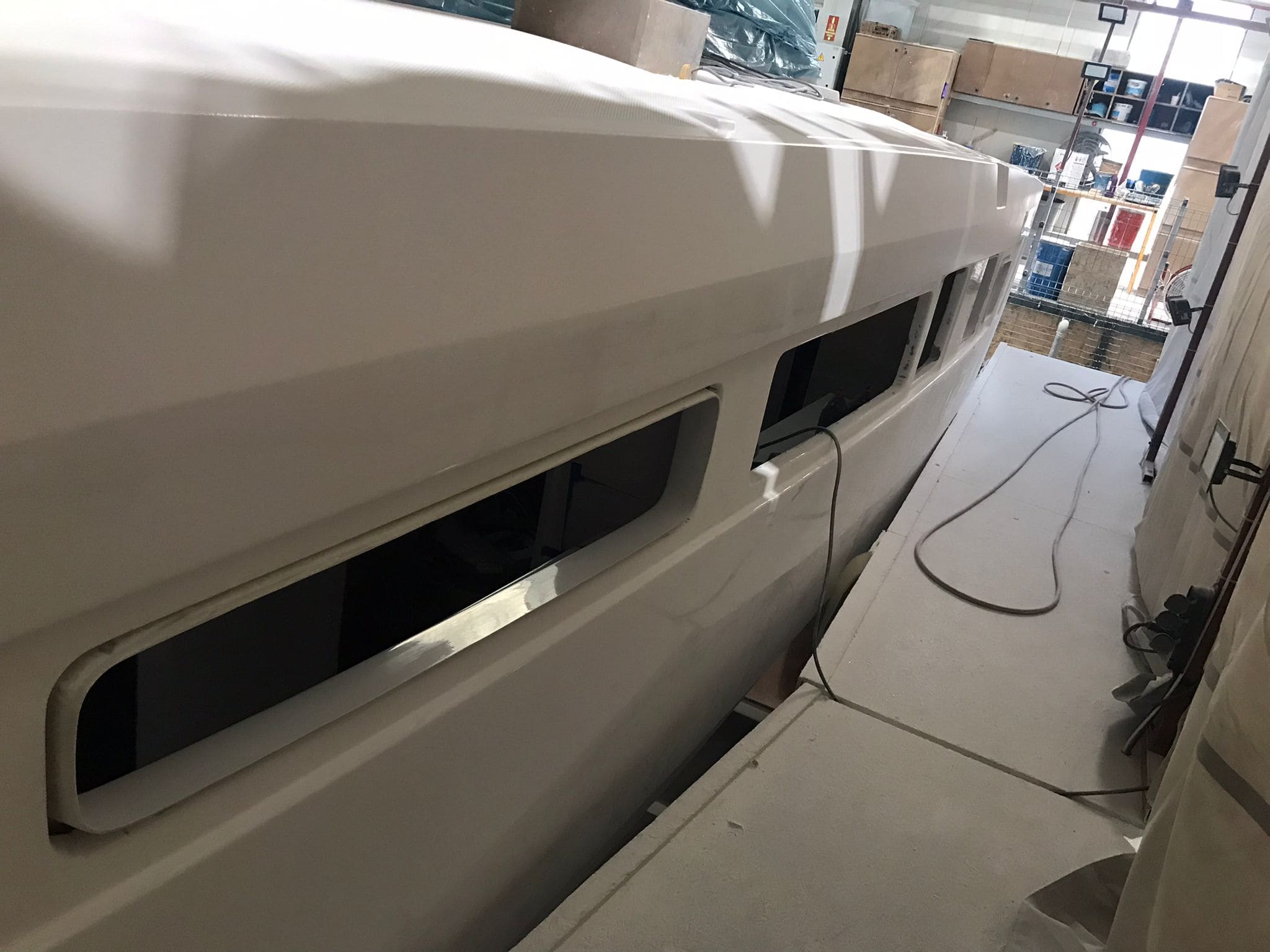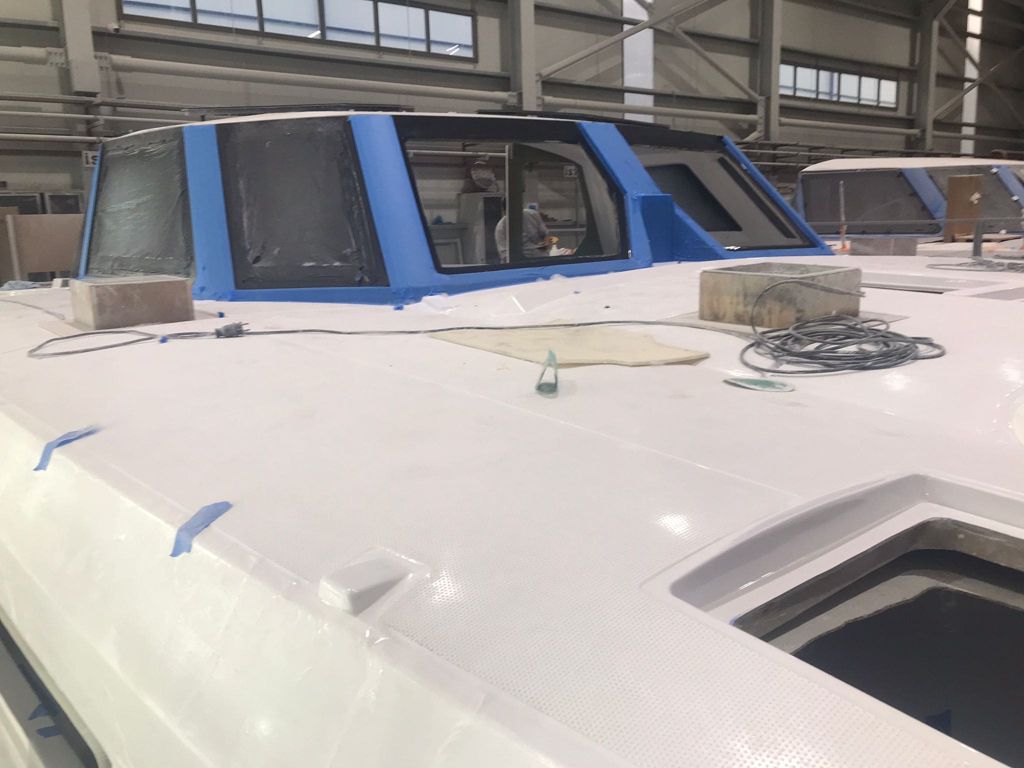 The boat has recently been equipped with some critical parts to get closer to Detailing & QA stage. At this point, we have completed the hull–deck interior laminations as well as the exterior and interior gelcoat repairs. The windows, fuel system, and bilge system have also been installed.