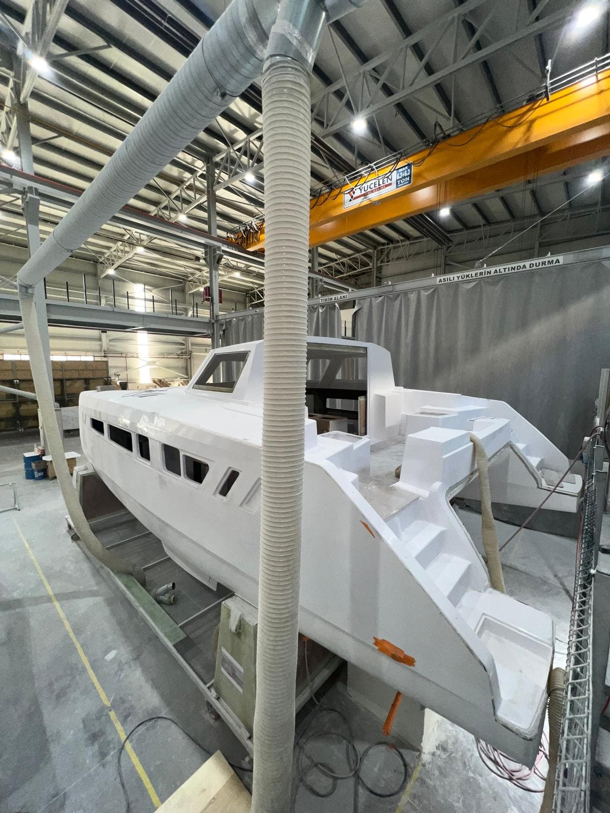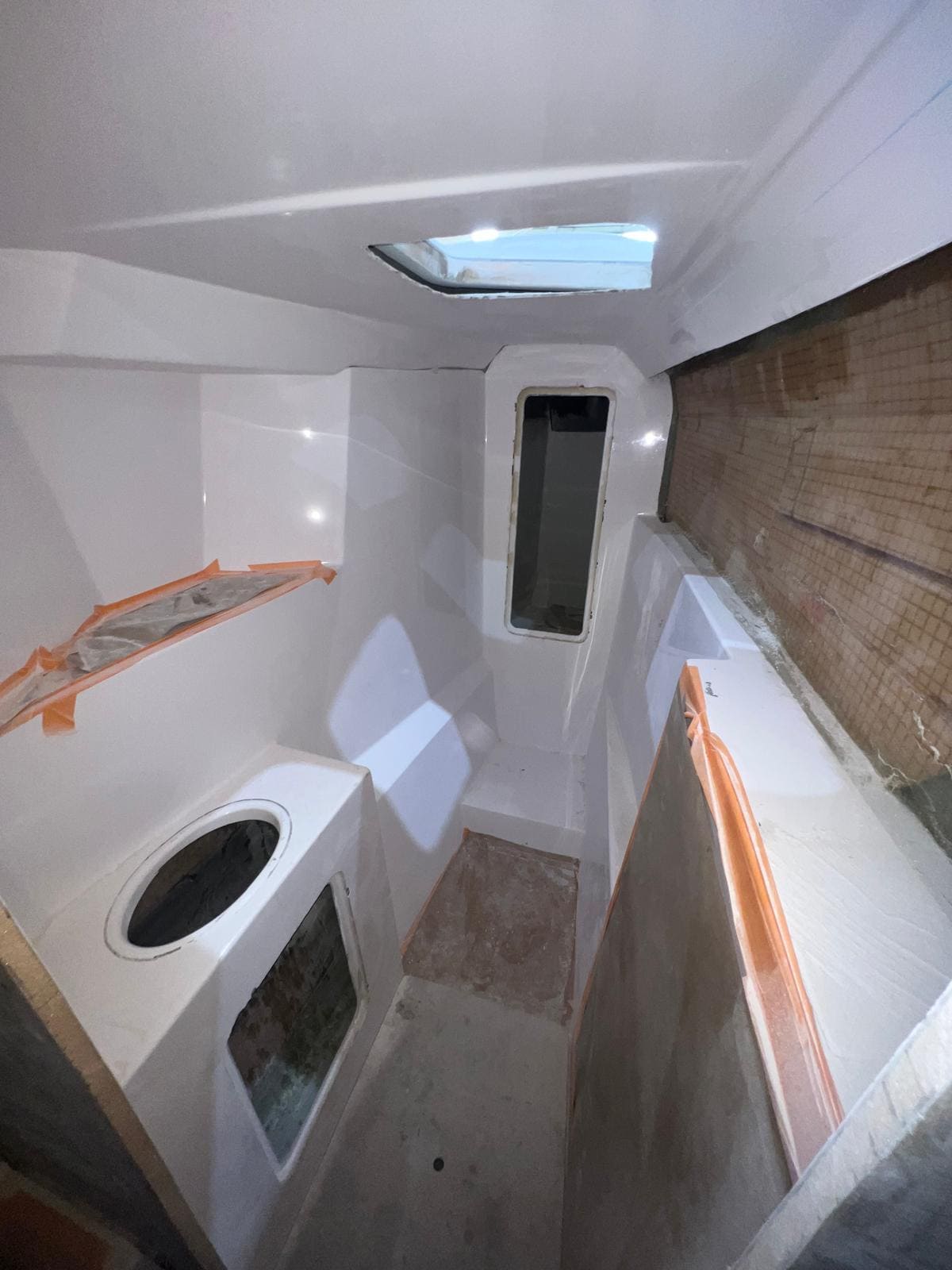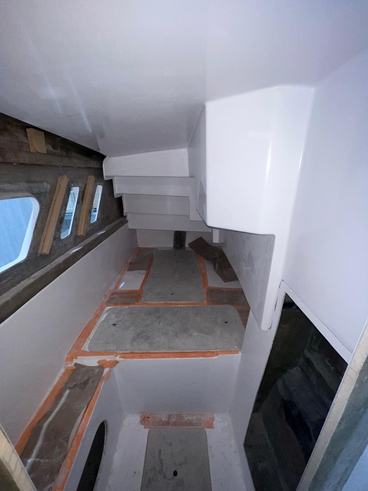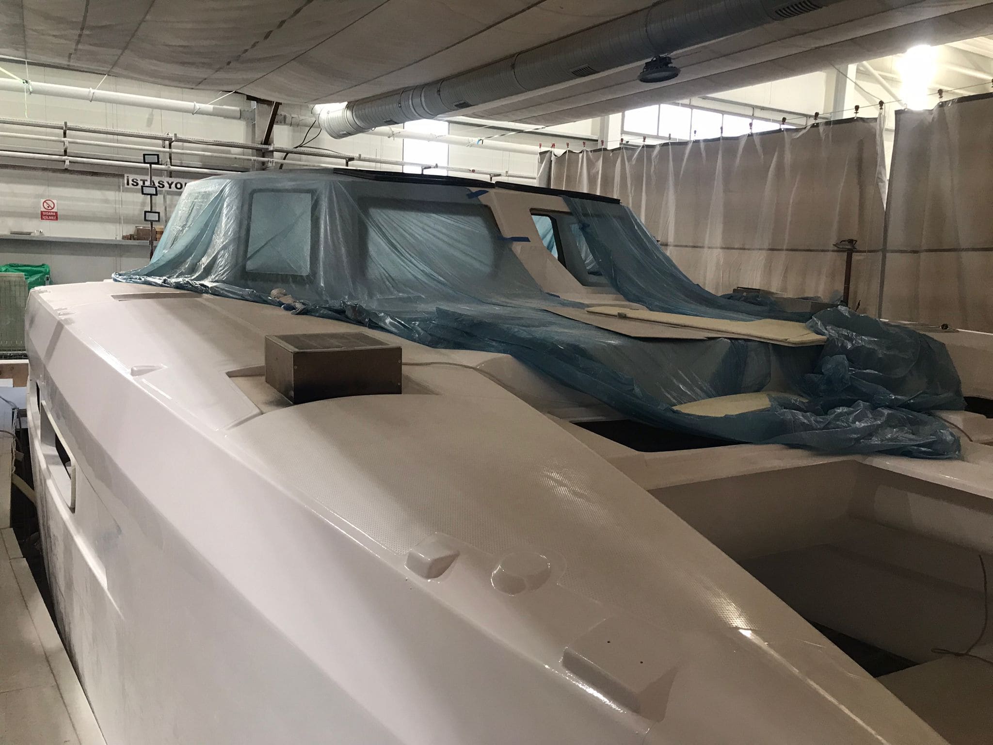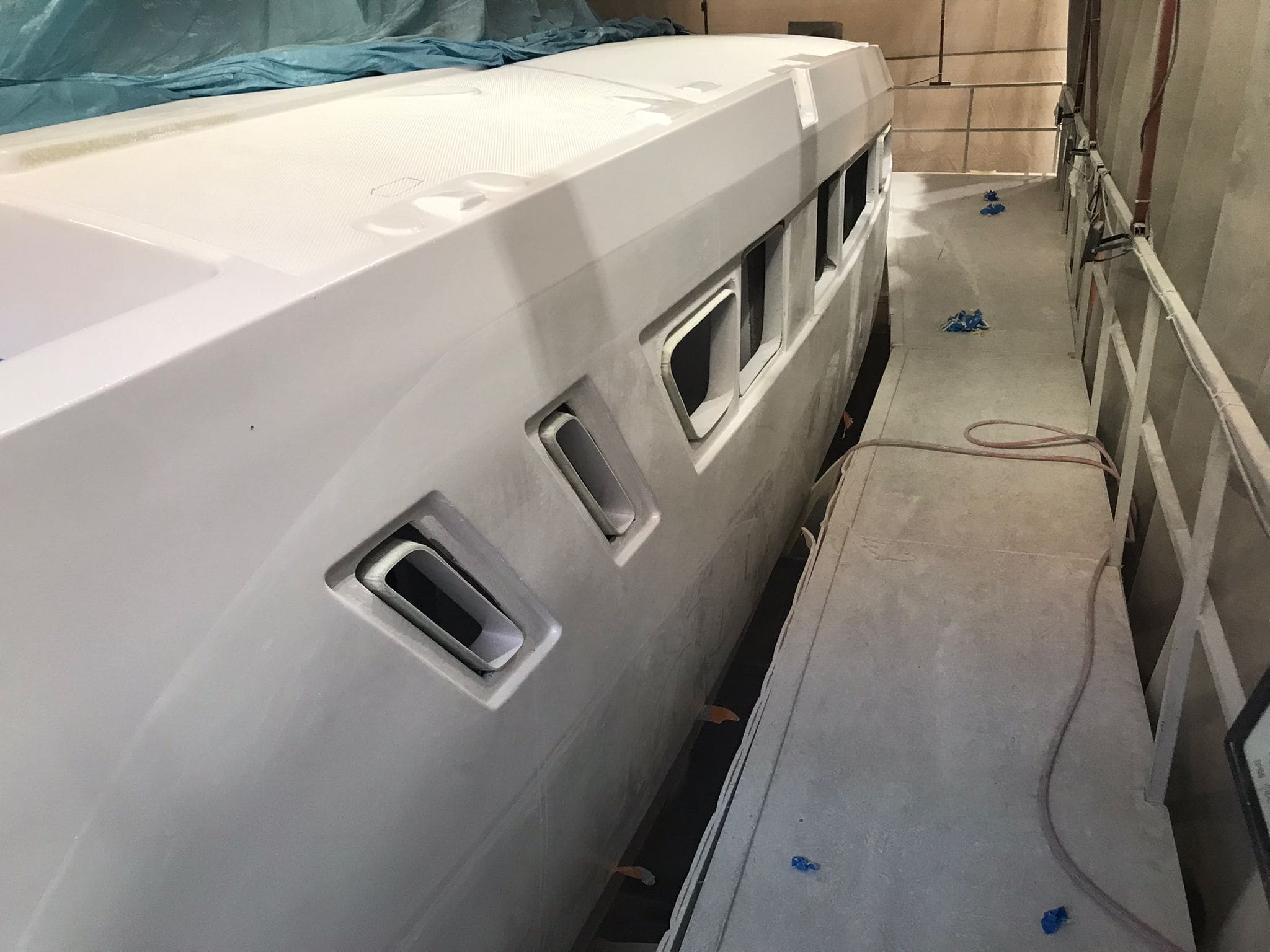 The boat has recently been equipped with some critical parts to get closer to Detailing & QA stage. At this point, we have completed the hull–deck interior laminations as well as the exterior and interior gelcoat repairs. The windows, fuel system, and bilge system have also been installed.