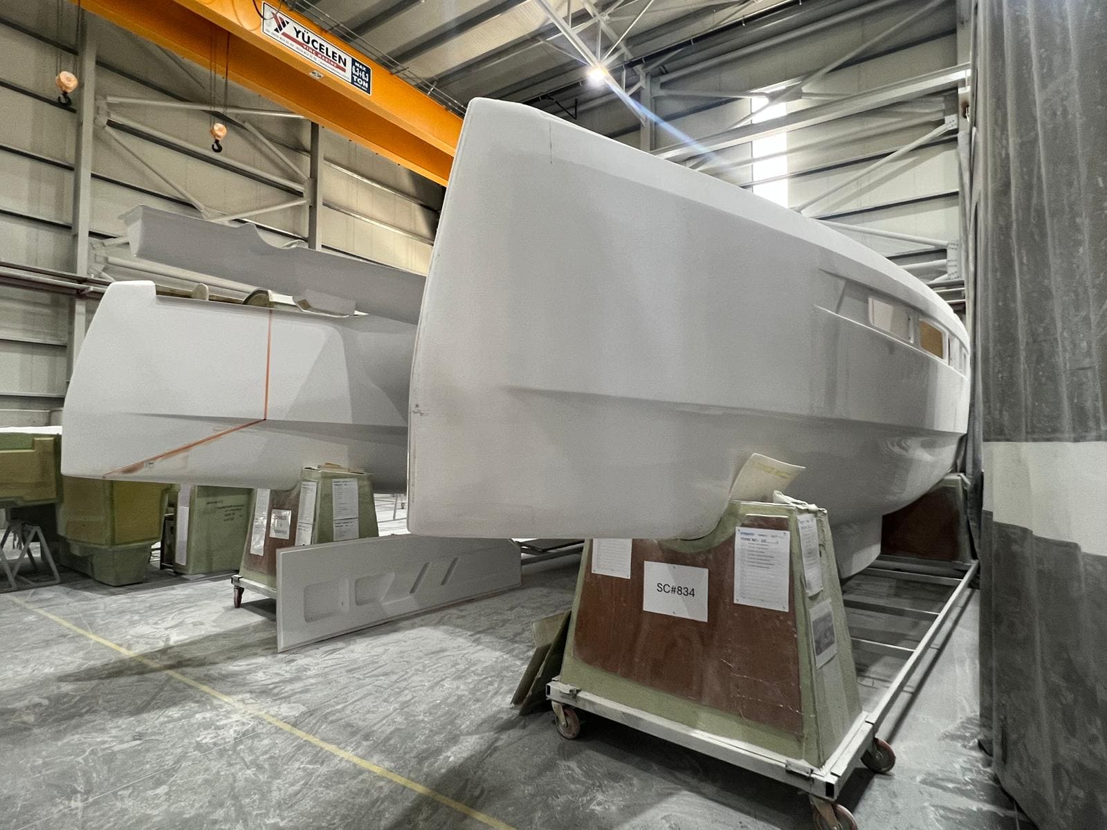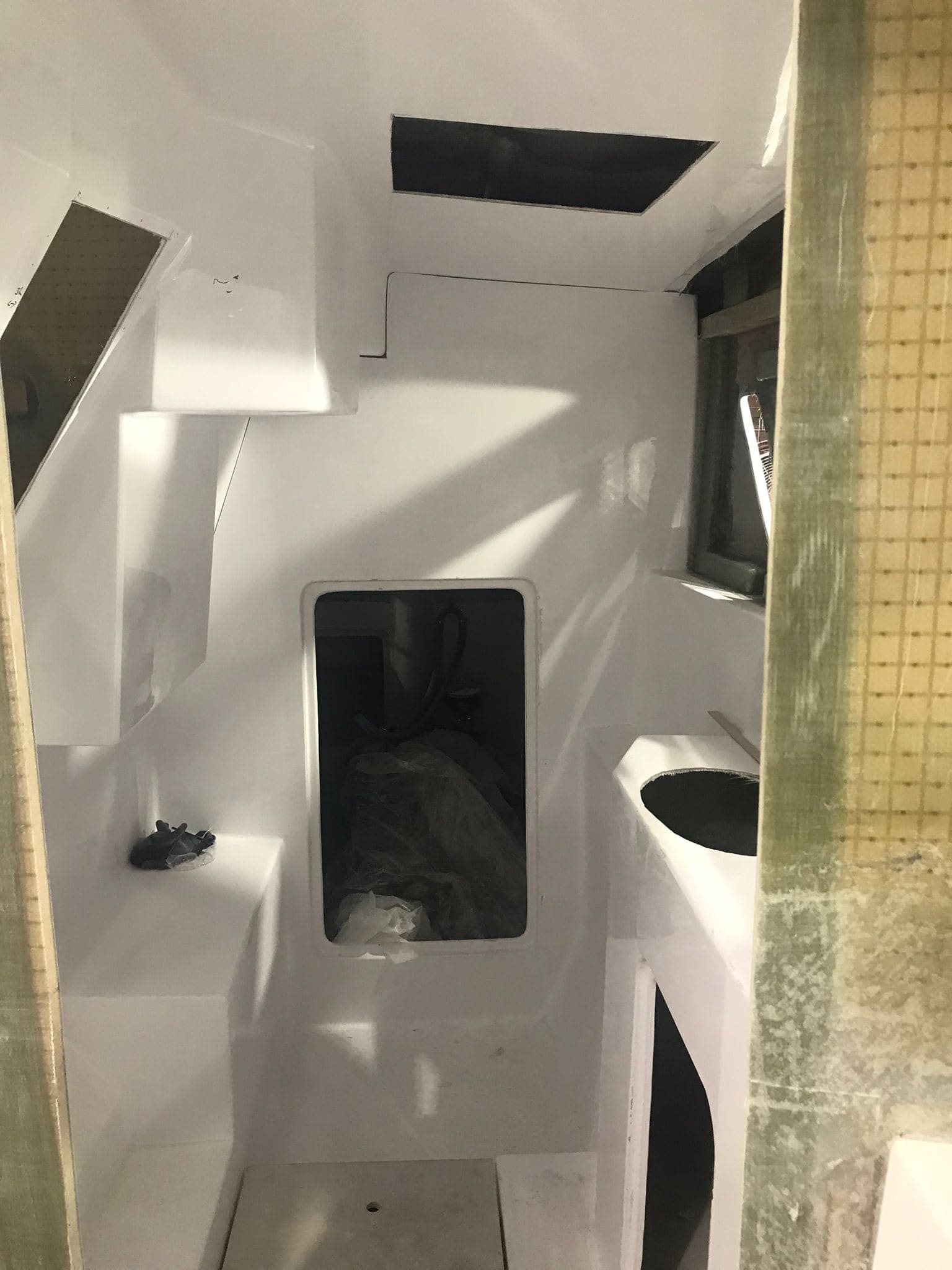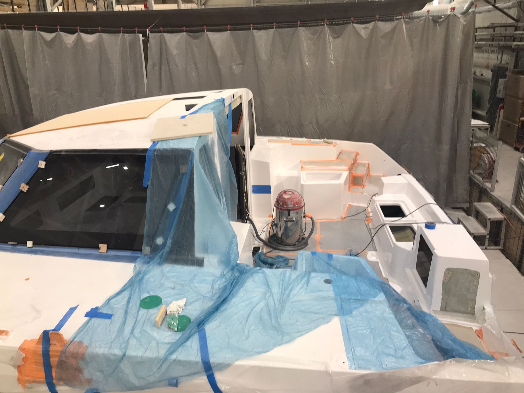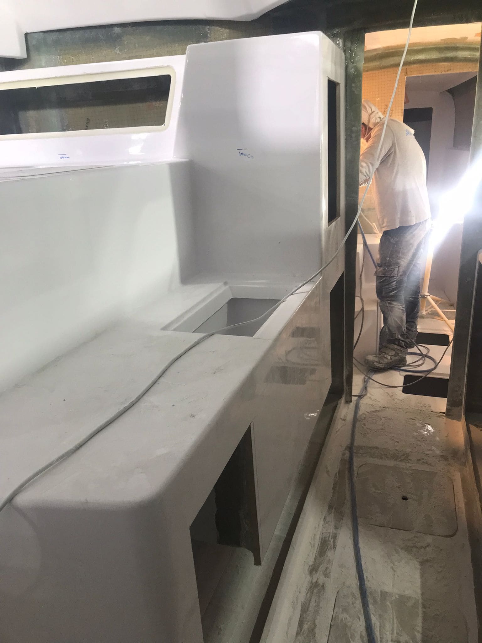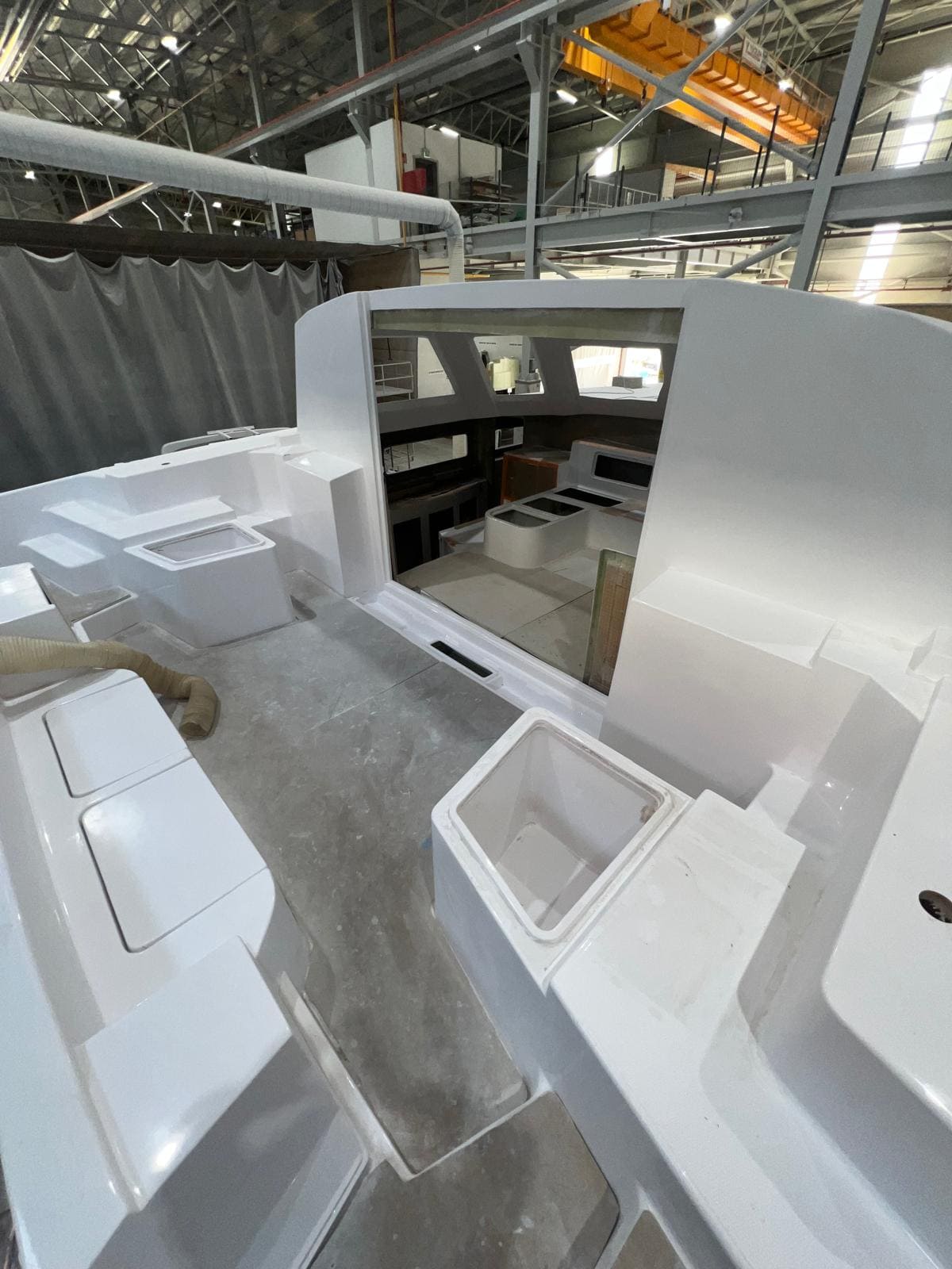 The boat has recently been equipped with some critical parts to get closer to Detailing & QA stage. At this point, we have completed the hull–deck interior laminations as well as the exterior and interior gelcoat repairs. The windows, fuel system, and bilge system have also been installed.