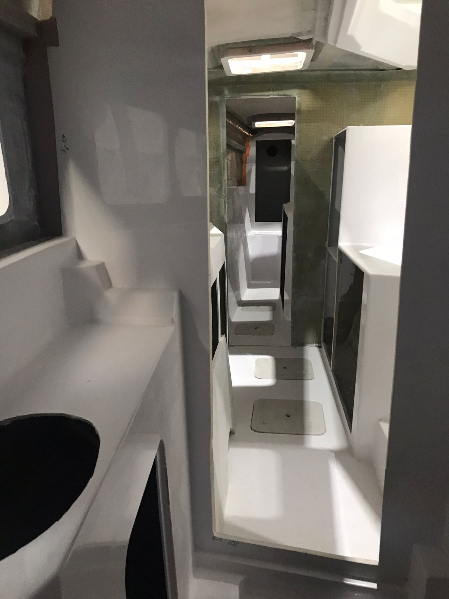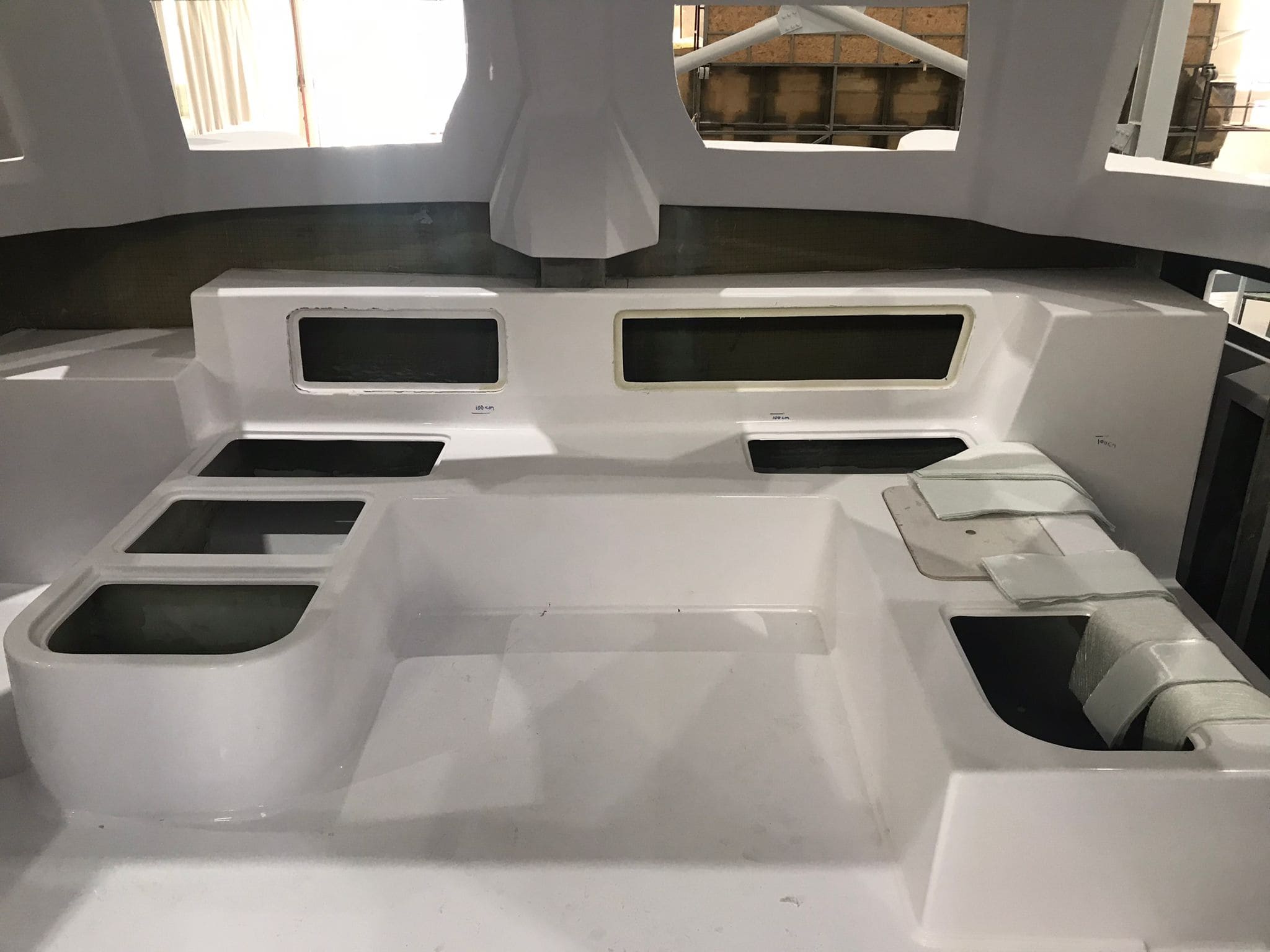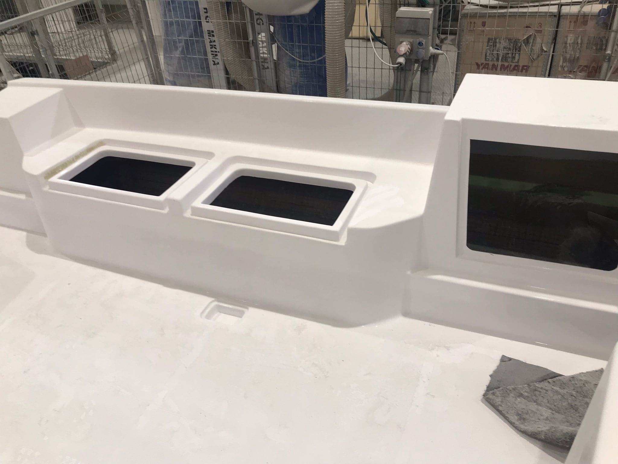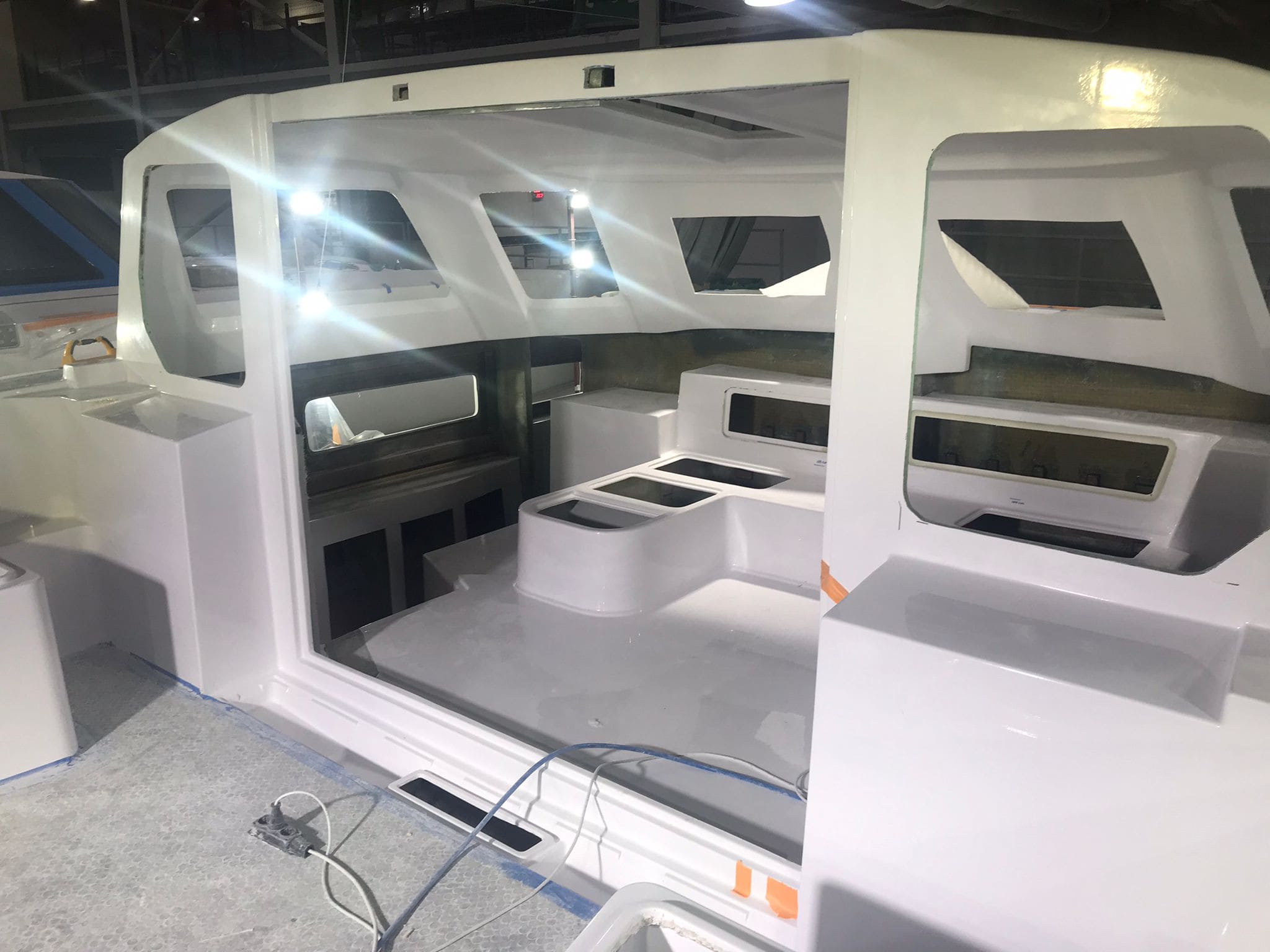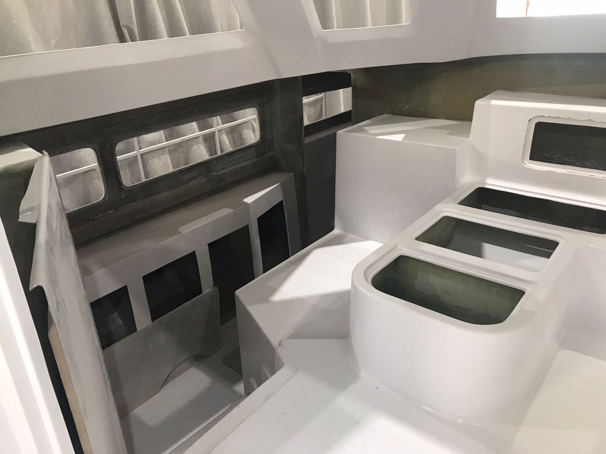 At this point, the hull and deck laminations have been completed, and the exterior gelcoat repairs are scheduled for completion this week. We are now working on the interior gelcoat repairs.