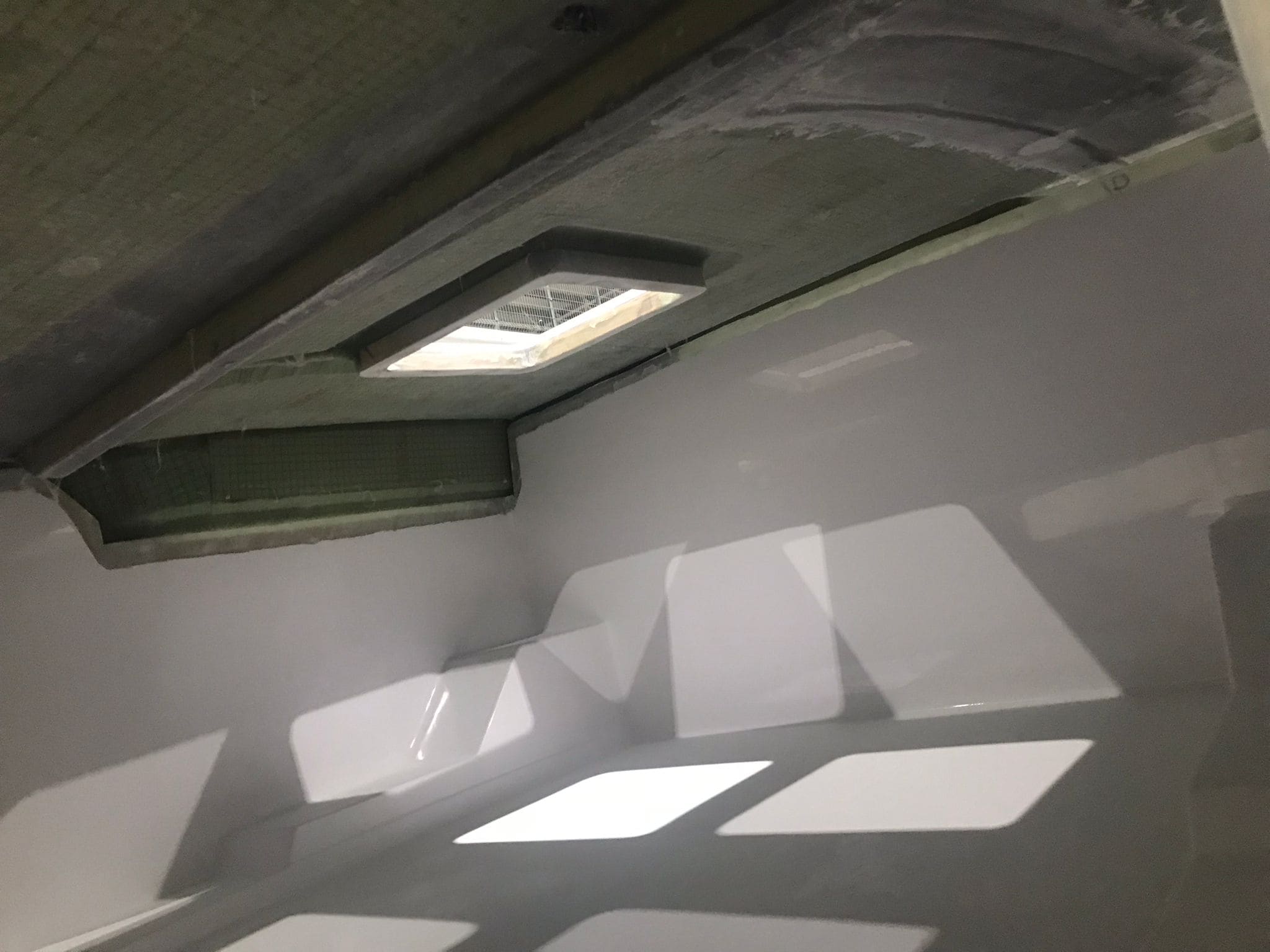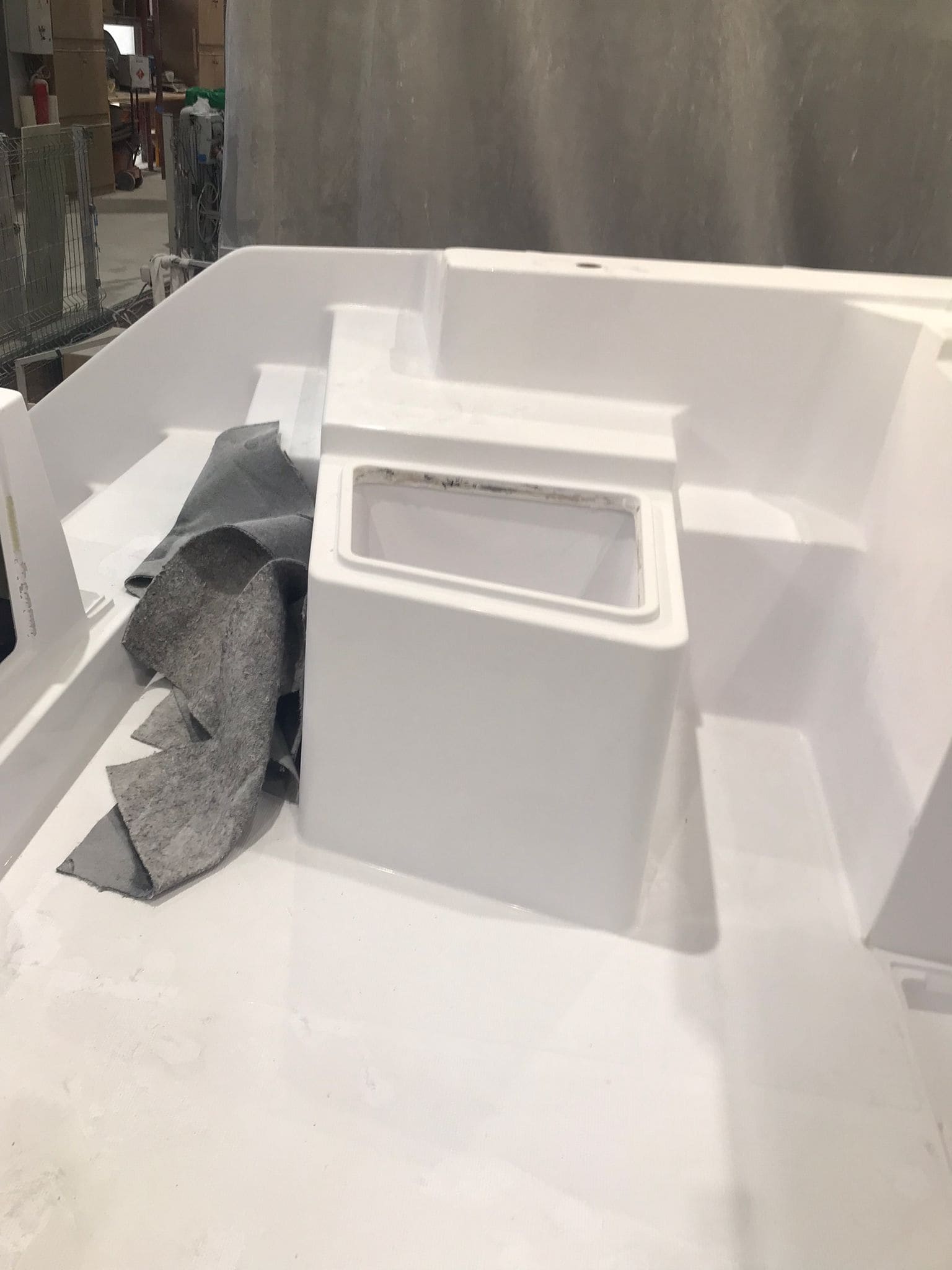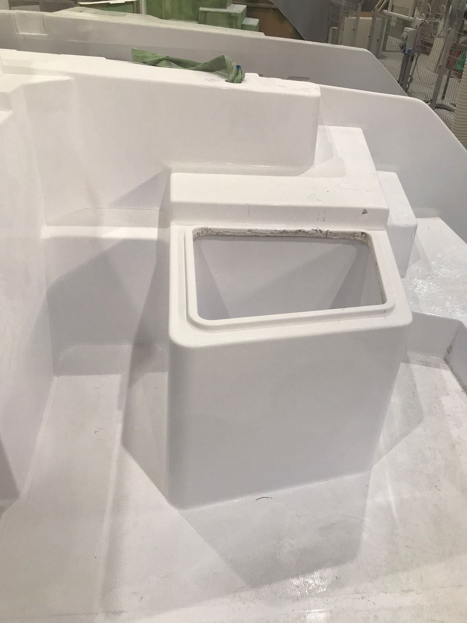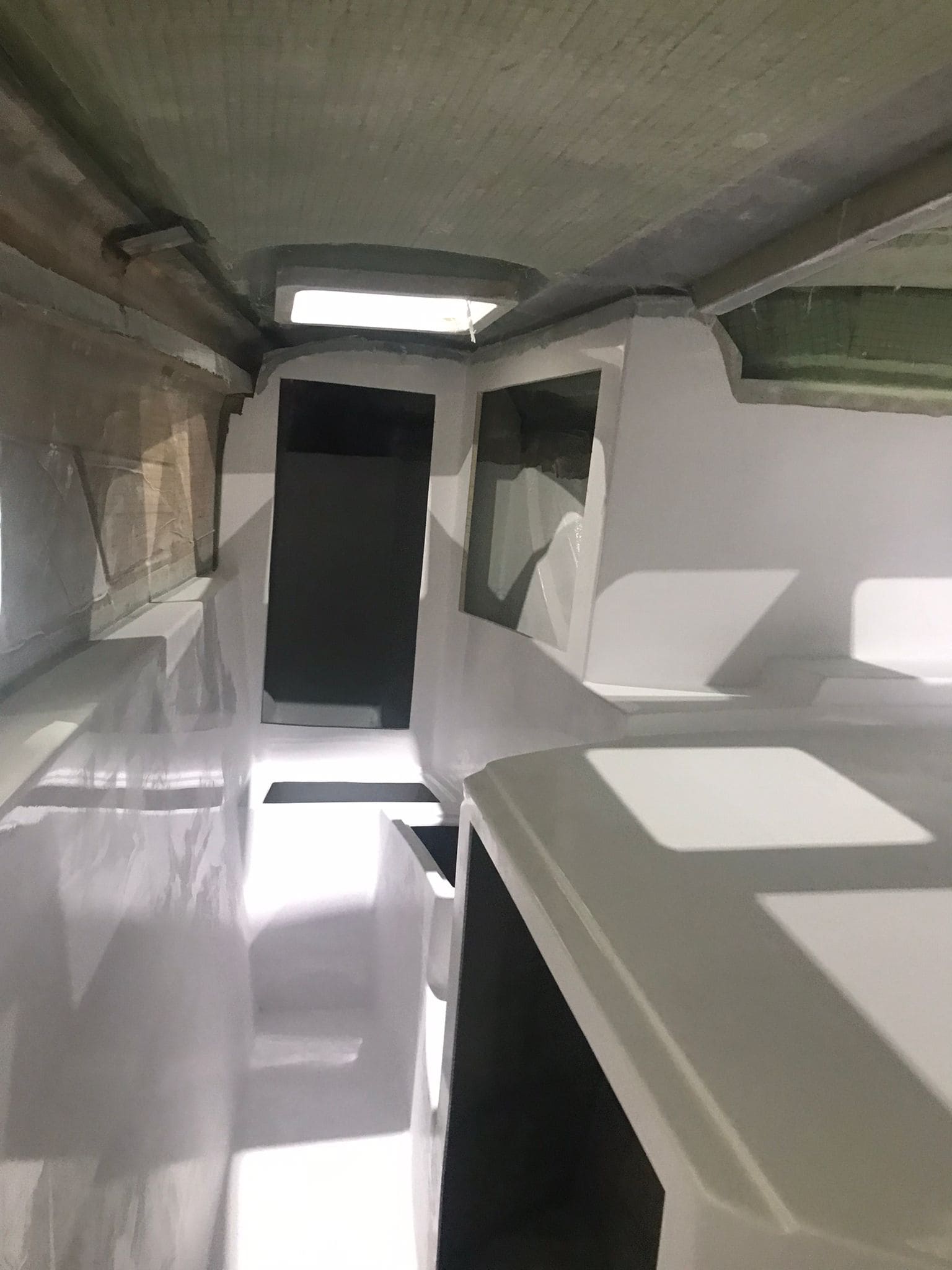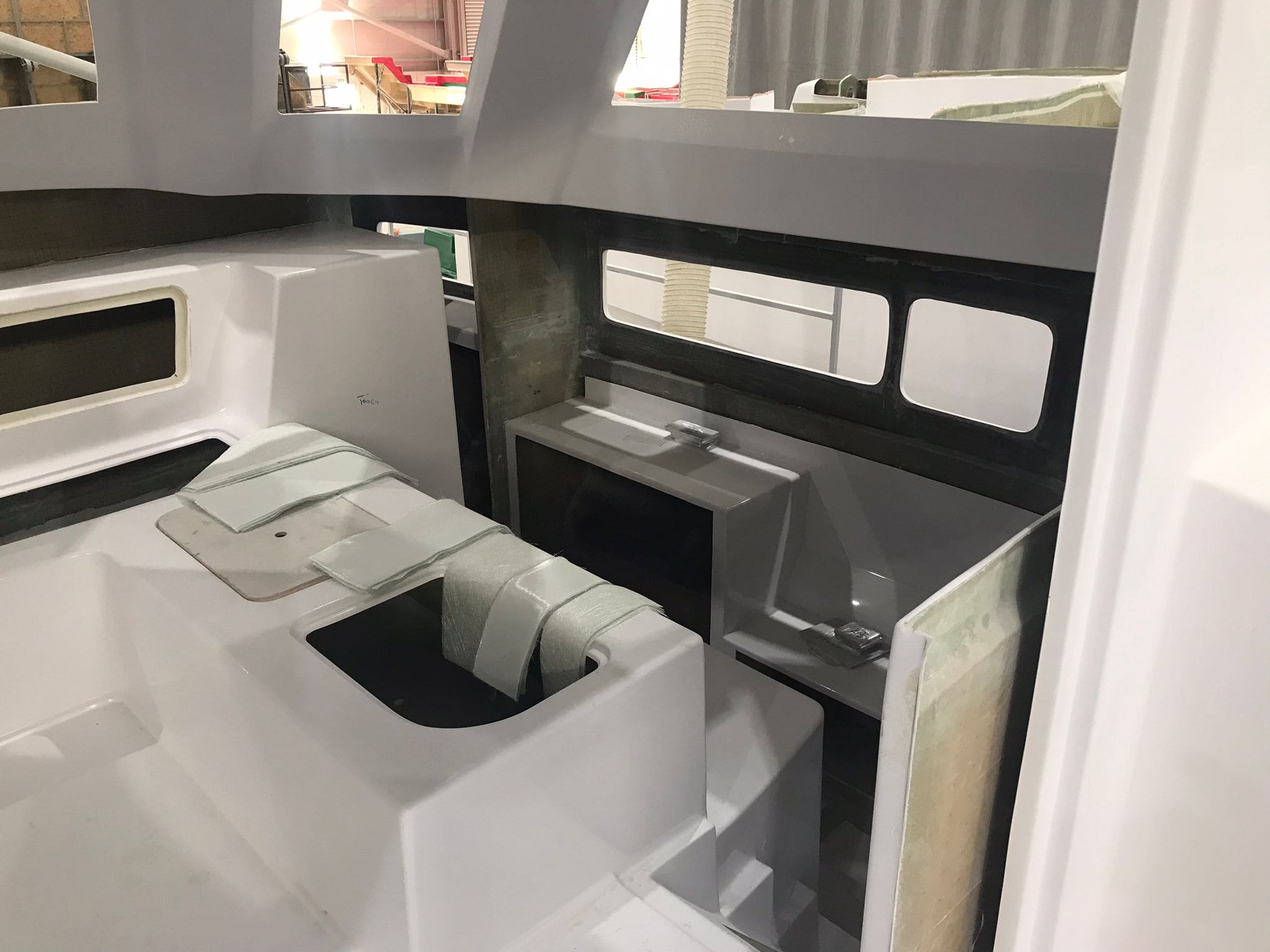 At this point, the hull and deck laminations have been completed, and the exterior gelcoat repairs are scheduled for completion this week. We are now working on the interior gelcoat repairs.