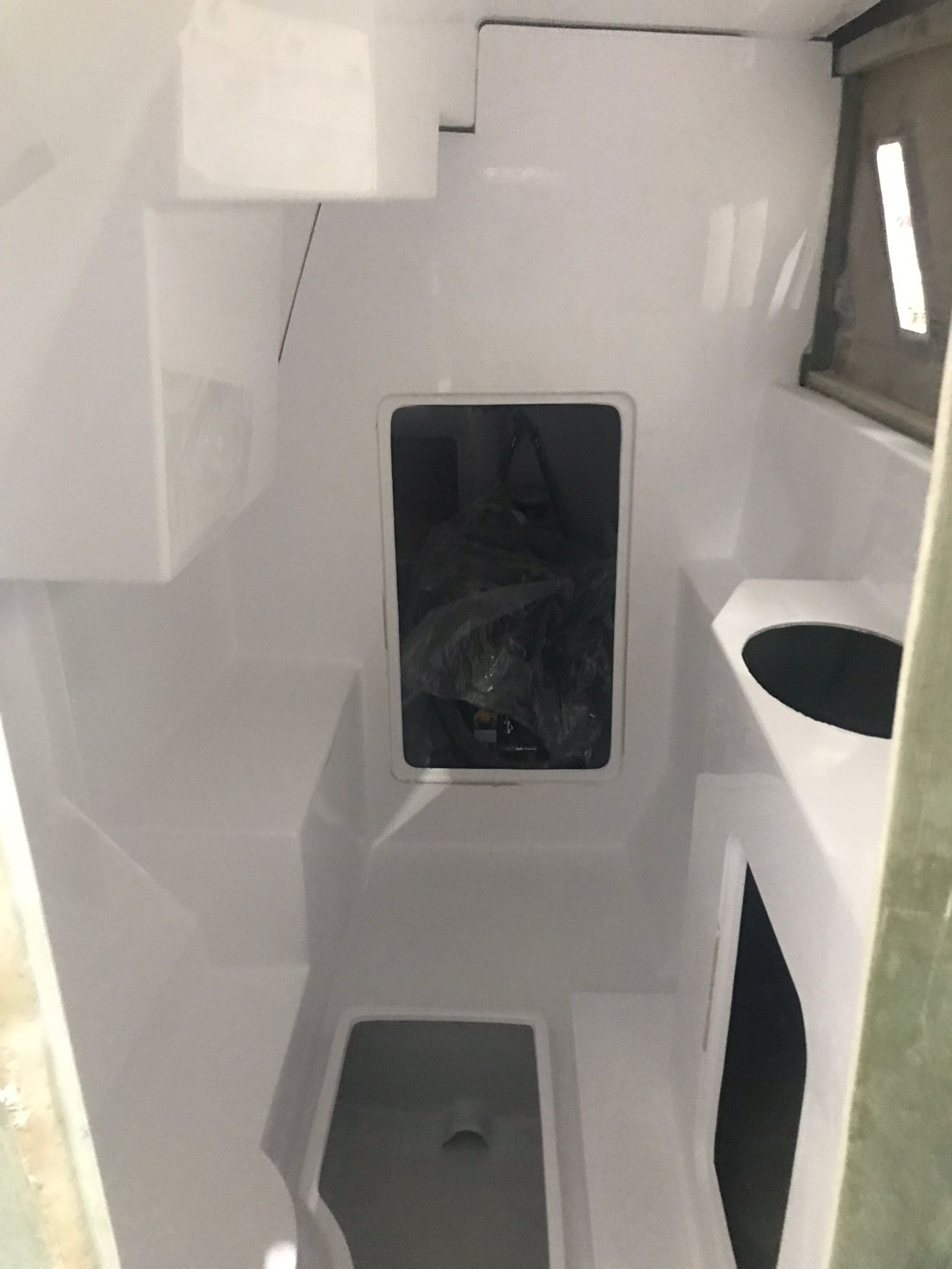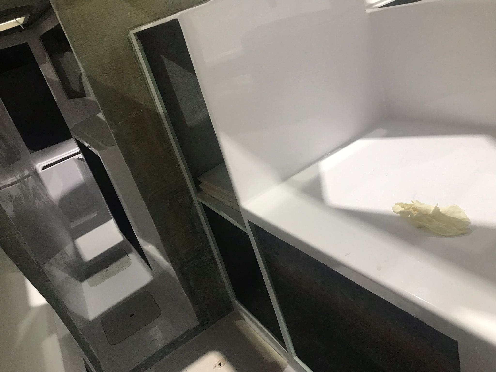 Ceiling liner installations in the starboard forward head, starboard aft cabin, and portside aft head have been completed. The center furniture and the lamination work in the starboard aft cabin have also been finalized. Besides, the starboard engine and exhaust system have been successfully installed. Installation of the port engine and exhaust system is scheduled to begin shortly.