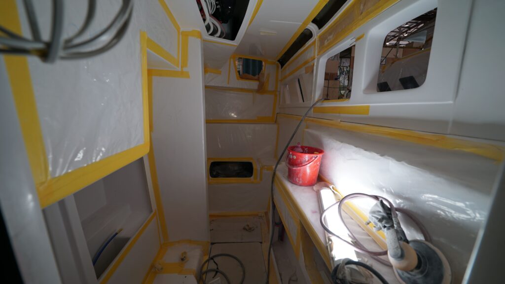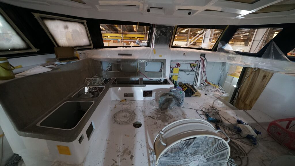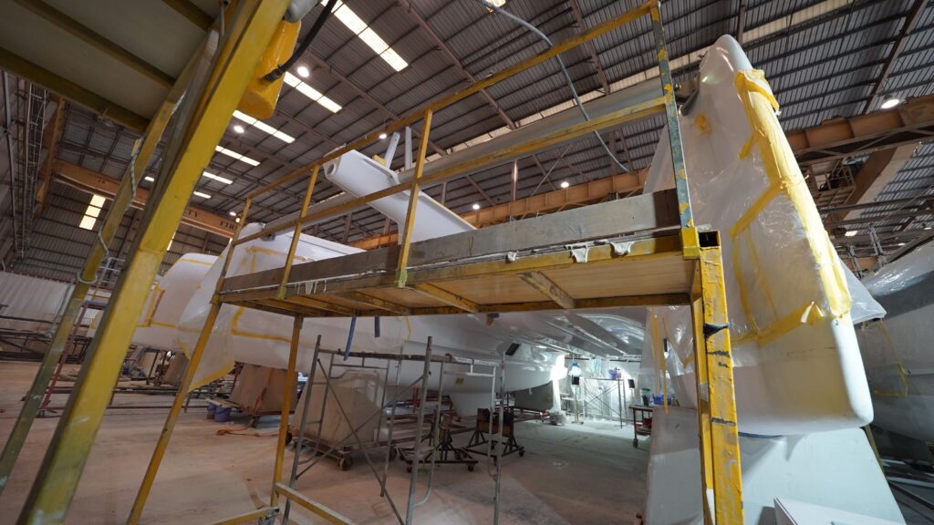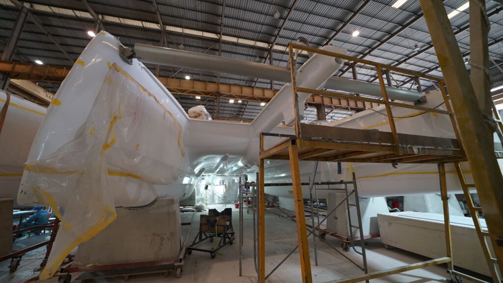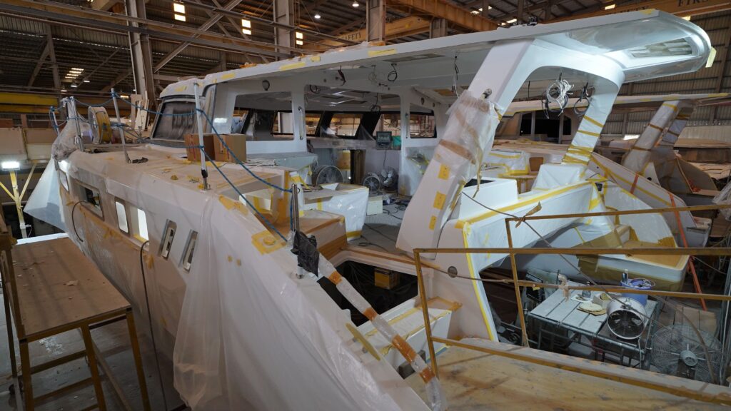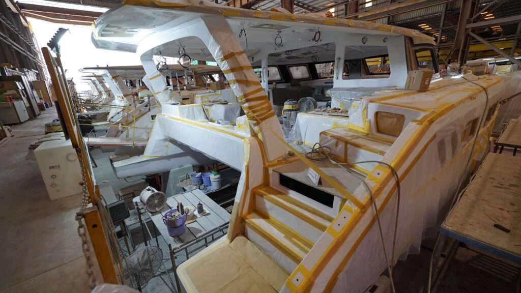 Our Production team is currently working on A-frame & beam (50%), electric work (15%), plumbing LPG at 15%, steering (20%), gelcoat (50%), stanchion at 25%, and deck hardware at 25%.