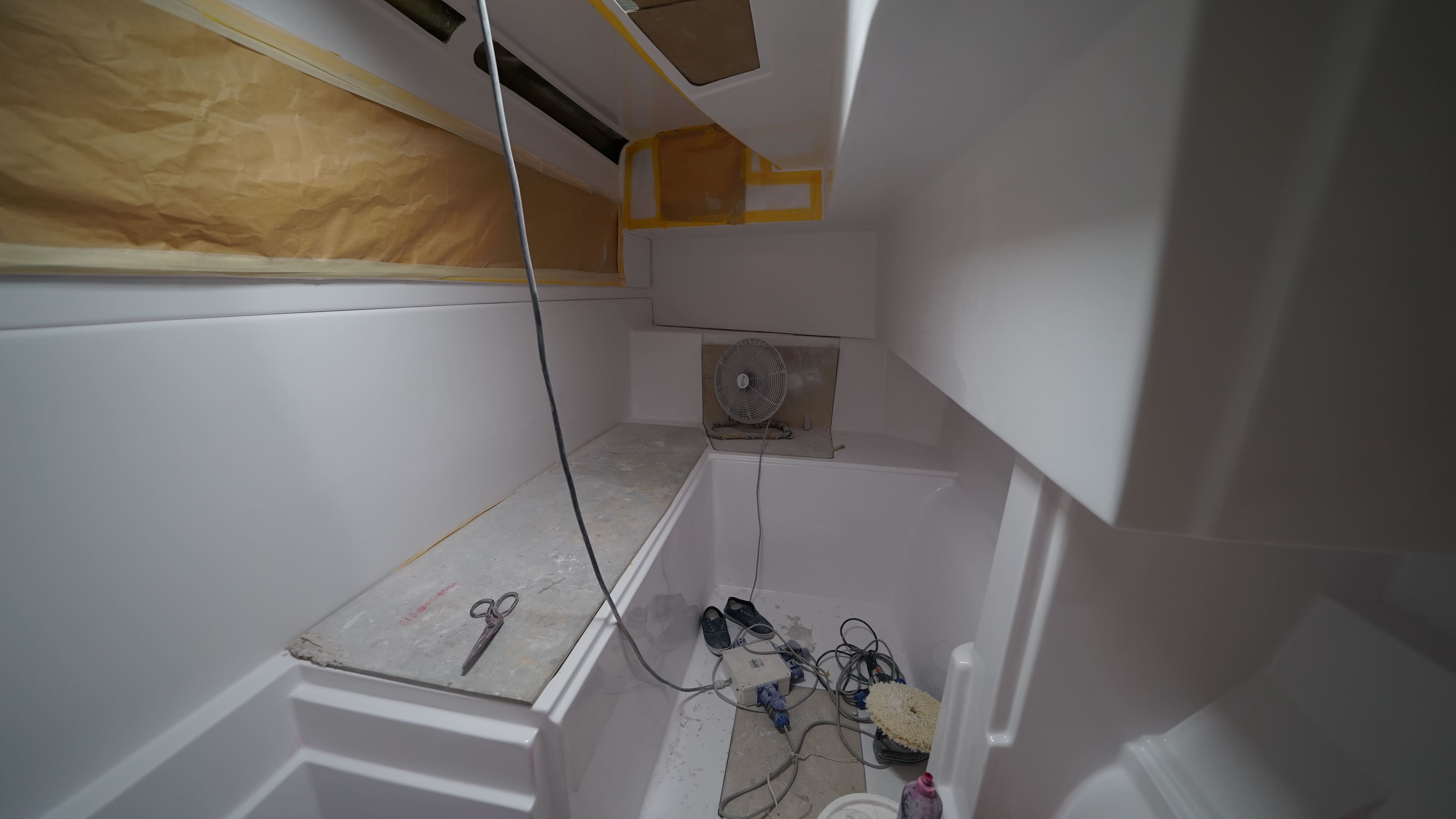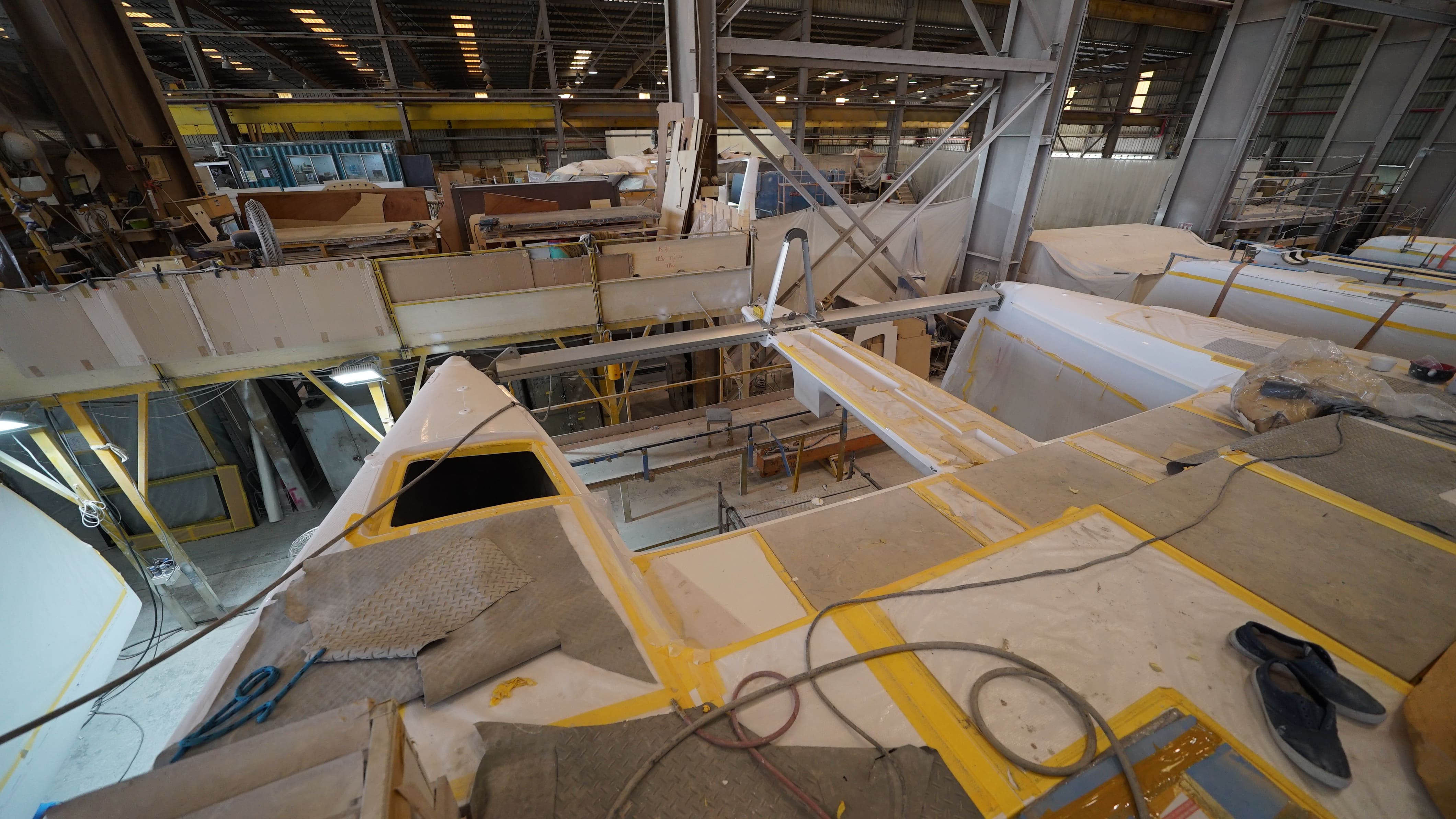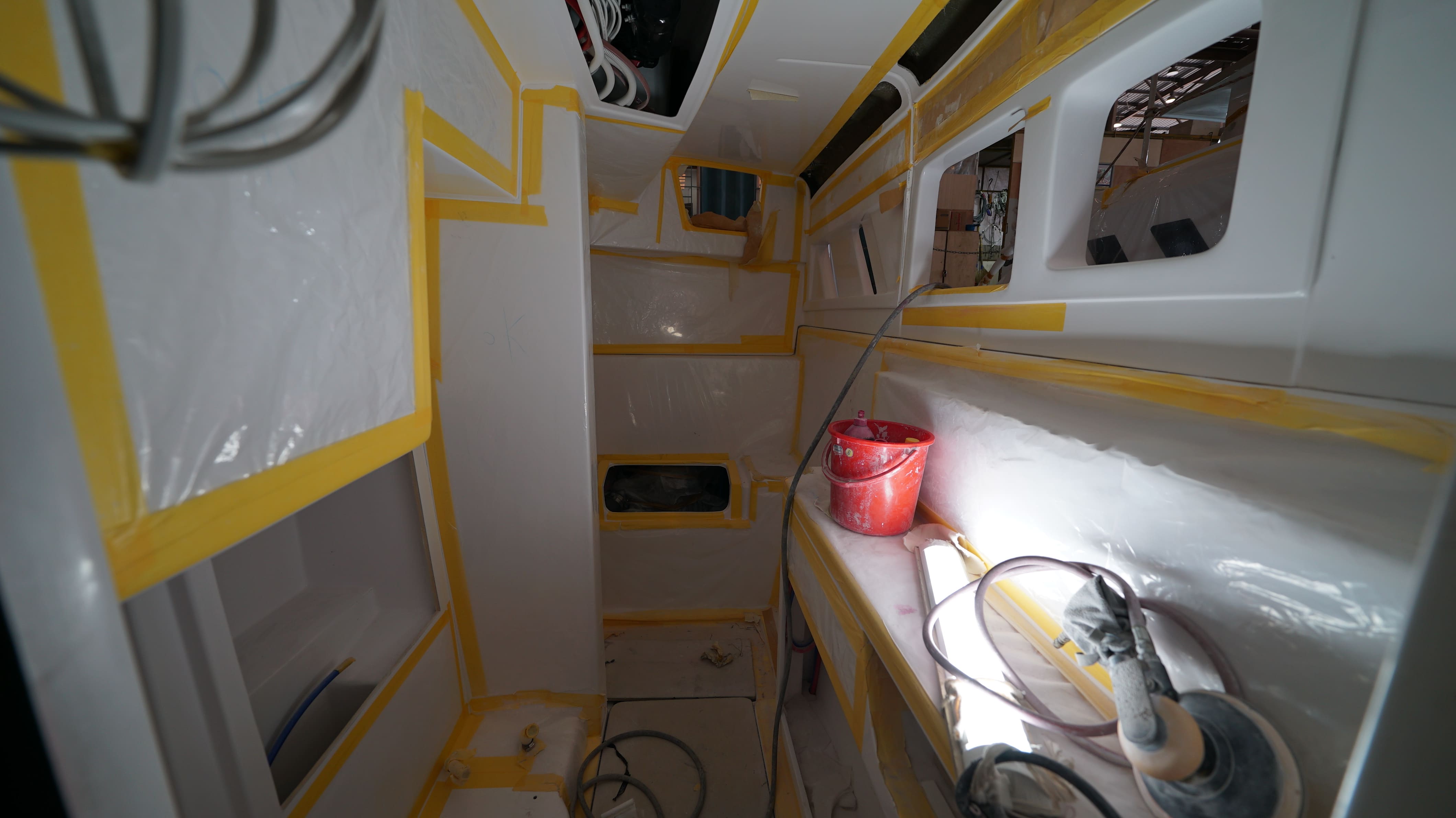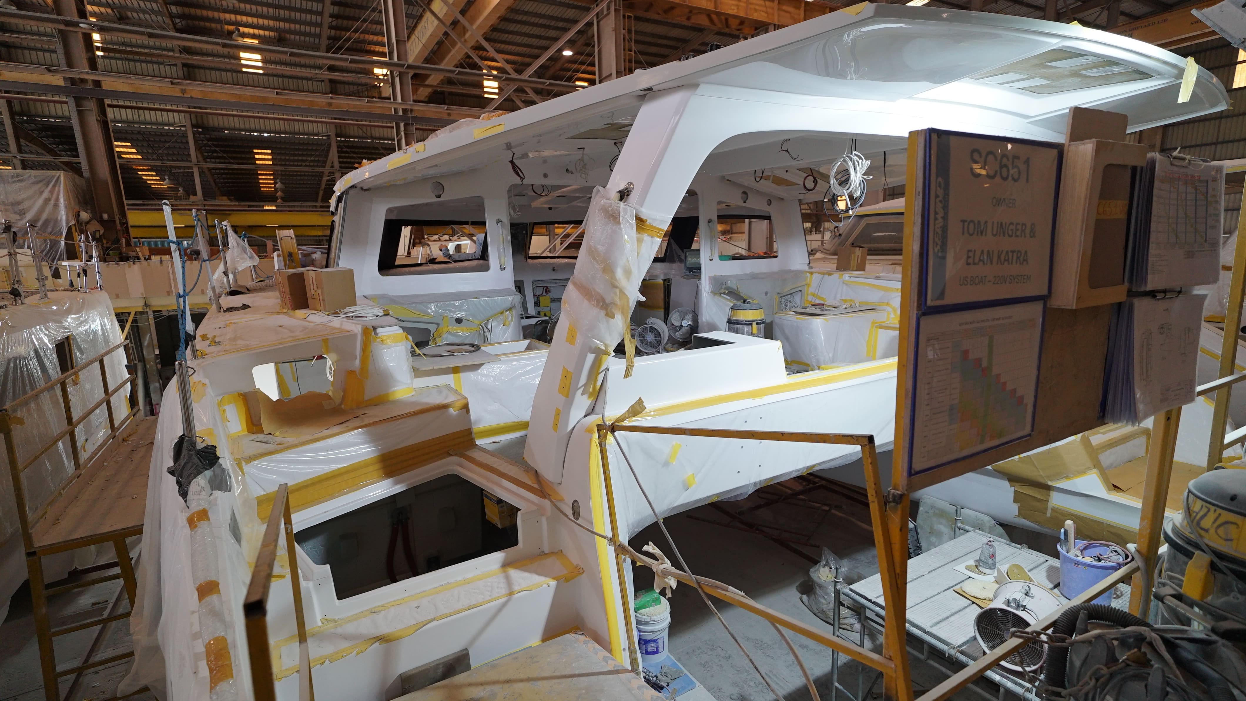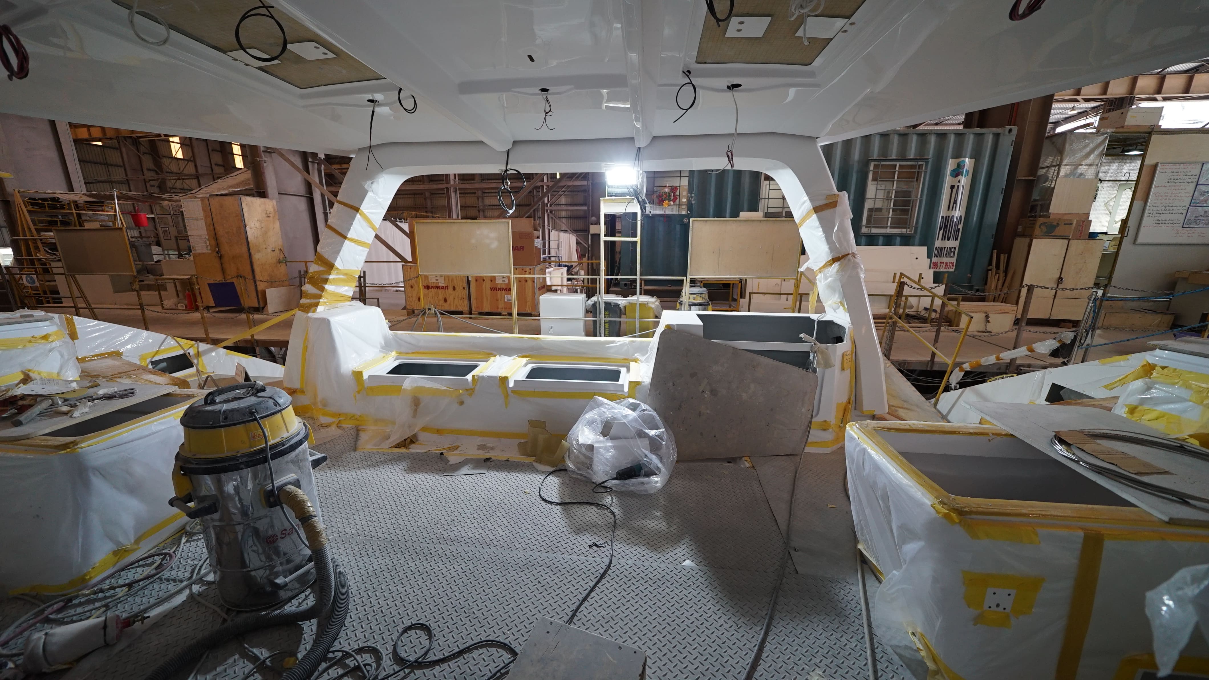 We recently complete the hull-deck joining, engines & saildrive installation.