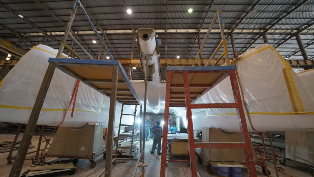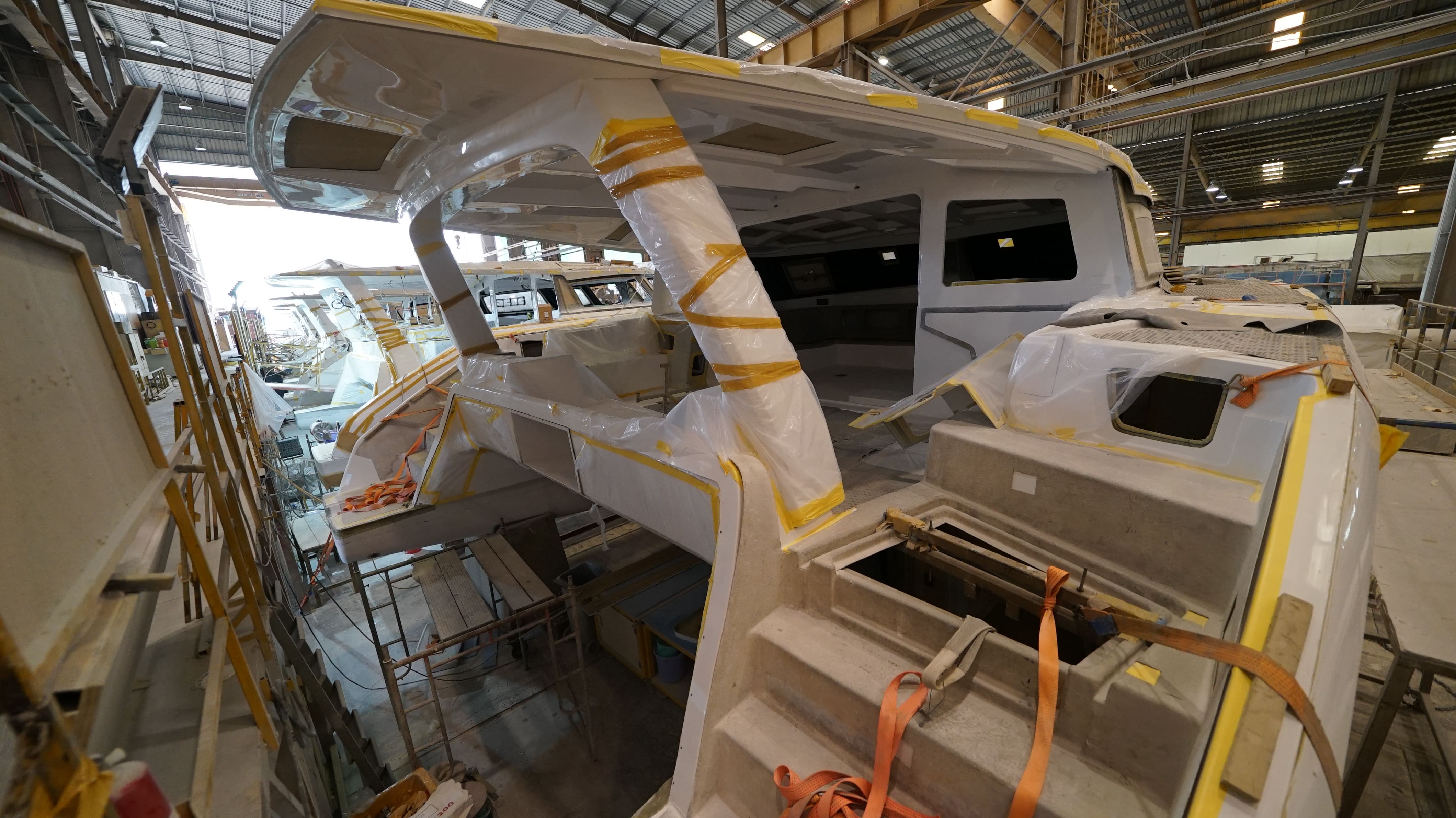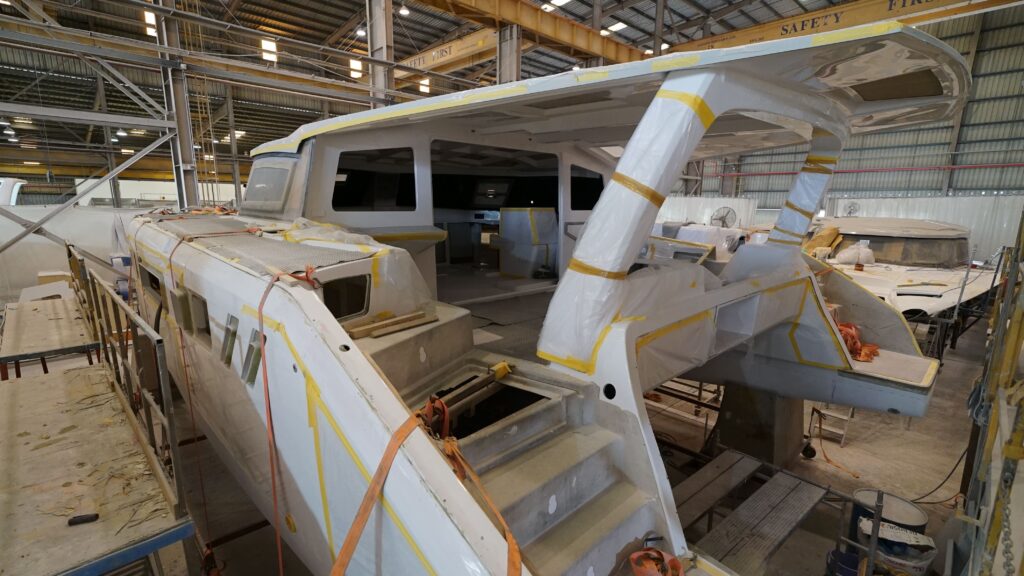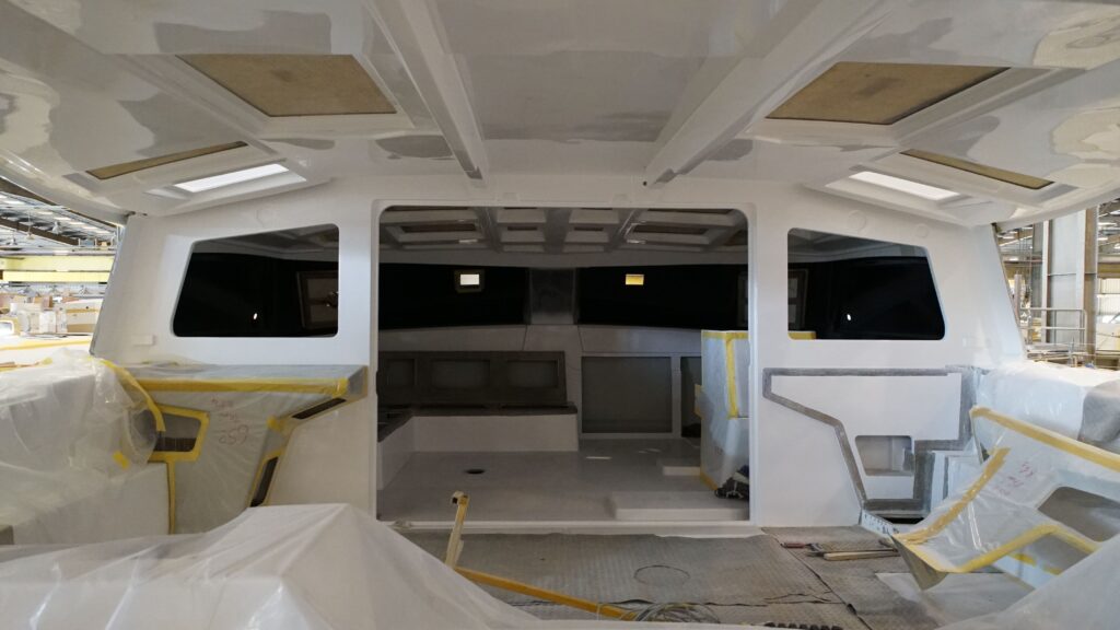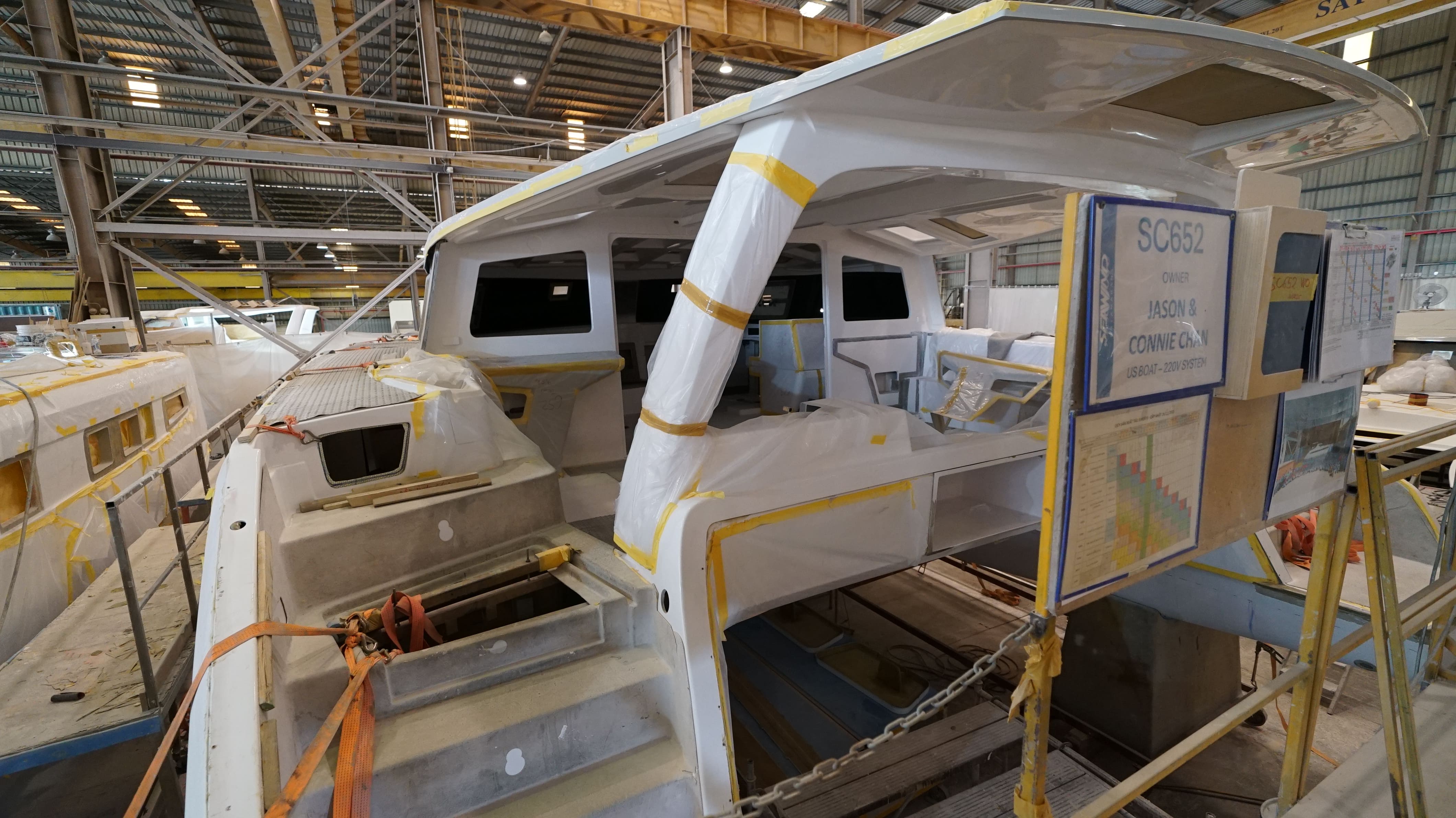 Posted on January 15, 2026January 15, 2026 by updatesProduction Update – Assembly Your boat is progressing well in the Assembly stage. Being moved to the main 1370 production line, the hull and deck were joined last week. Our Production team is currently working on gelcoat repair, LPG plumbing, and electrical wiring.