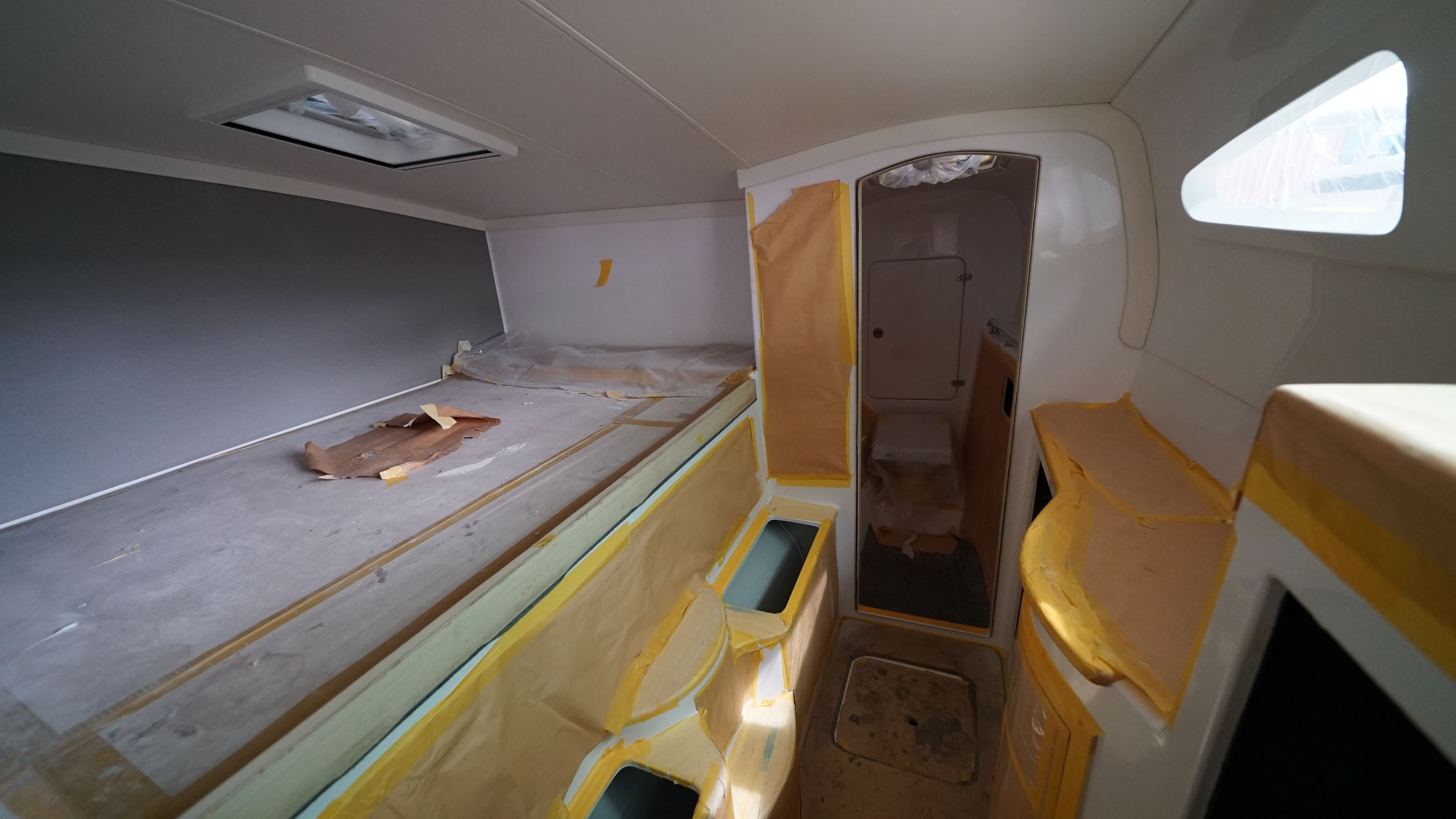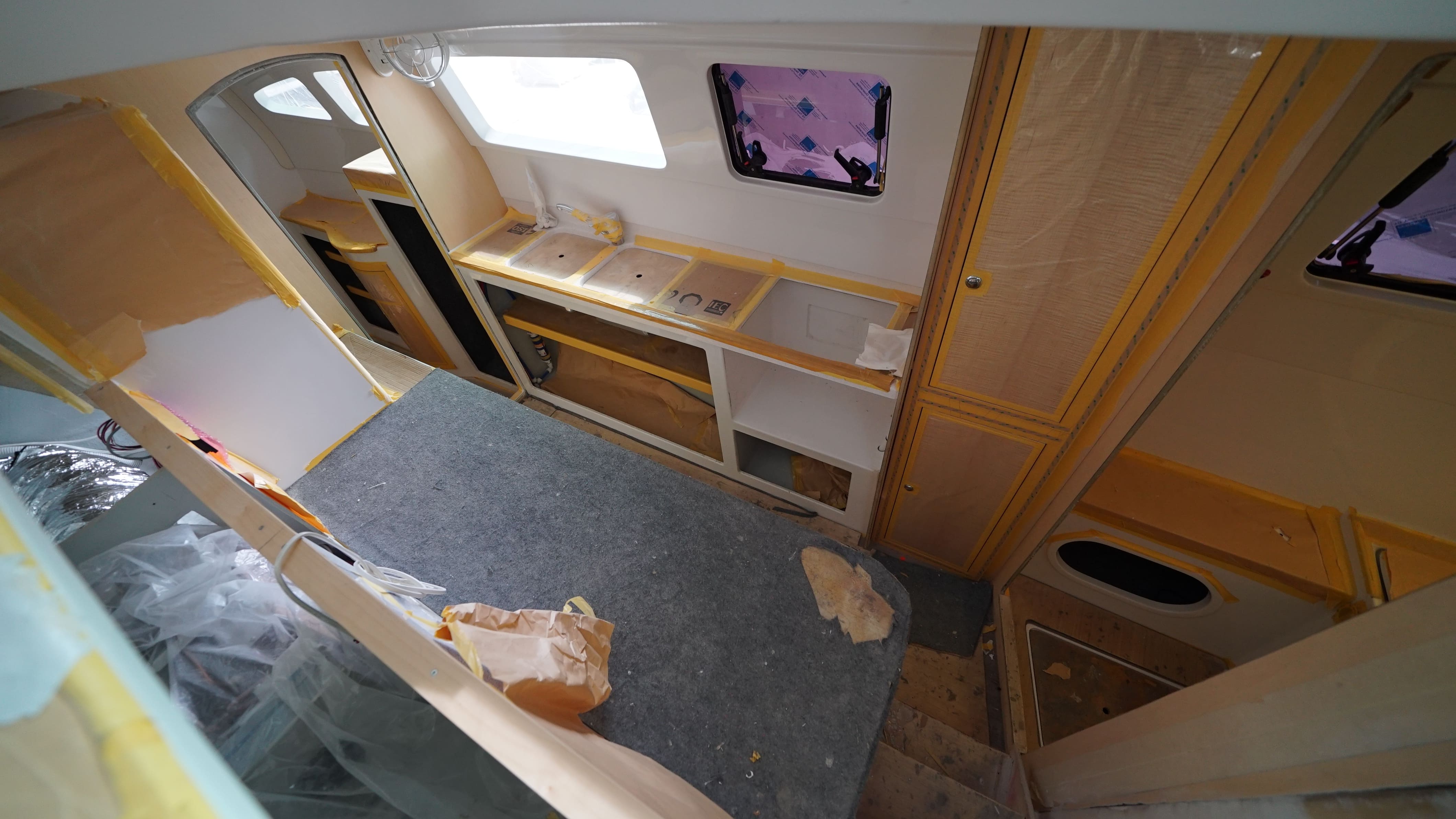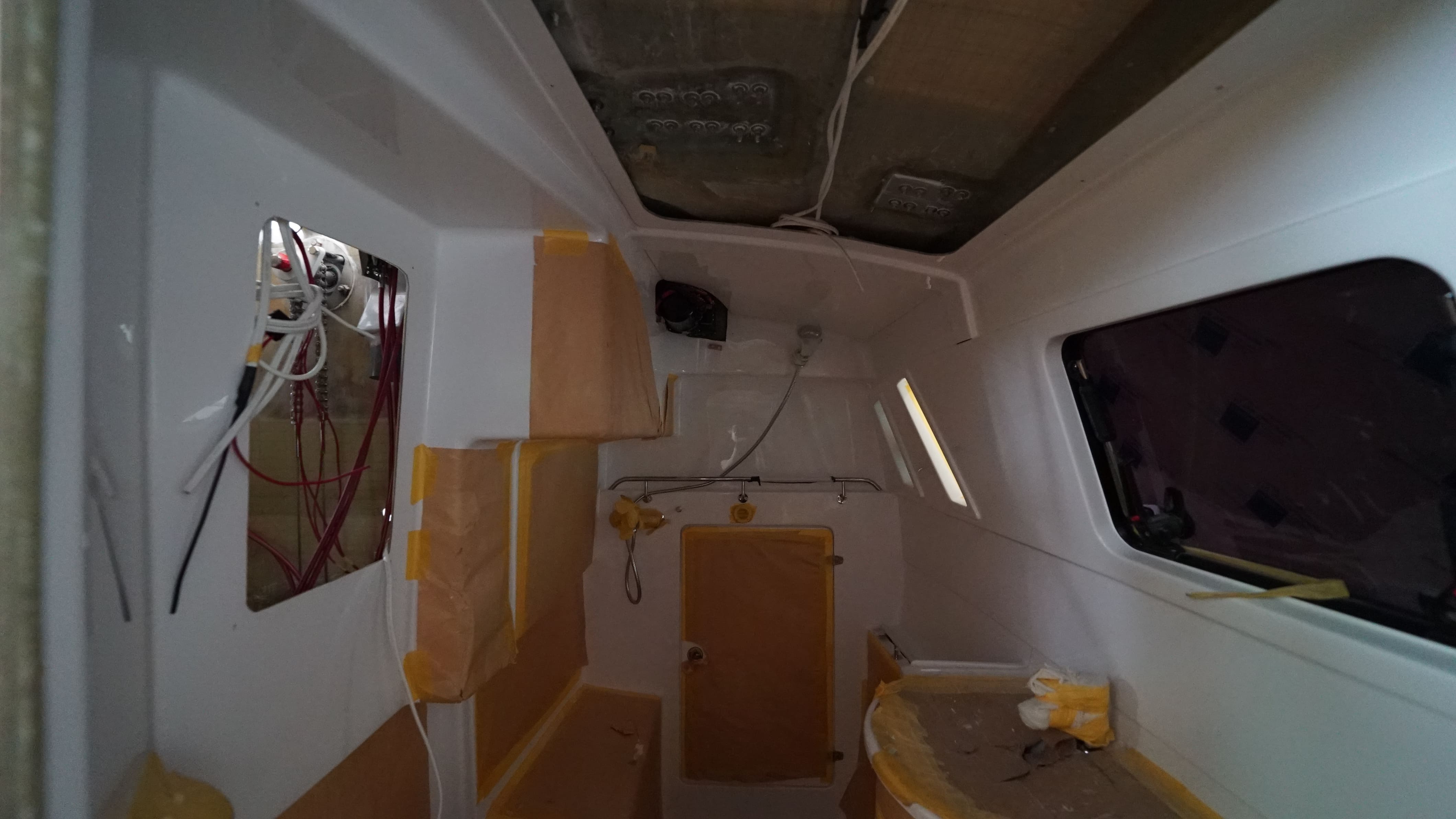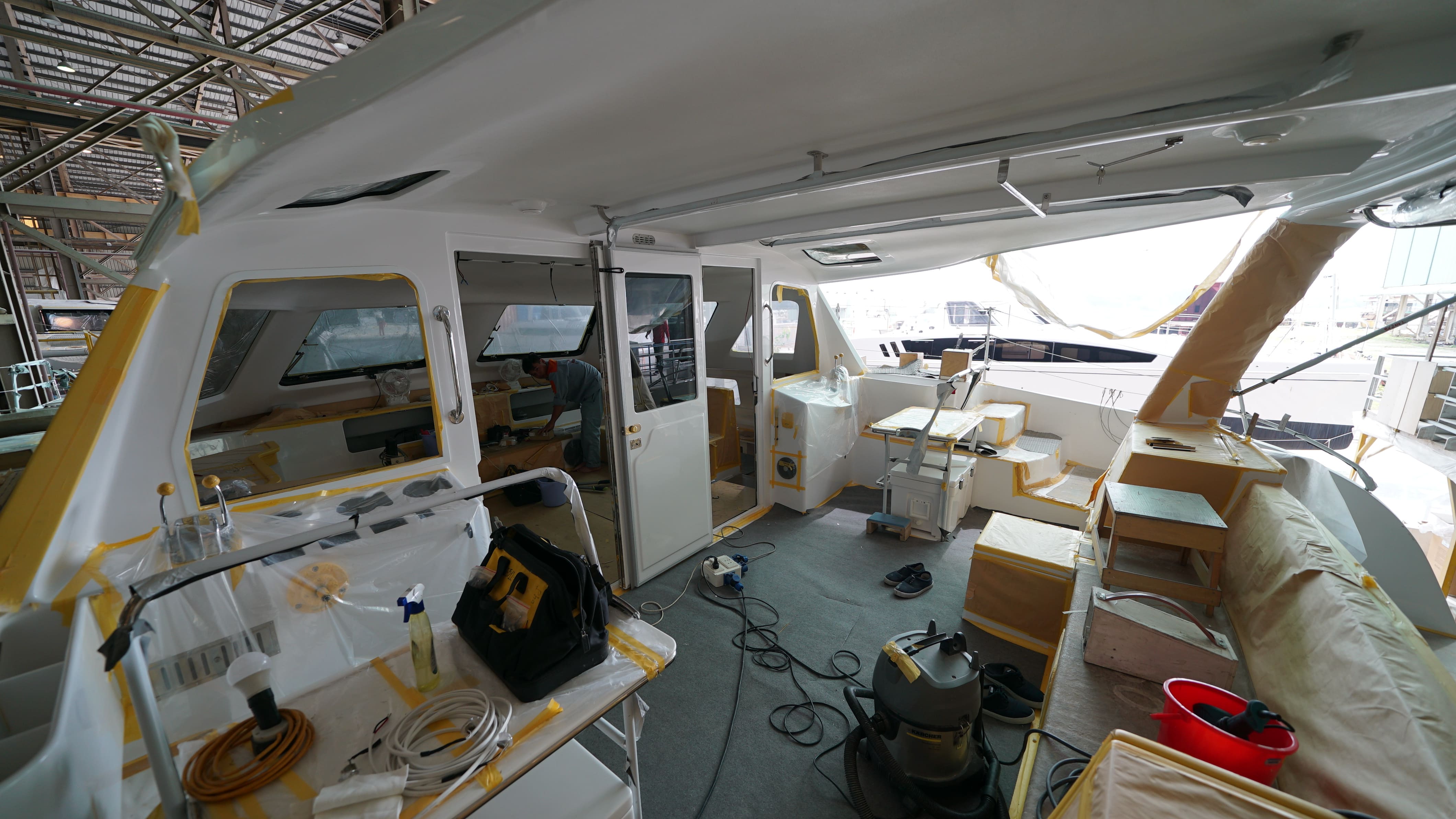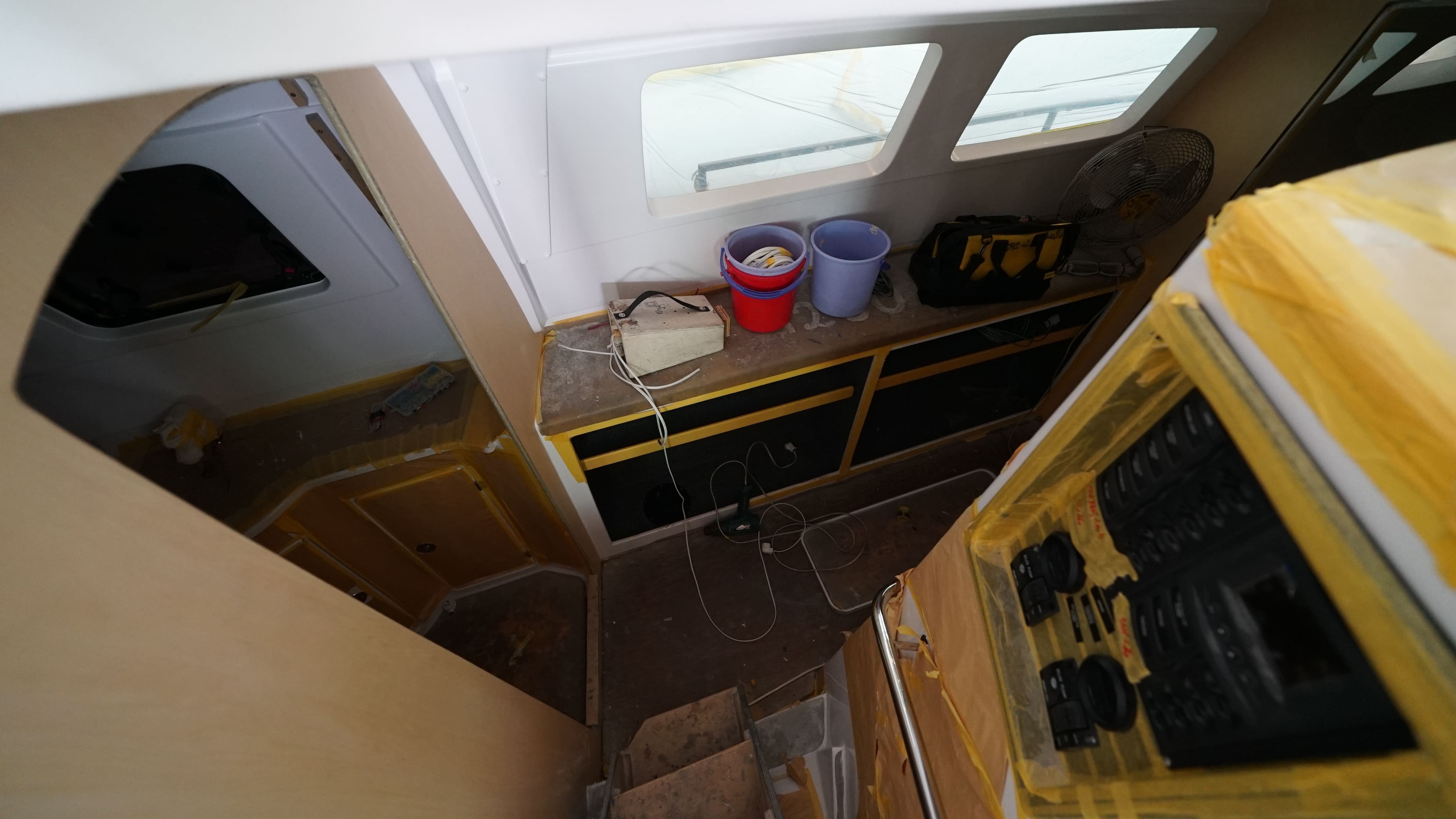 We are now working on the steering (50%), electrical and plumbing systems, LPG (75%), and timber fit-out (75%).
