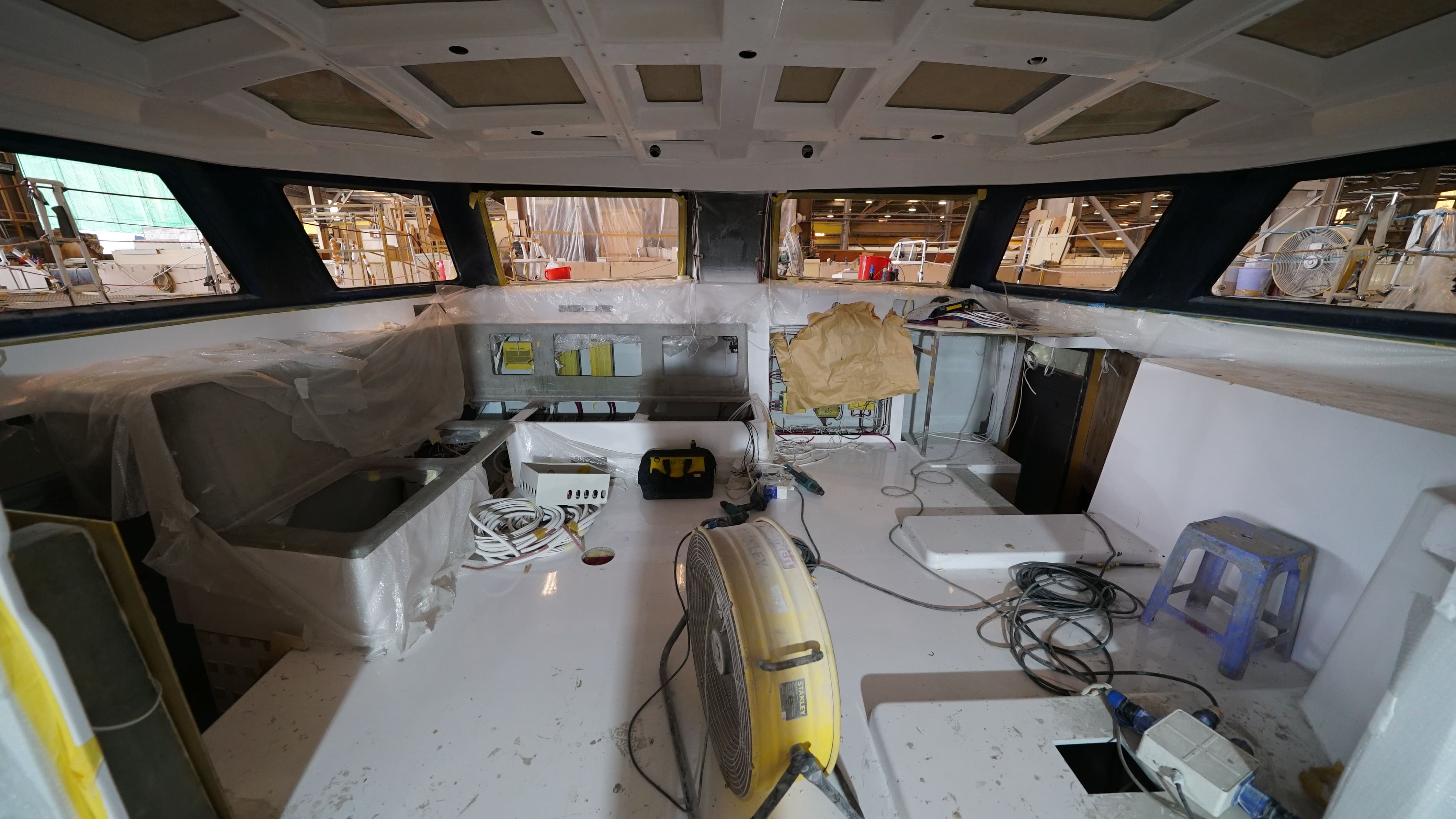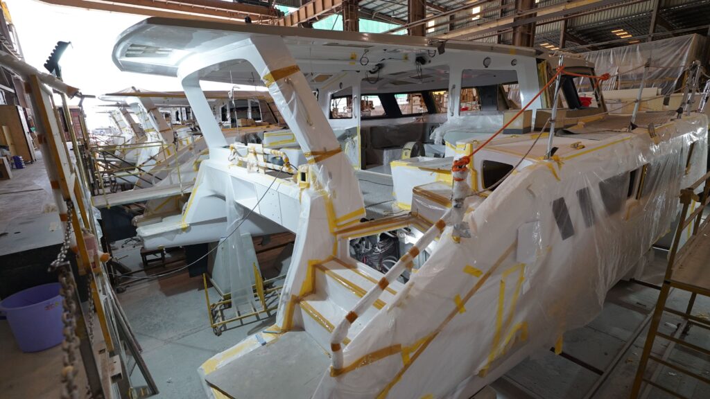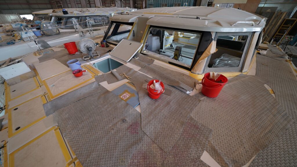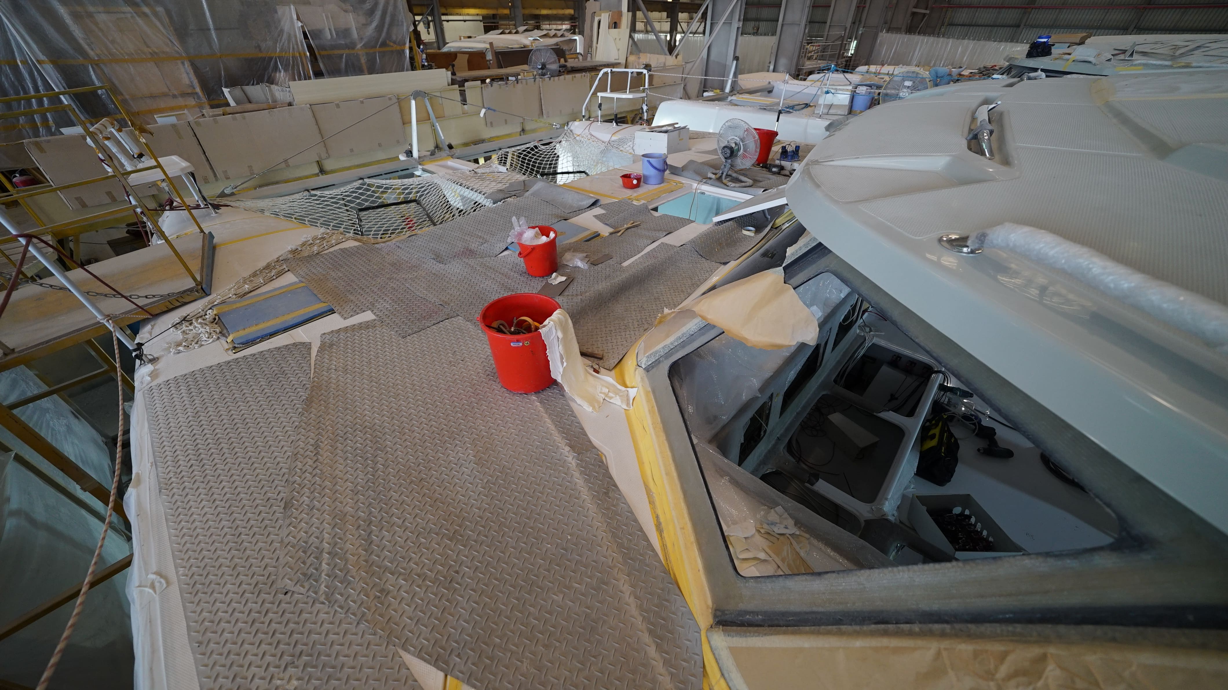Our Production team is currently working on stanchion (75%), windows & hatches (40%), deck hardware (40%), electric (35%), plumbing & LPG (35%), steering (20%), and gelcoat at 85%.