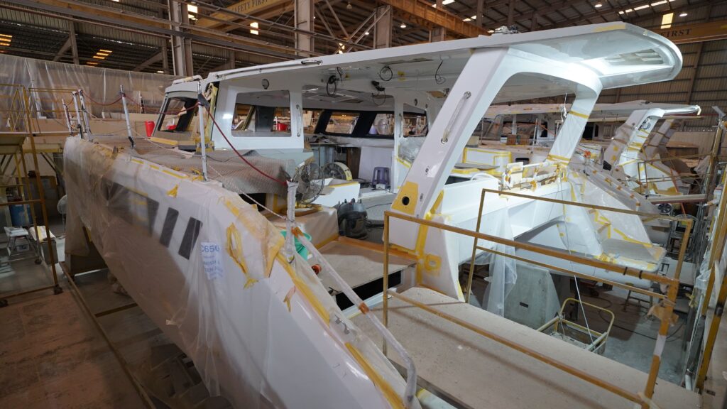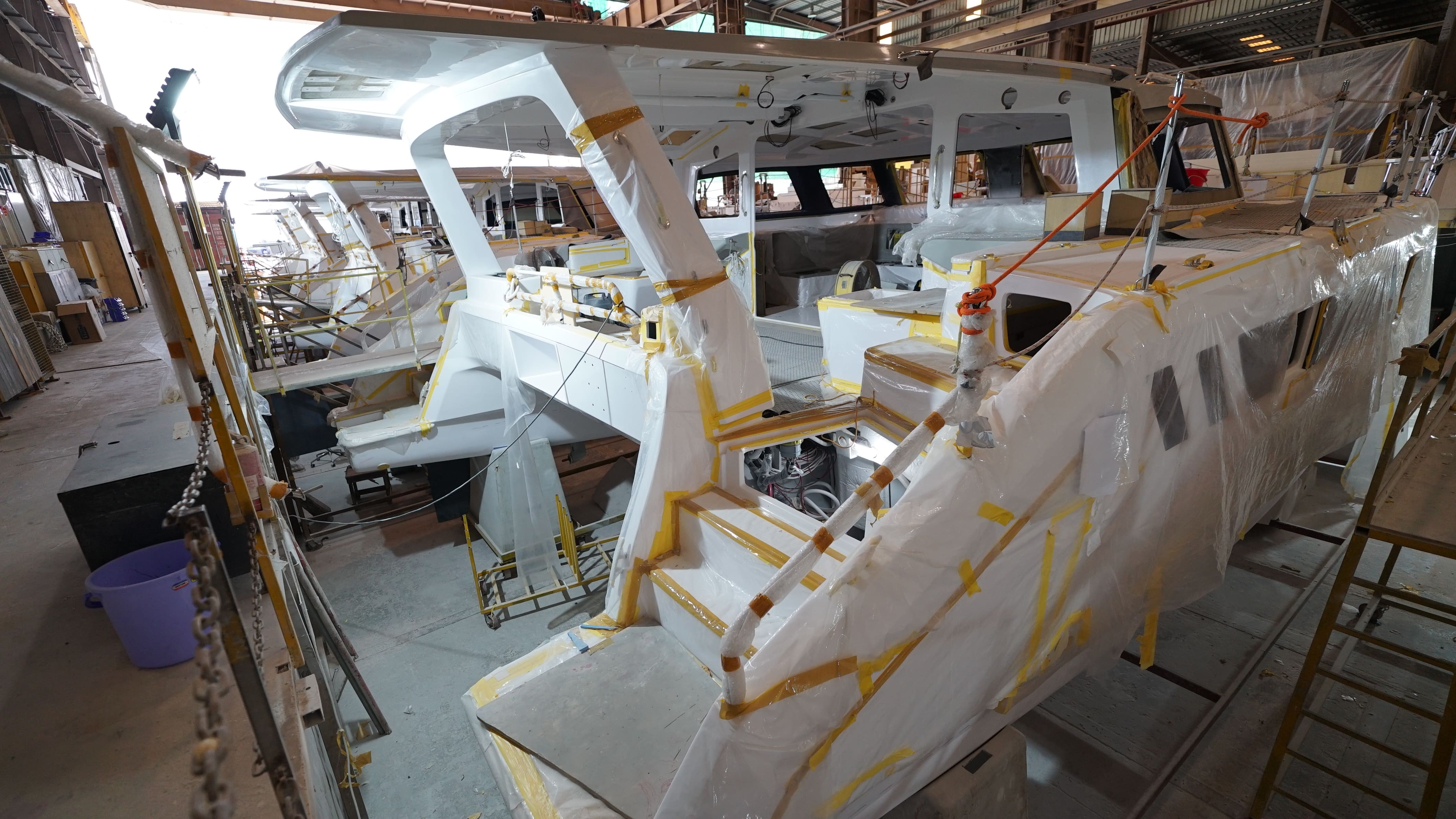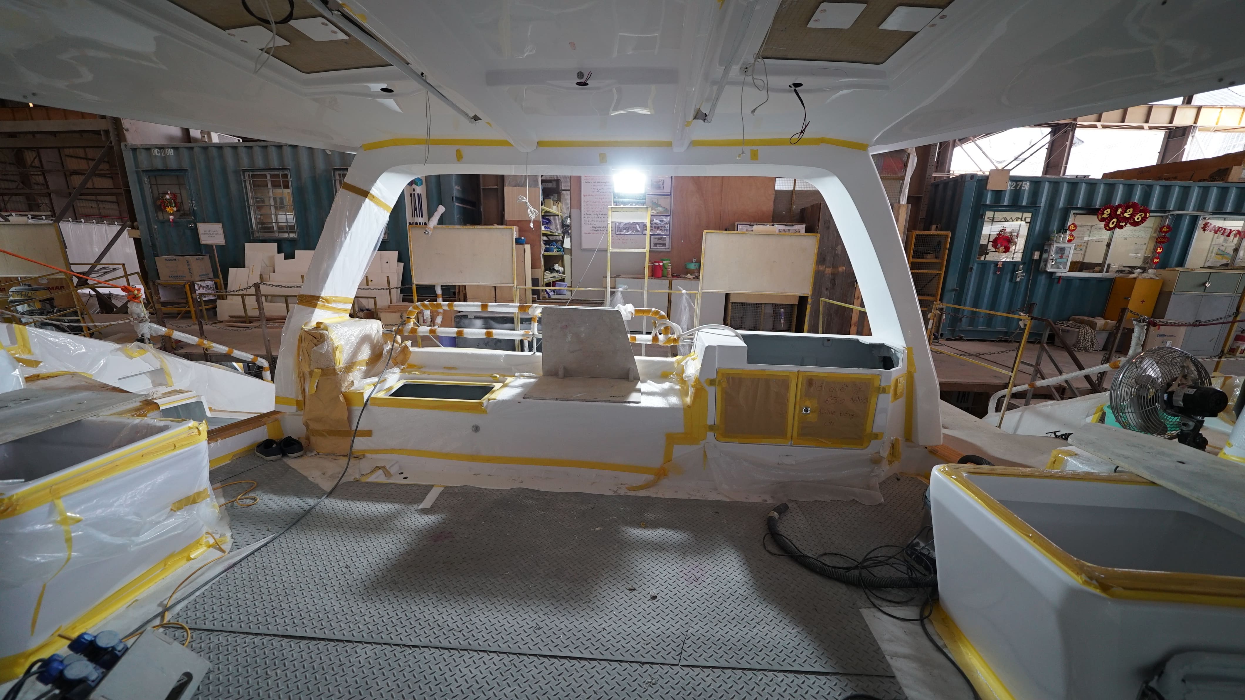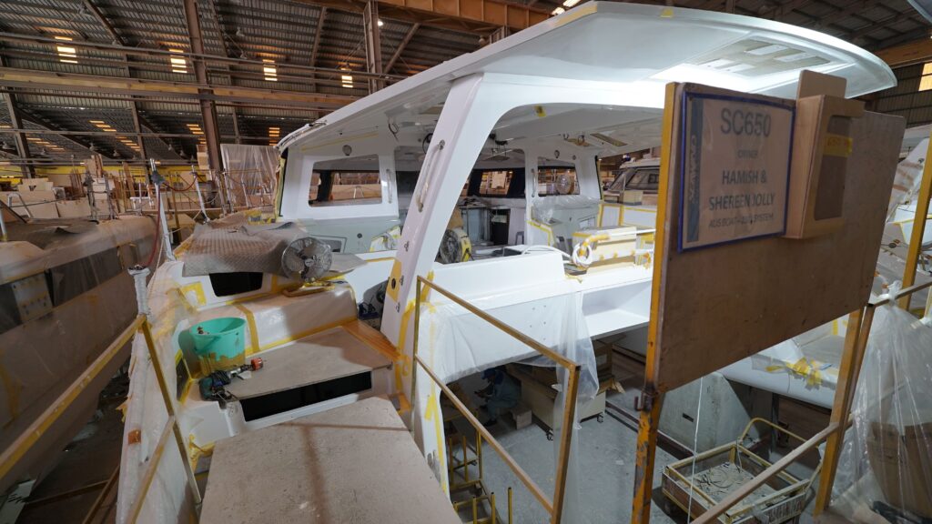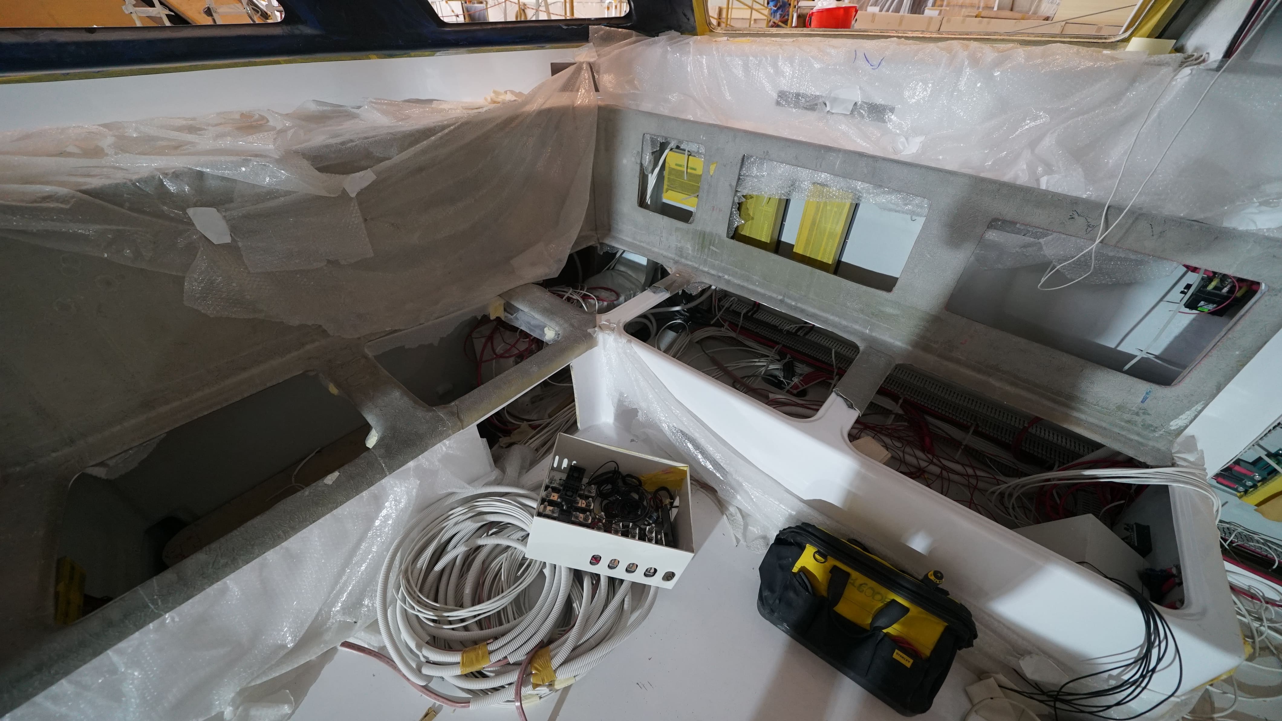 Our Production team is currently working on stanchion (75%), windows & hatches (40%), deck hardware (40%), electric (35%), plumbing & LPG (35%), steering (20%), and gelcoat at 85%.