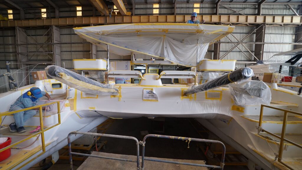 Our Production team is working on deck hardware (90%), steering (70%), plumbing & LPG (50%), electric works (50%), navigation (25%), timber fitout (50%), anti fouling paint, daggerboard, fwd beam, and A-frame.