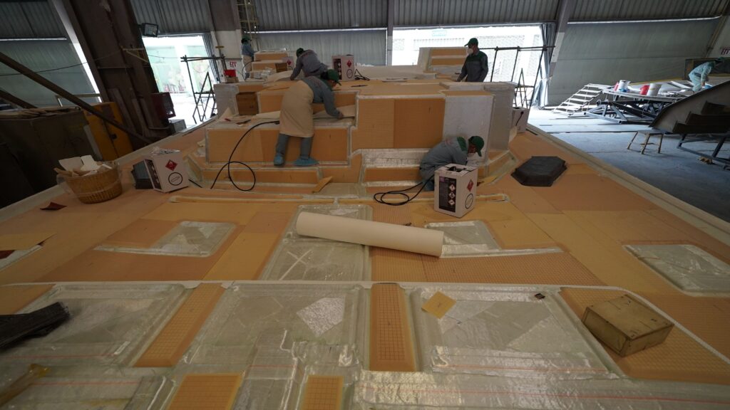 Posted on January 15, 2026January 15, 2026 by updatesProduction Update – Lamination An exciting journey has started. Your boat is making progress in the first stage of production – Lamination. The hull and deck are being steadily constructed in the molds. Our lamination team is carrying out fiberglass and foam lay-up operations.